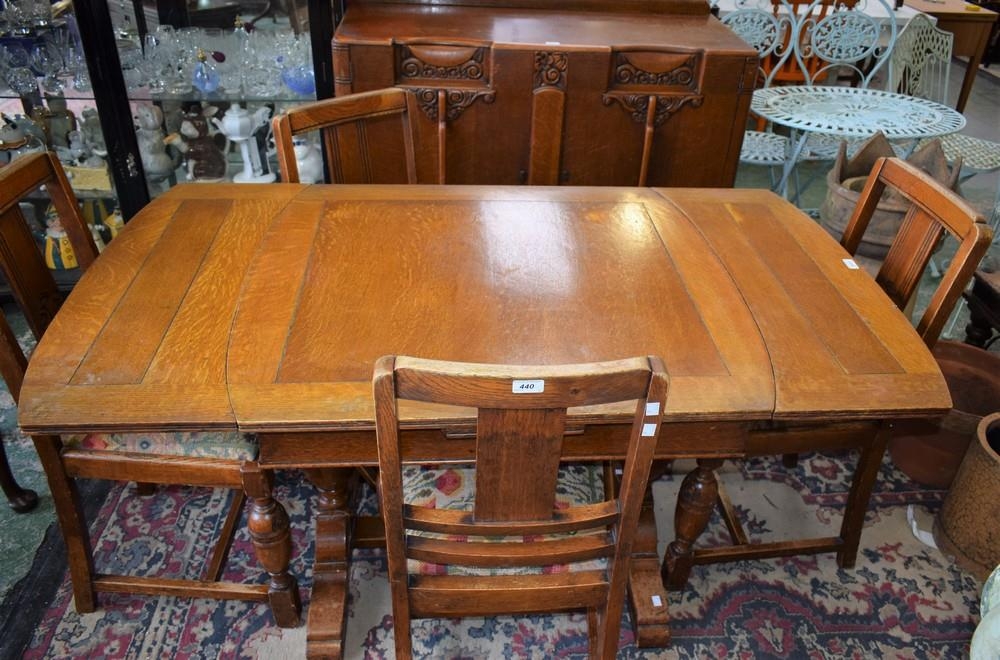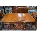 A 20th century oak drawer-leaf dining table; a set of four conforming dining chairs; a similar sideboard (6)