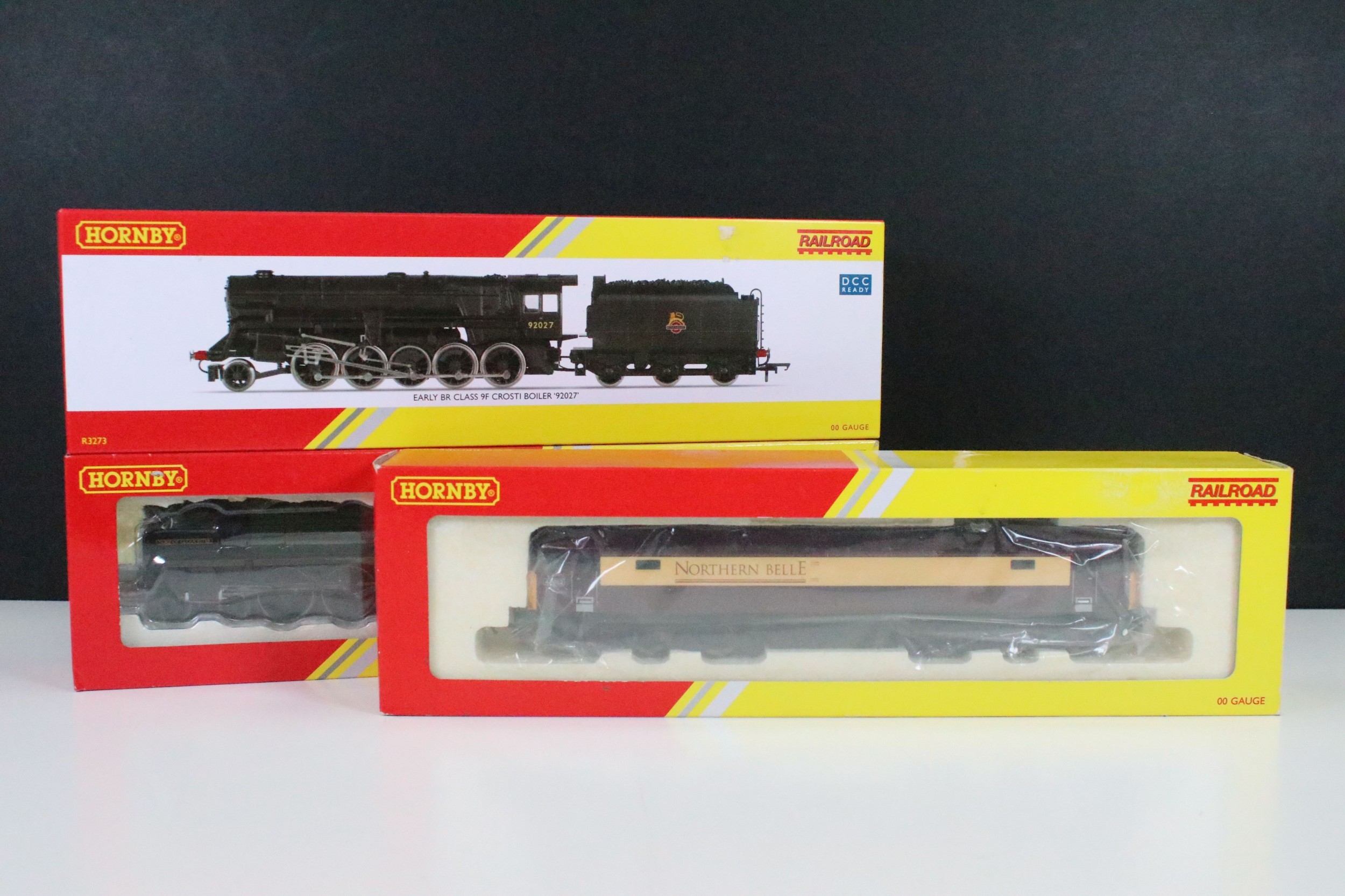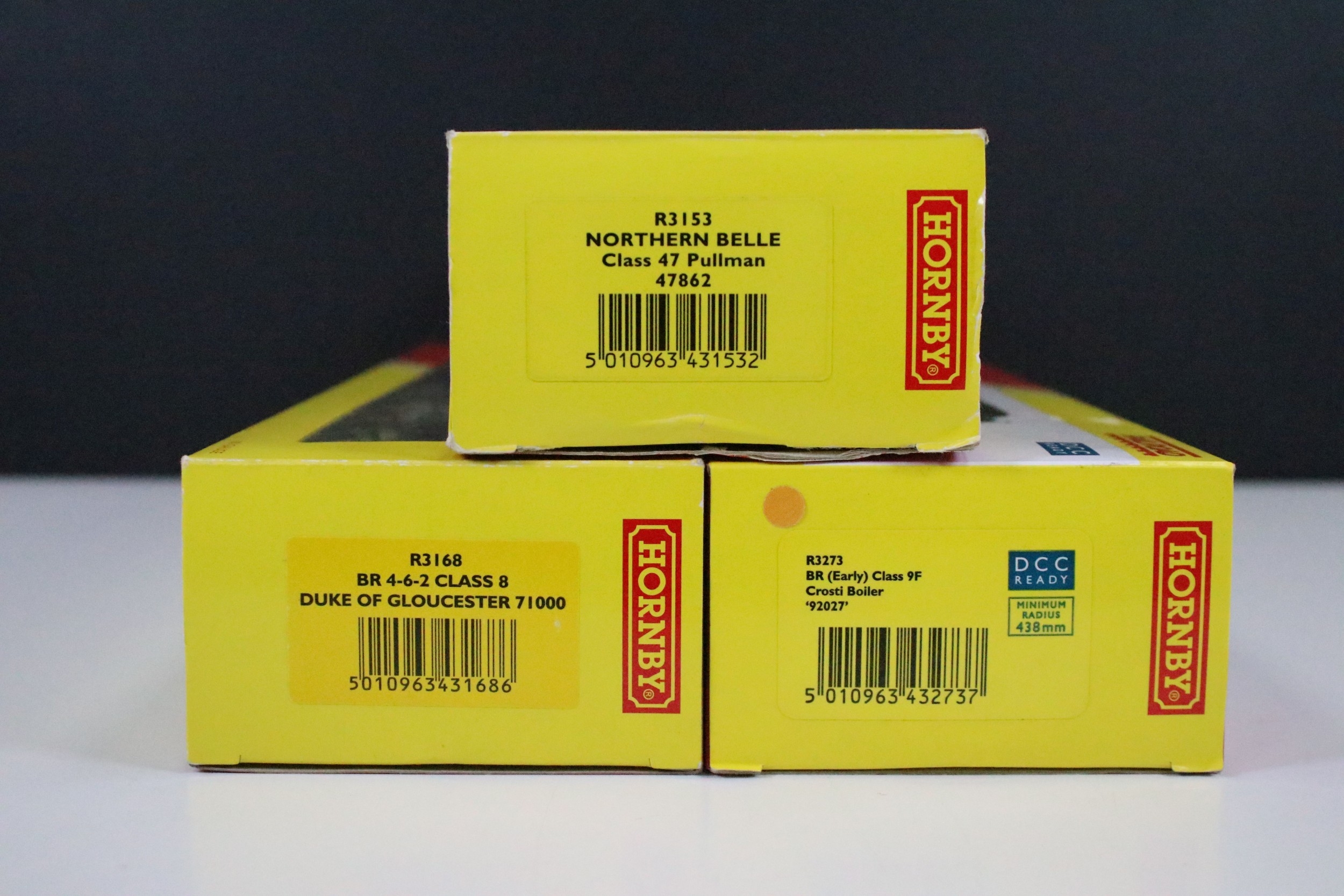 Three boxed Hornby Railroad OO gauge locomotives to include R3153 Northern Belle Class 47 Pullman 47862, R3273 BR Early Class 9F Crosti Boiler 92027 and R3168 BR 4-6-2 Class 8 Duke Of Gloucester 71000