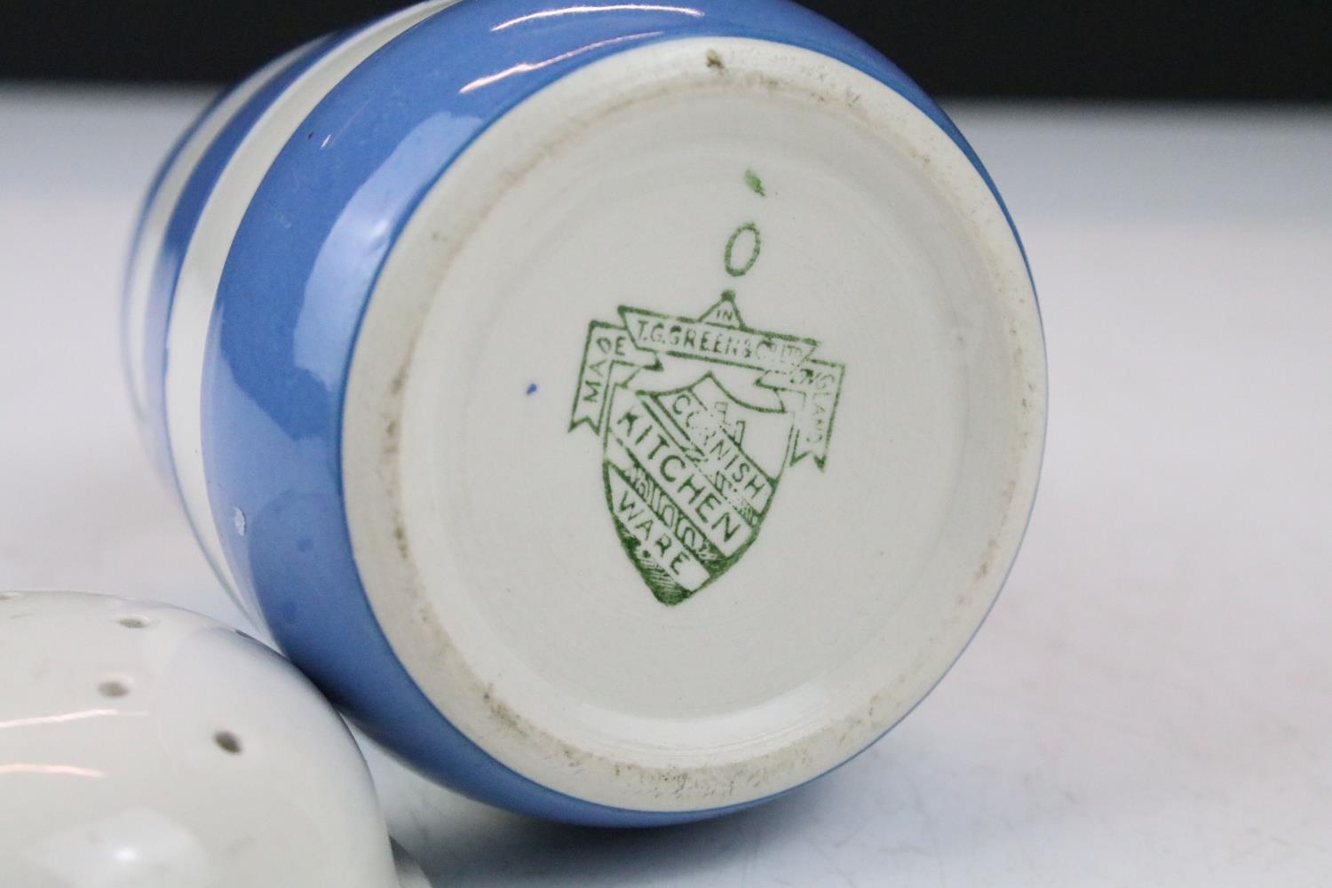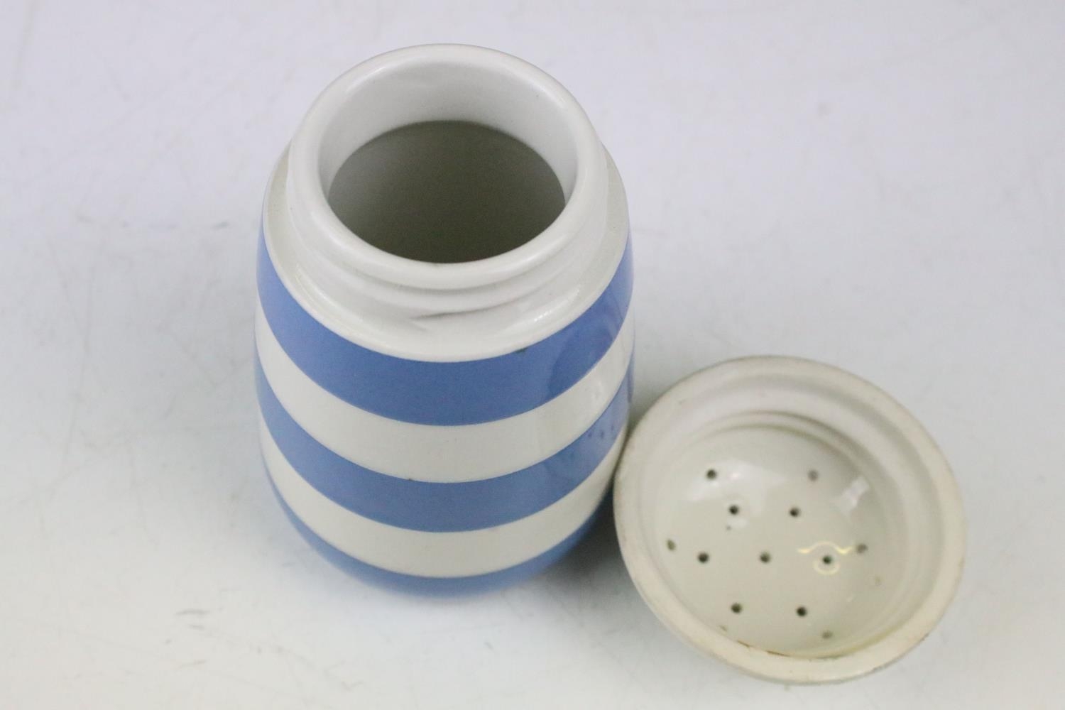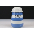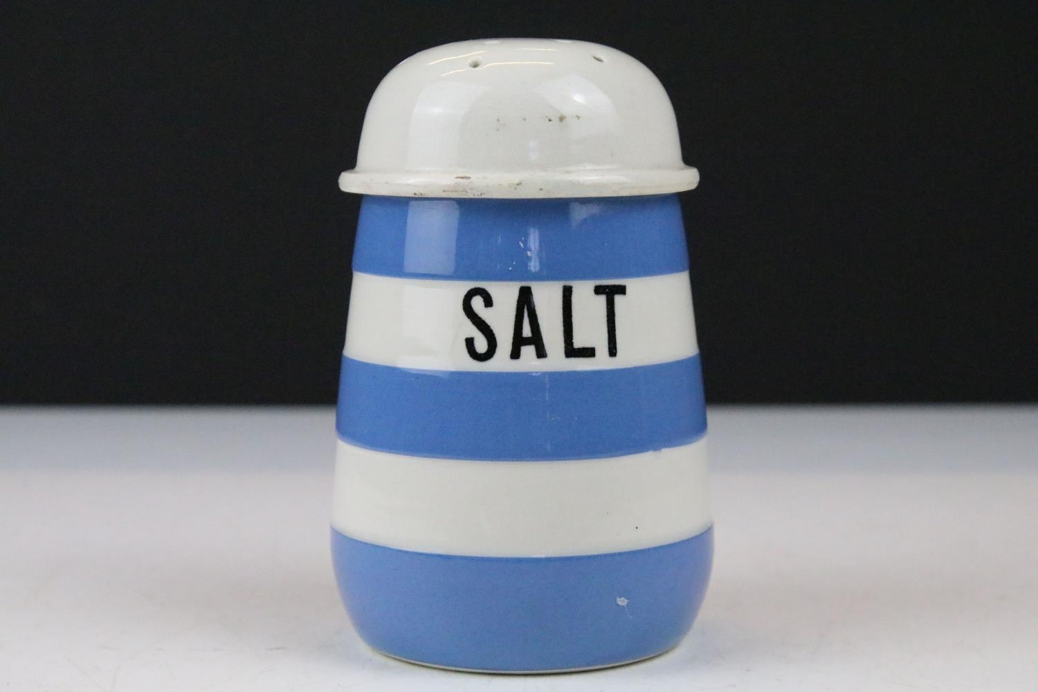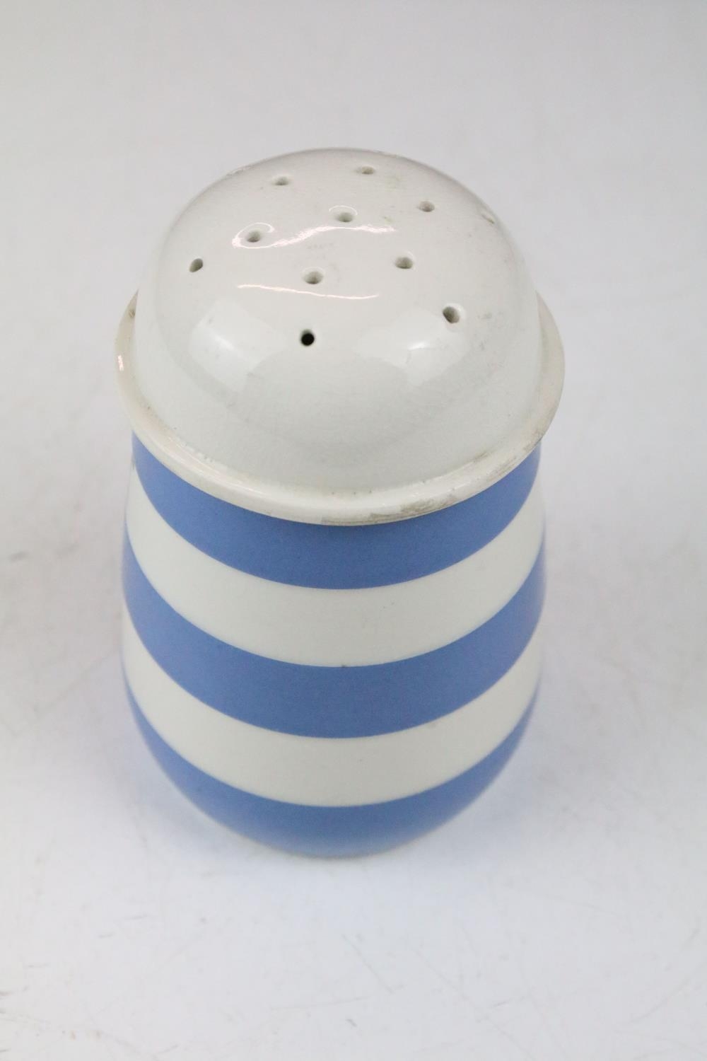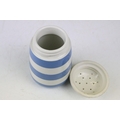 T G Green Cornishware Blue and White ' Salt ' Shaker / Sifter, green shield mark to base, 13cm high