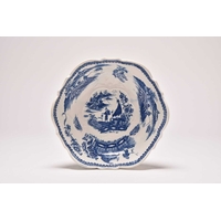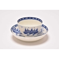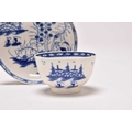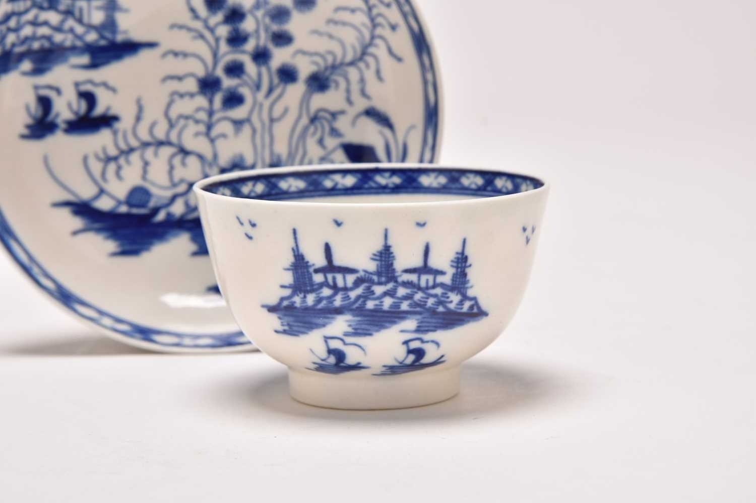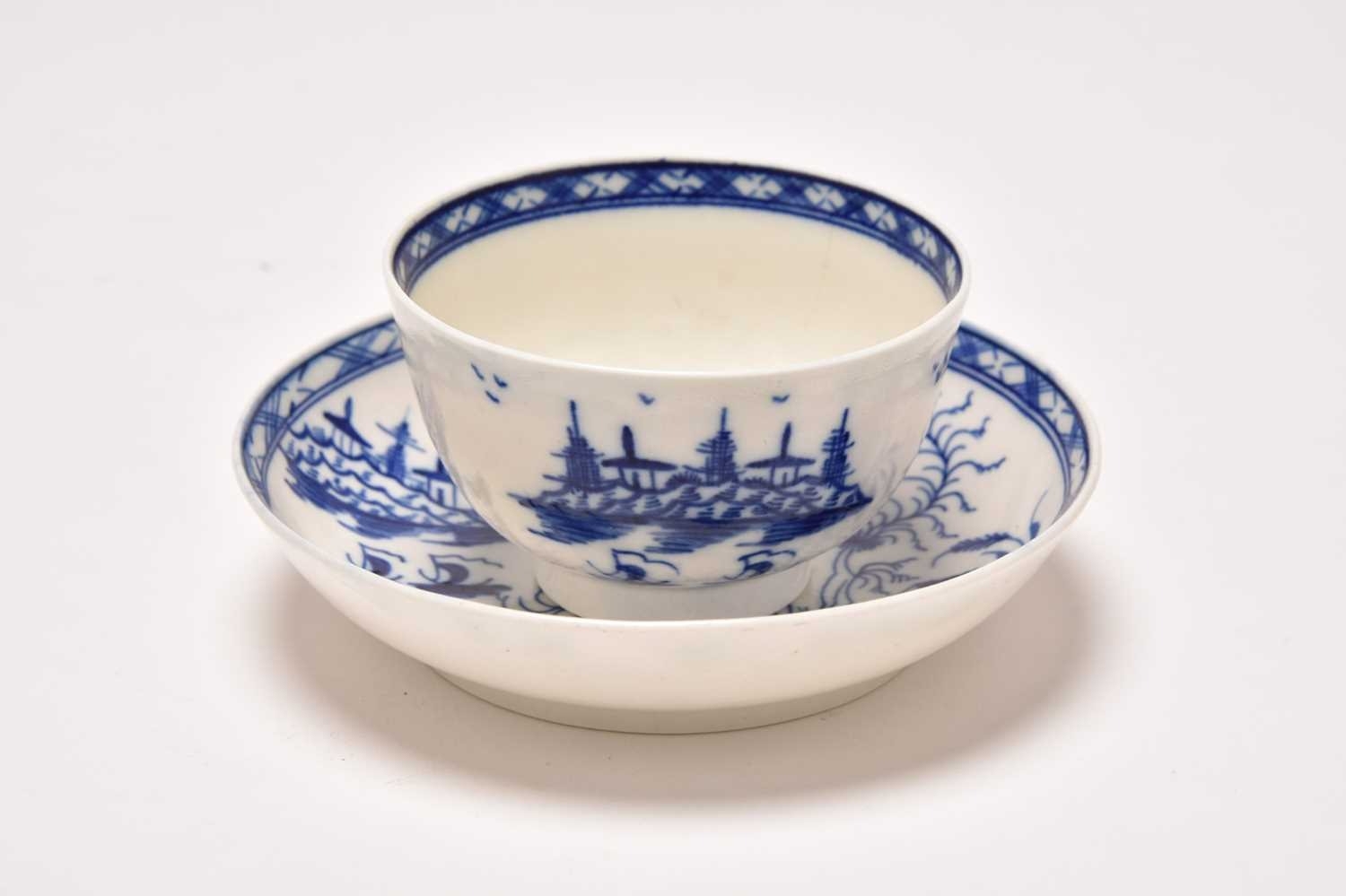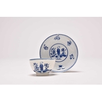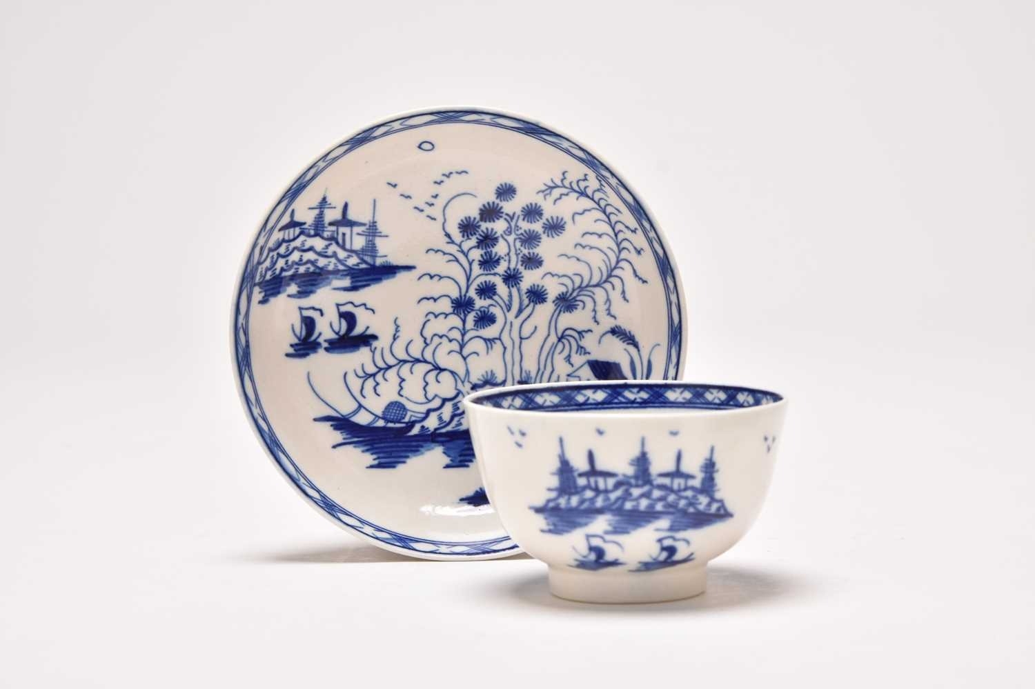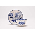 An uncommon Caughley 'Rock Strata Island' tea bowl and saucer, circa 1776-90, painted in underglaze blue with the island, three trees and a house, painted S mark, saucer 12cm diameter (2) (slight hairline to tea bowl) Provenance: David Waterhouse Collection. DMW no. 99. Condition:Descending hairline to the tea bowl with a sliver of associated loss of glaze. Otherwise good.