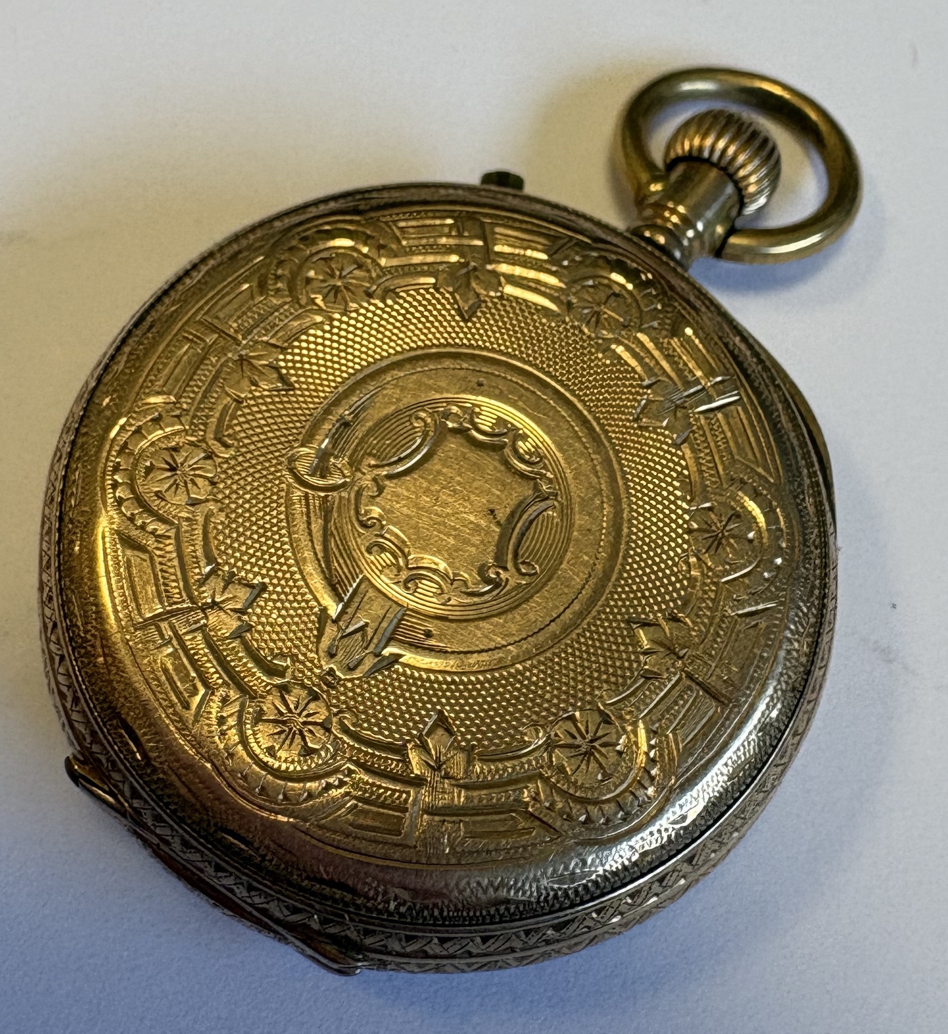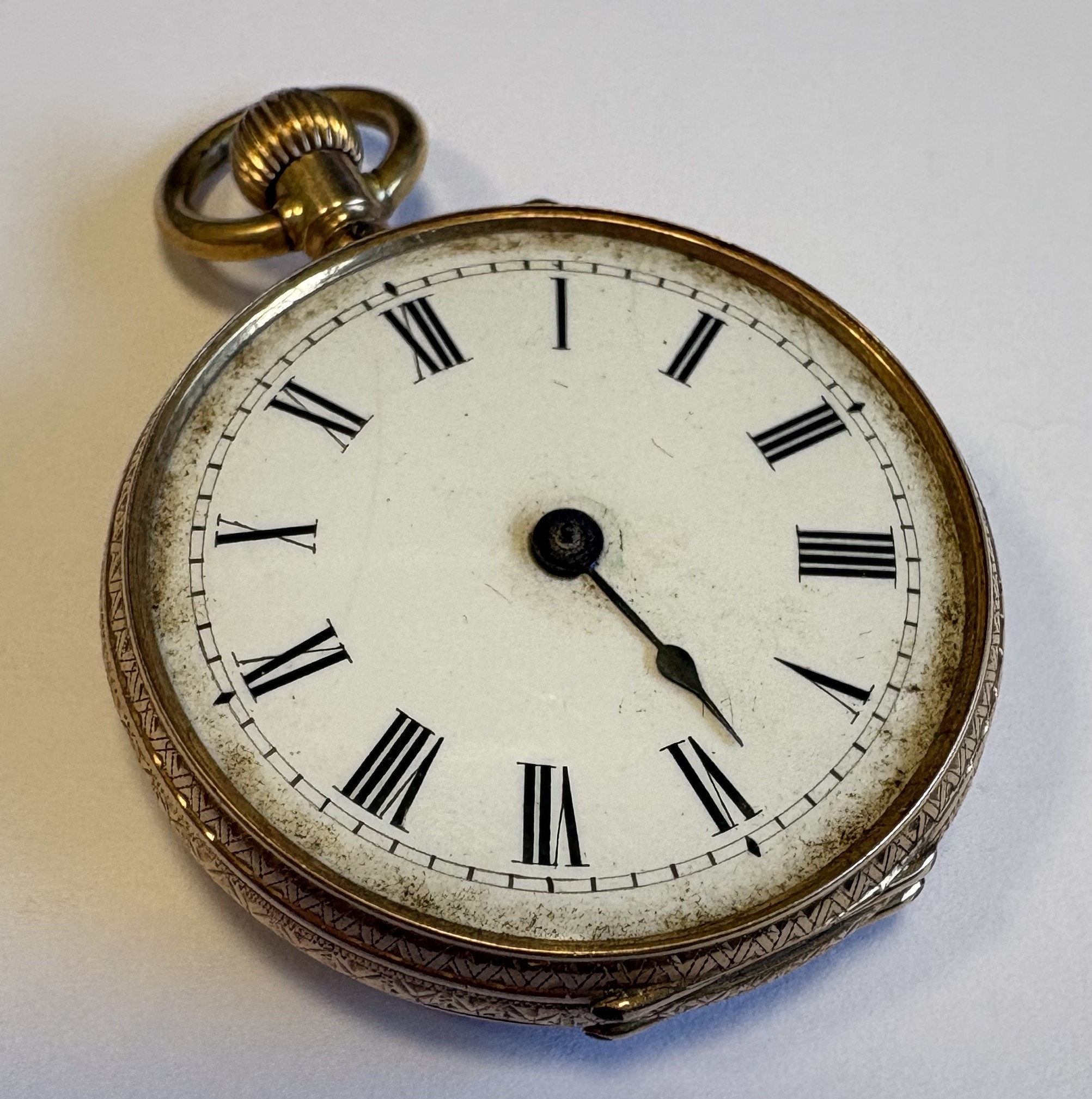 A 14 carat gold fob watch with white enamelled dial. Approx. 28 grams. Est. £80 - £120.