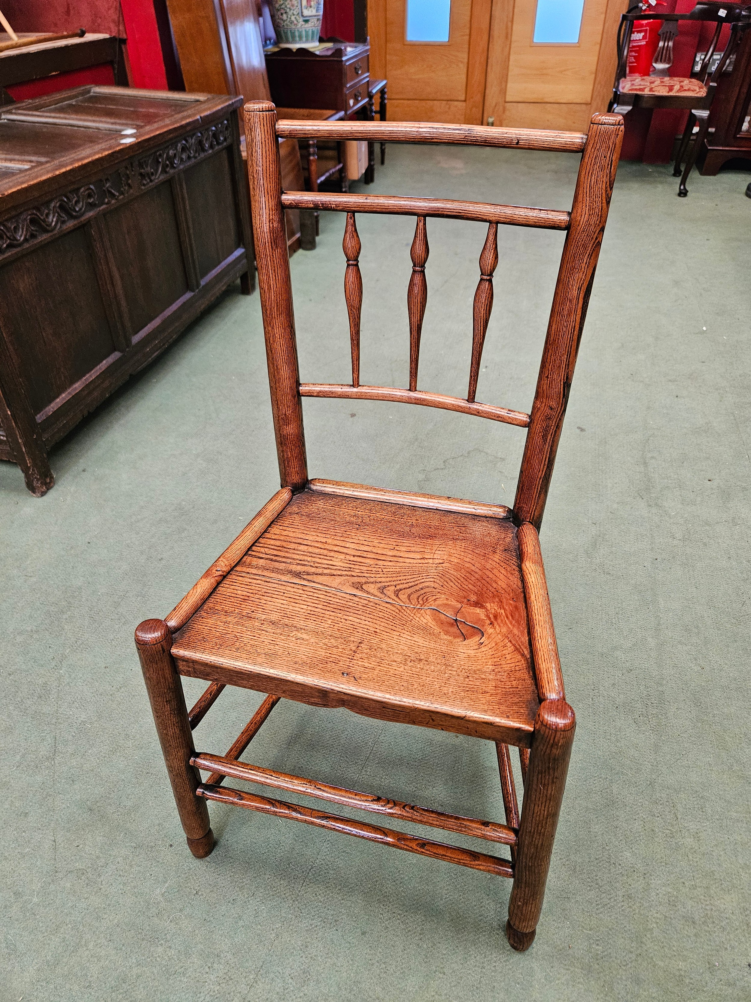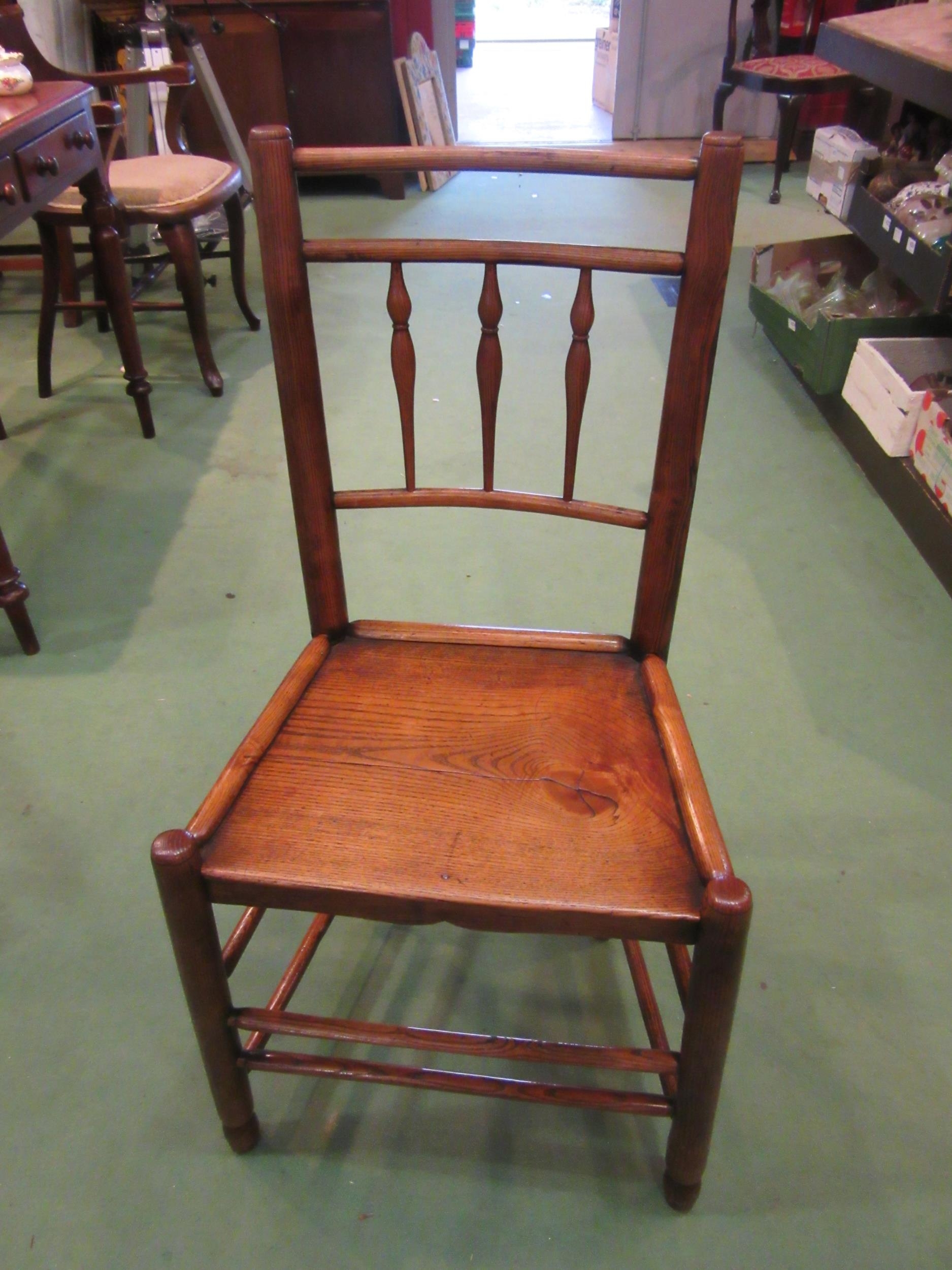 A Northwest 18th Century elm chair with turned spindle back rest over a flat seat