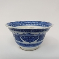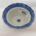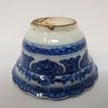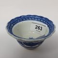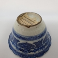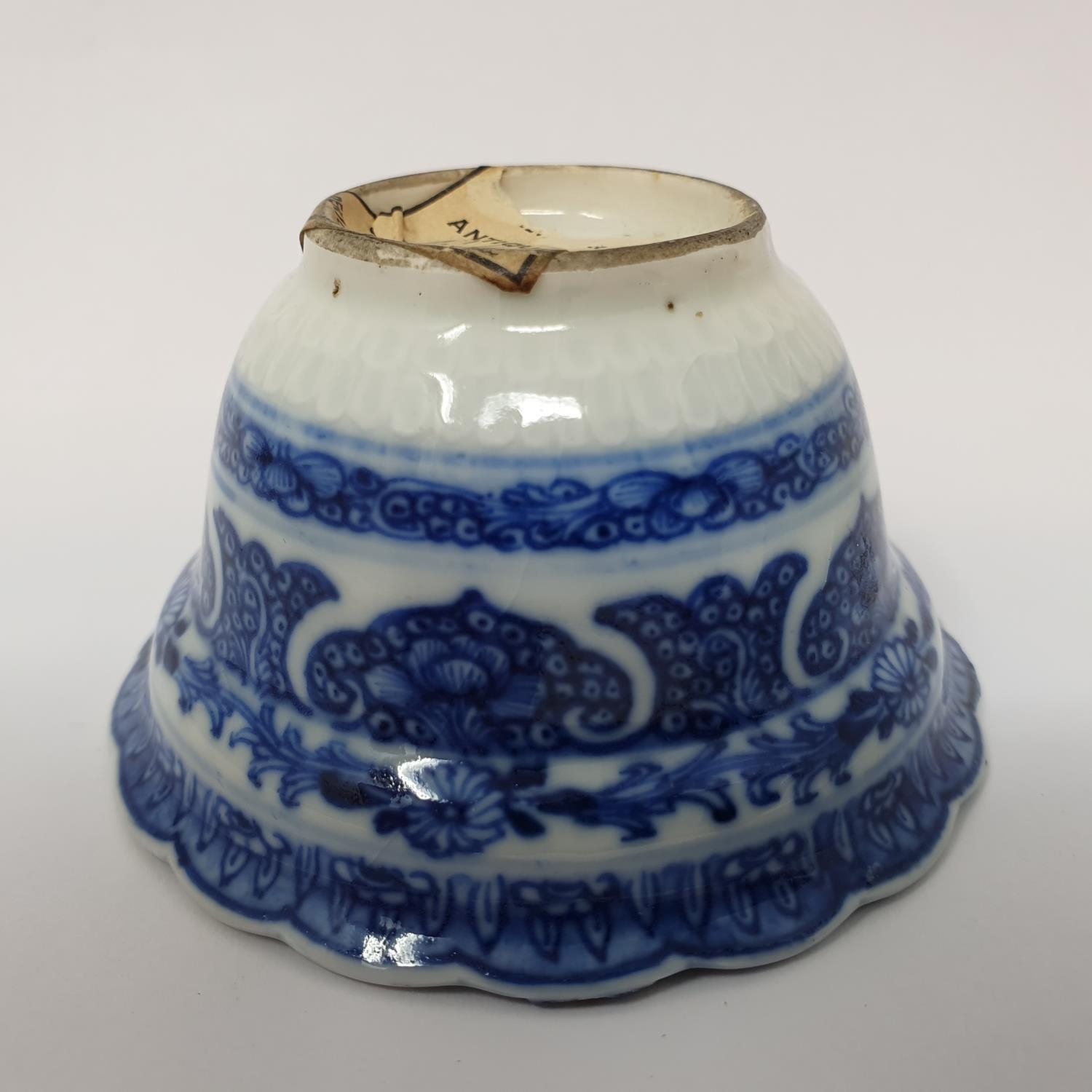 An 18th century Chinese blue and white tea bowl, with scalloped border with hand painted and moulded decoration, the underside with a paper label