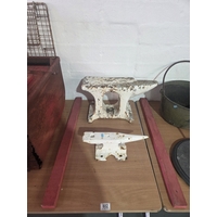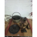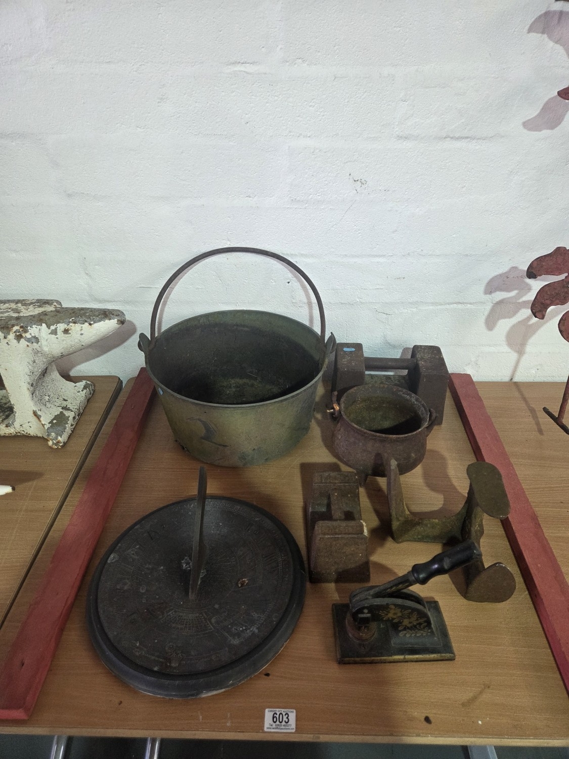 A brass jam pot, weights, sundial, cast iron seal press and a cast iron cauldron