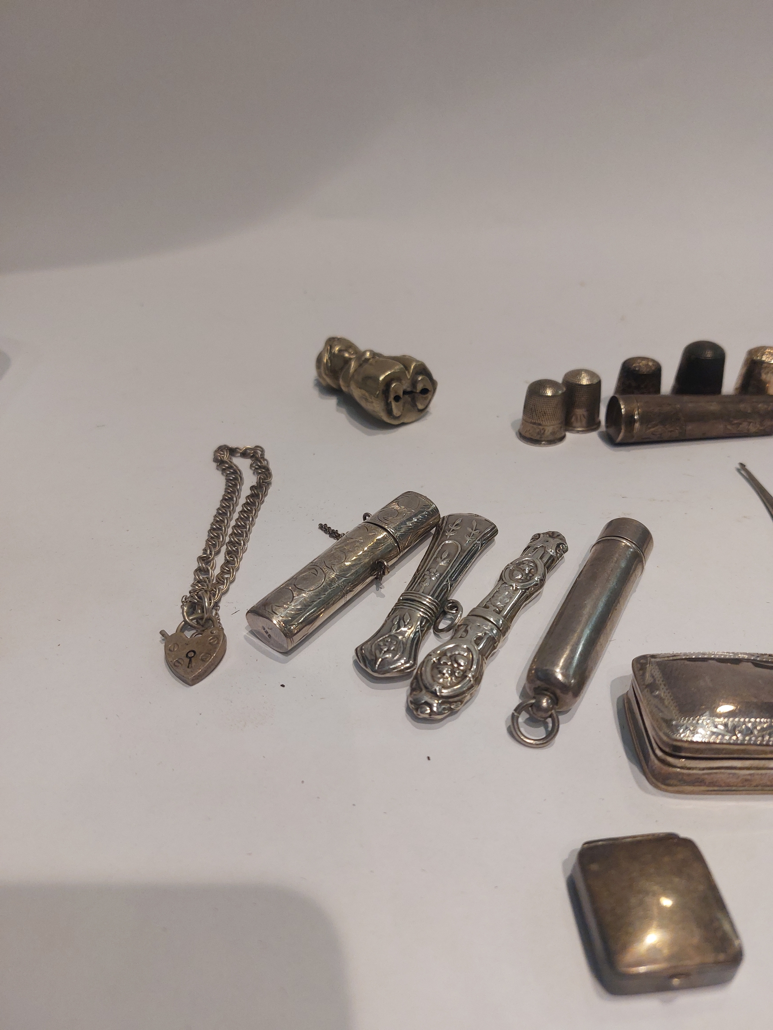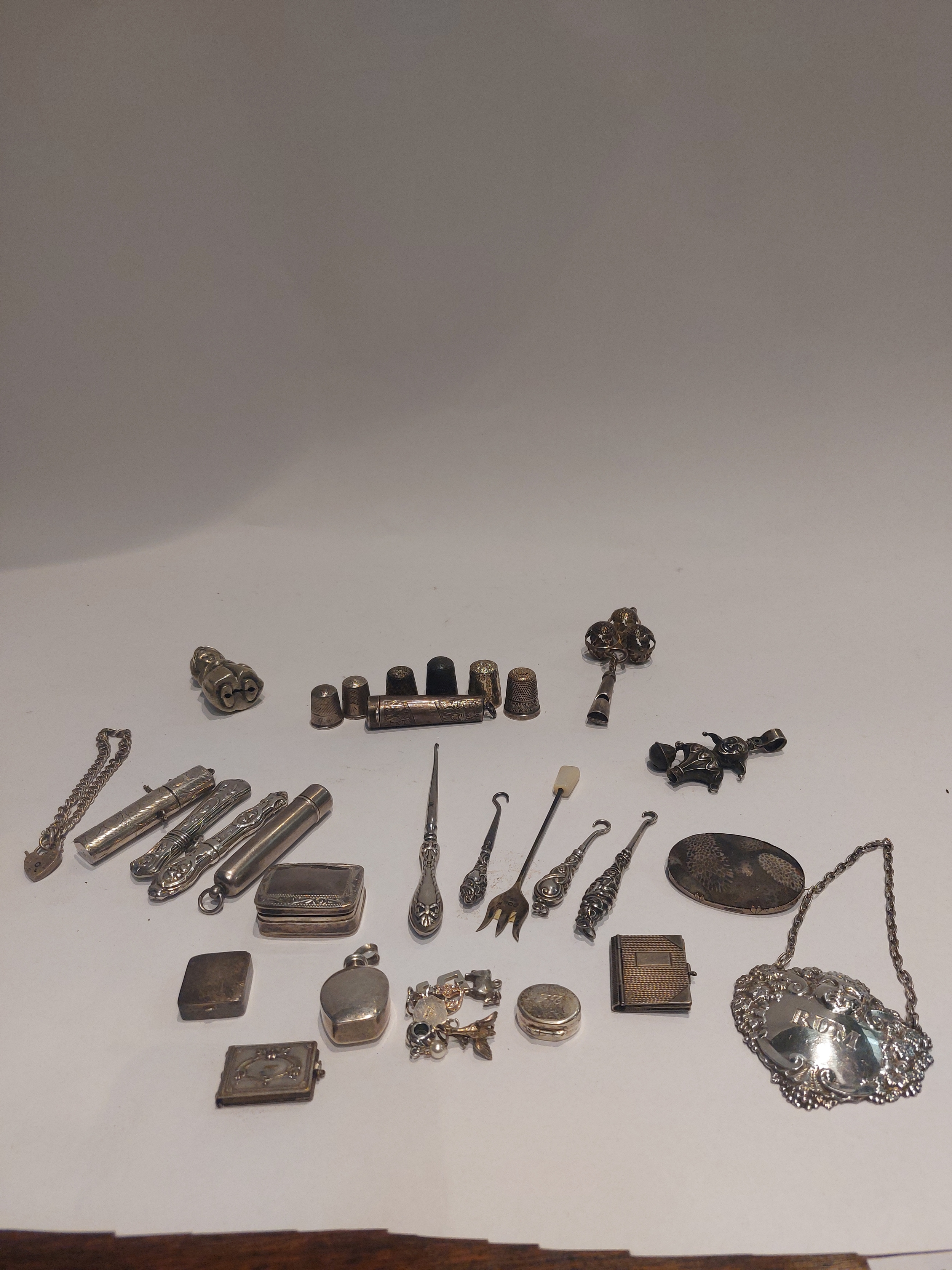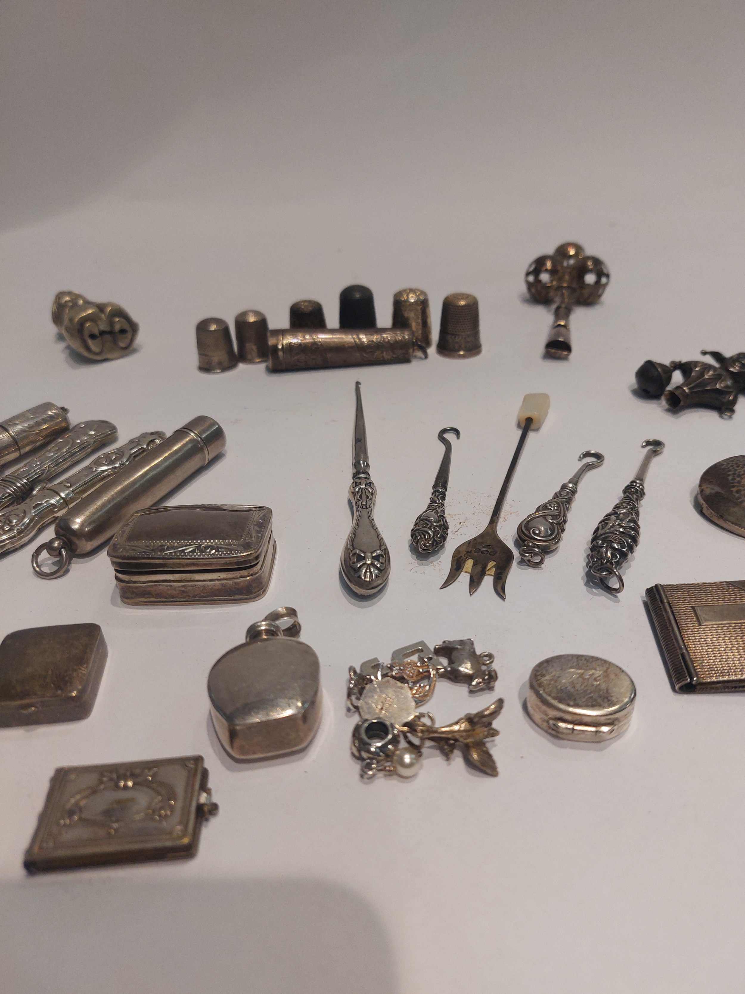 A collection of silver, 925 and white metal; thimbles, needle cases, button hooks, etc.