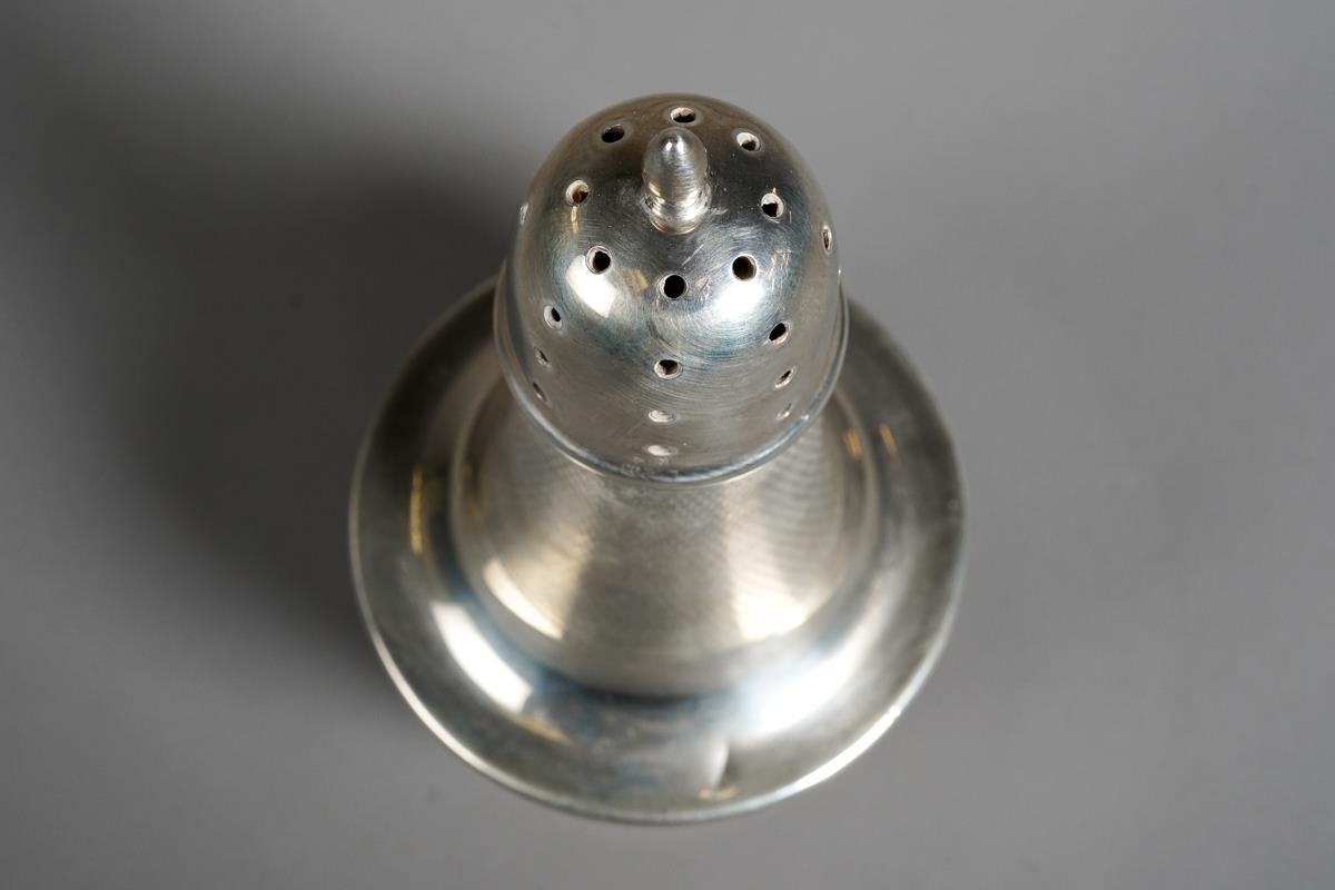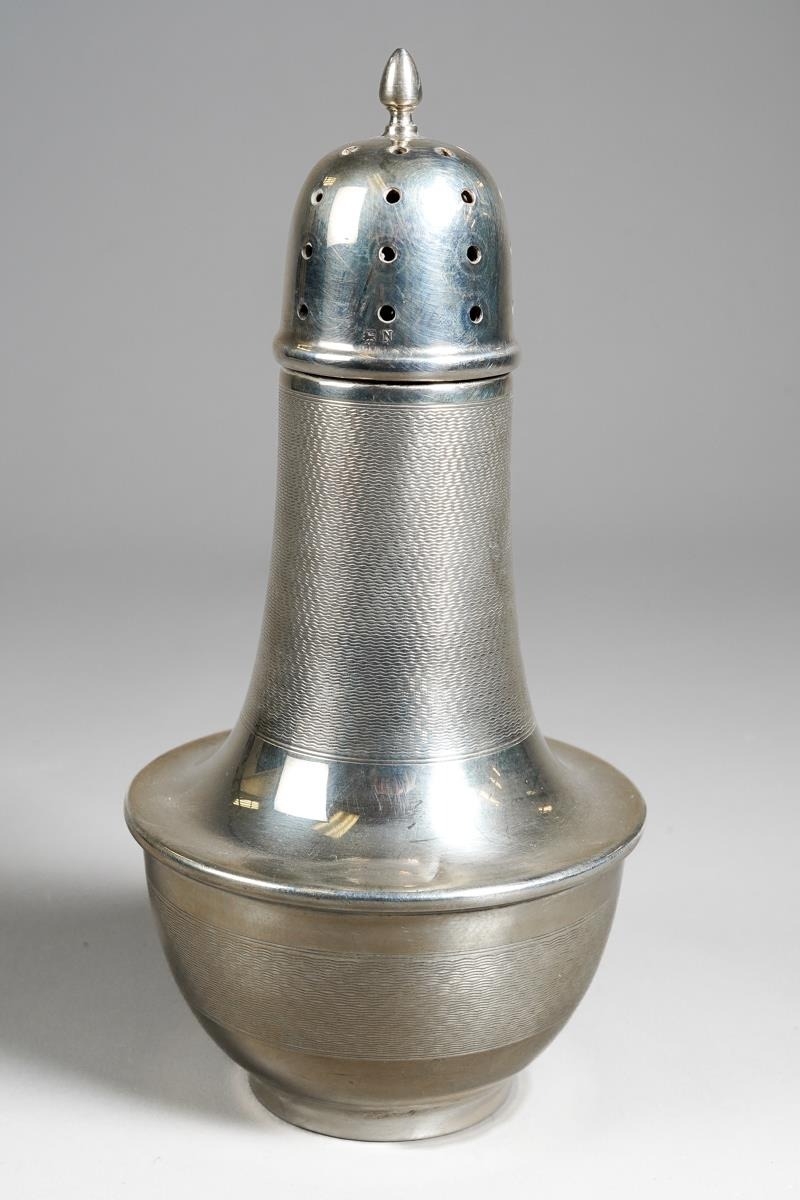 A George VI silver sugar caster of baluster form with engine turned decoration, plastic lined, maker Joseph Gloster Ltd, Birmingham 1937 gross weight 4.44ozt, 138.1 grams (1)