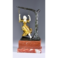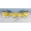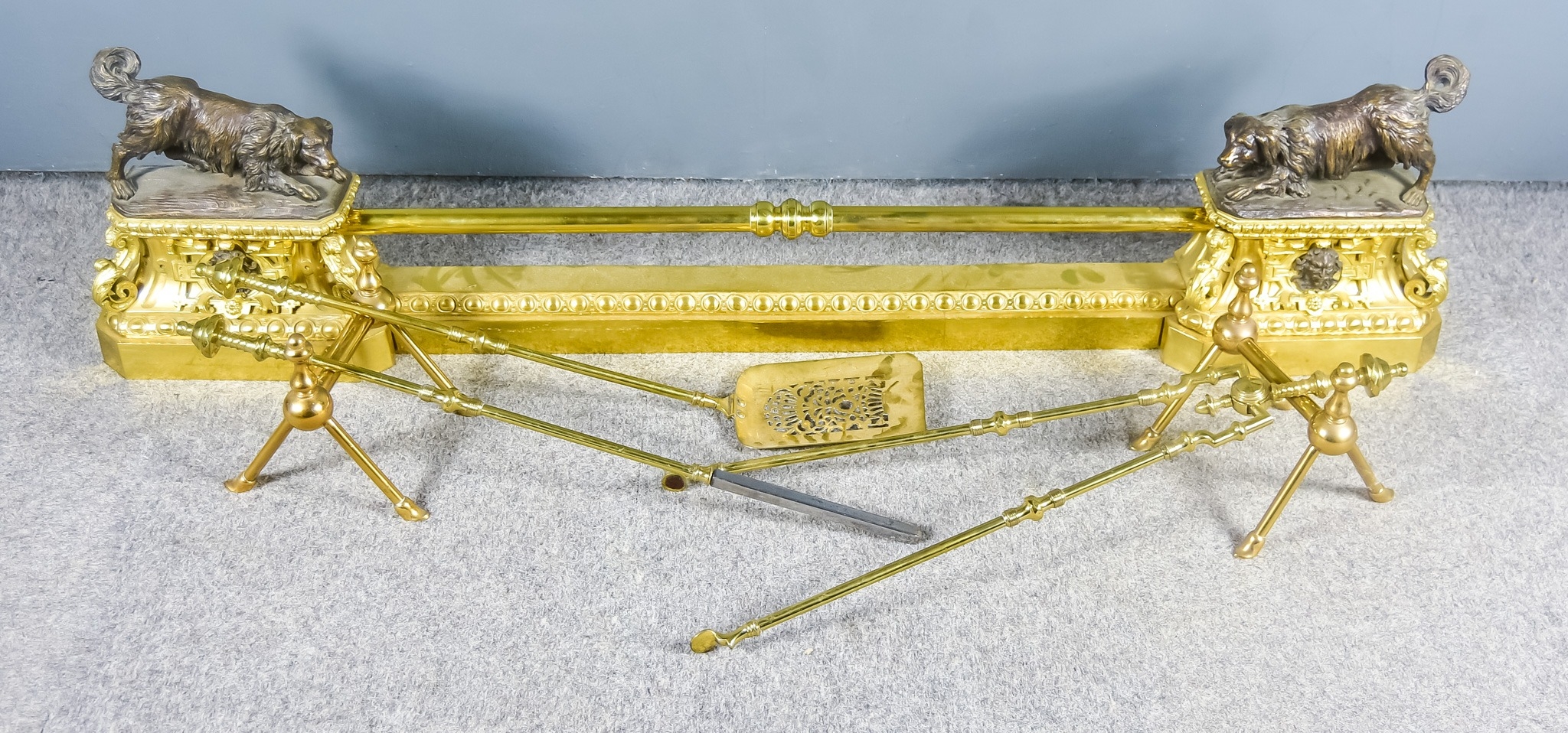 A Late 19th/Early 20th Century Brass and Bronze Fender, with adjustable chenet, surmounted by twin crouching retrievers over mask cartouche, on plinth base, 56ins wide x 13.75ins high, and a set of three cast brass fire implements with ball pattern finials and andirons for same