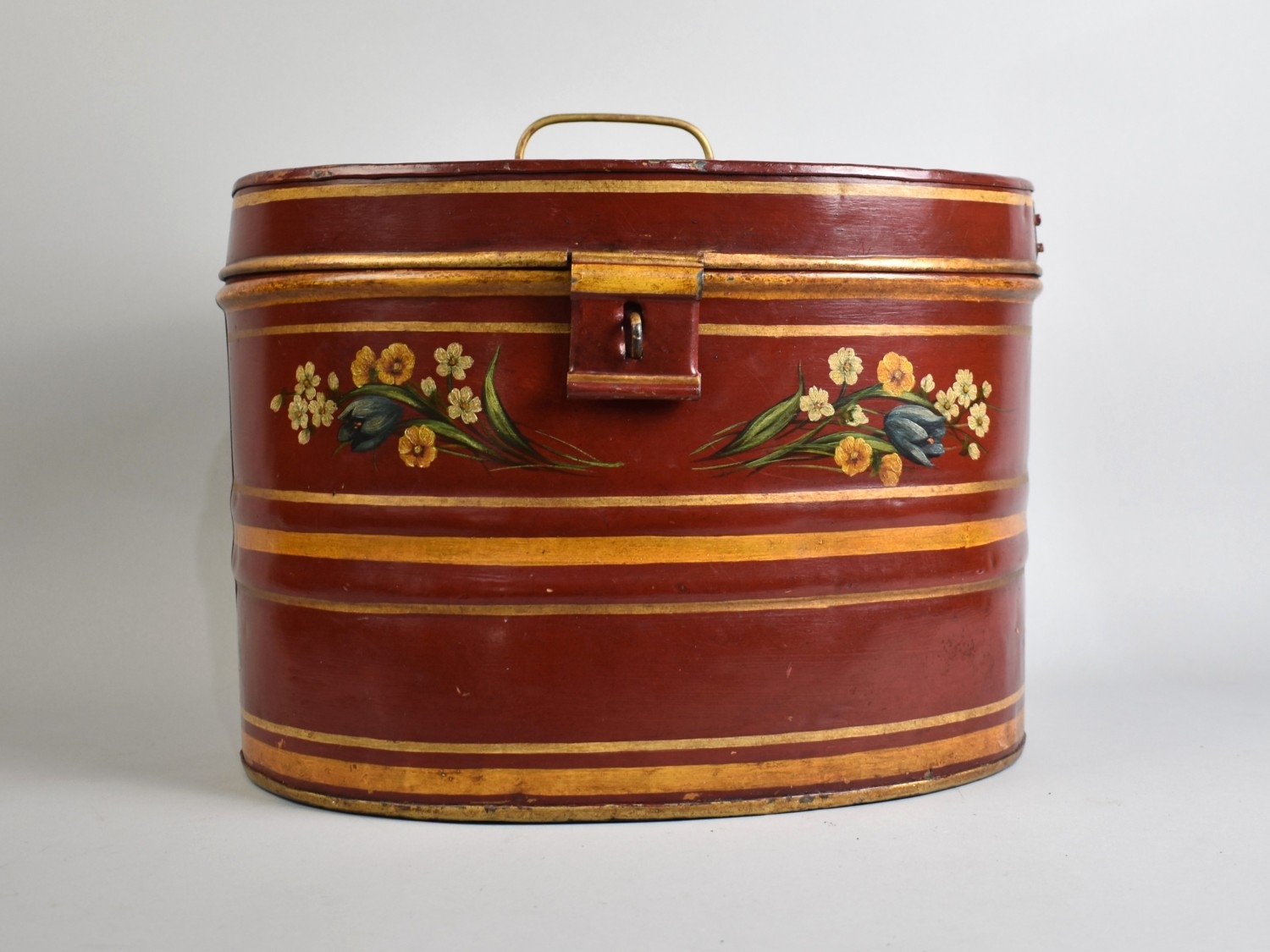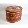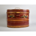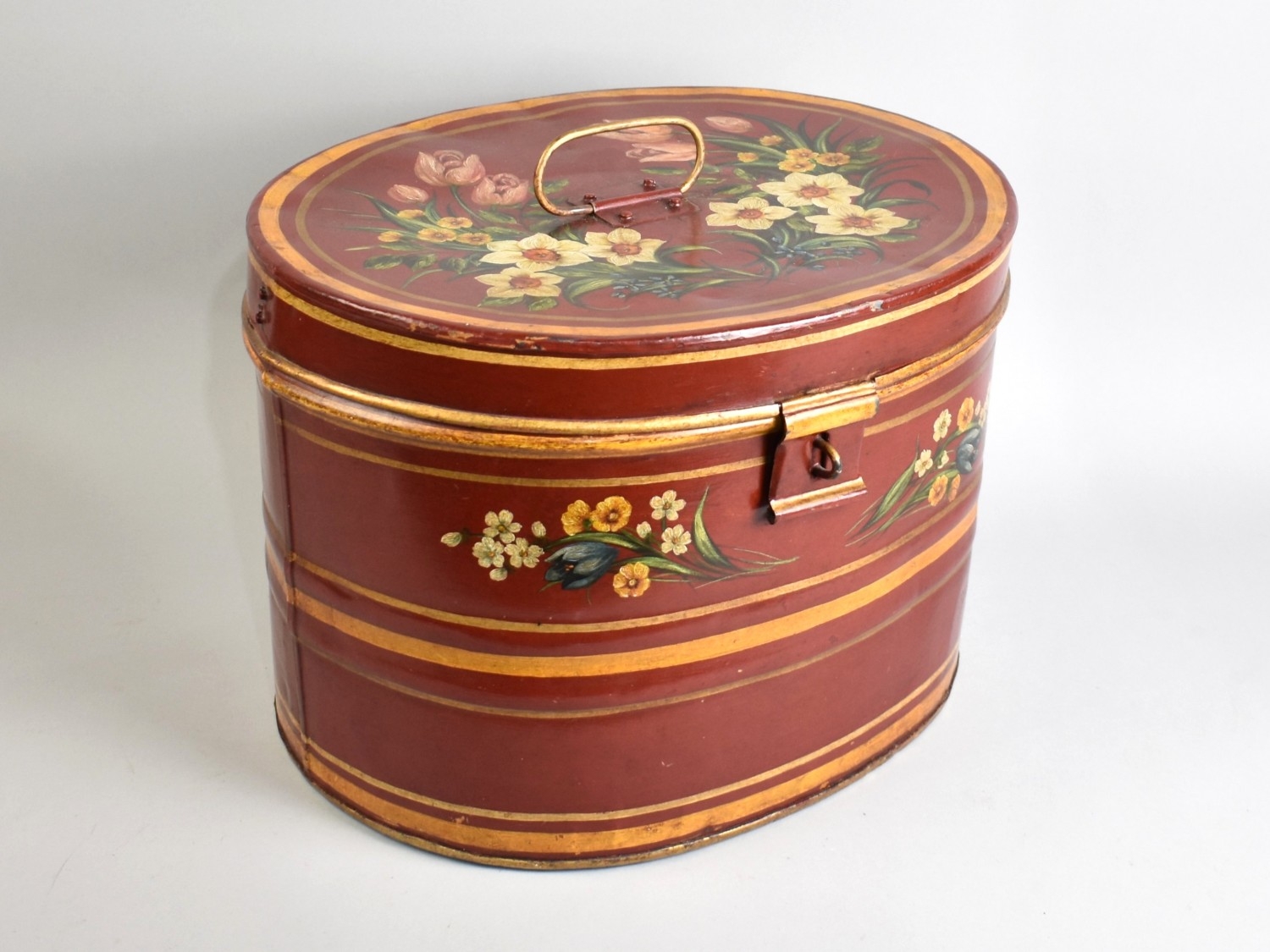 A Nicely Painted Oval Metal hat Tin Decorated with Daffodils and Tulips, 37cms Wide and 26cms High