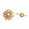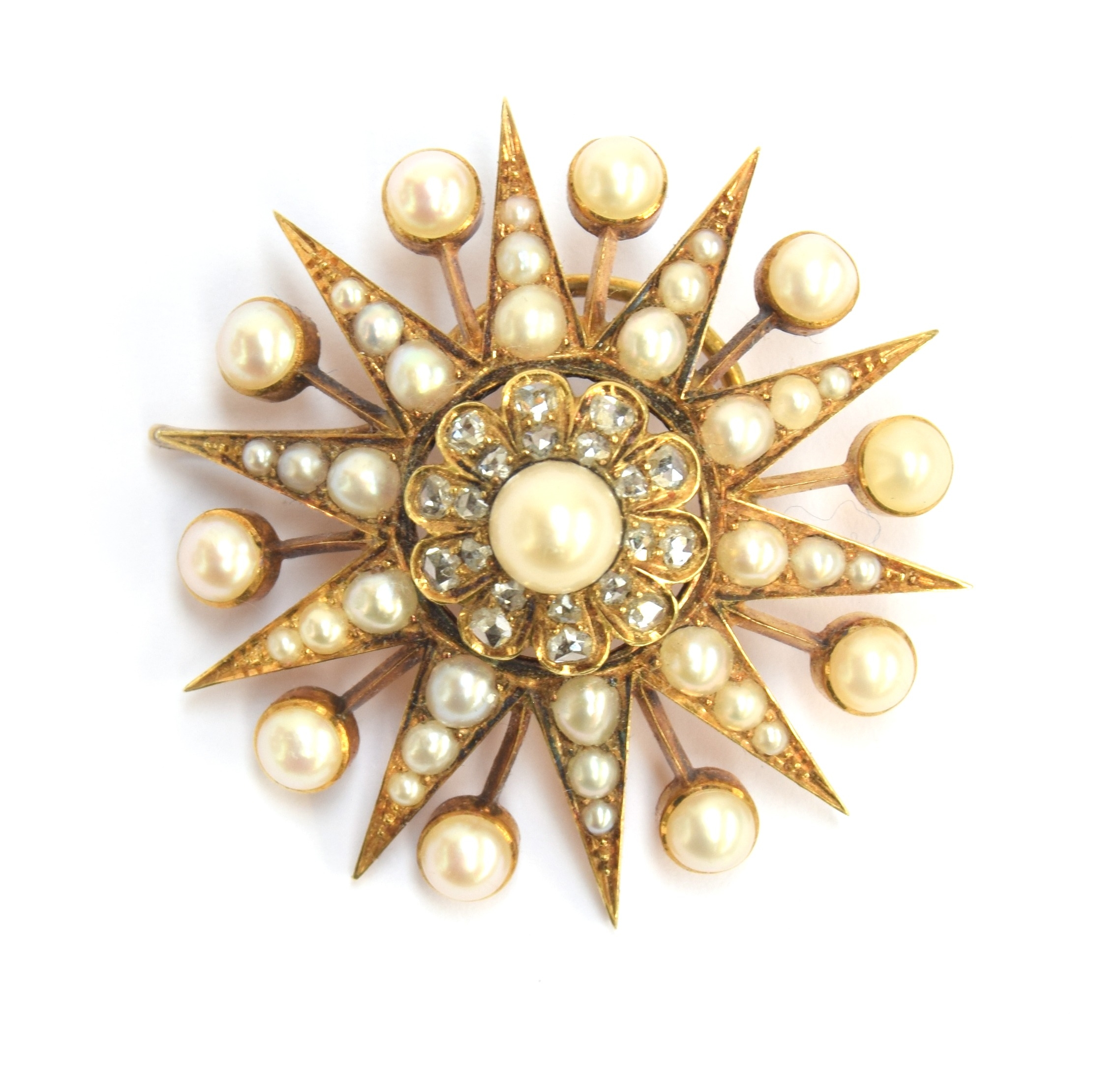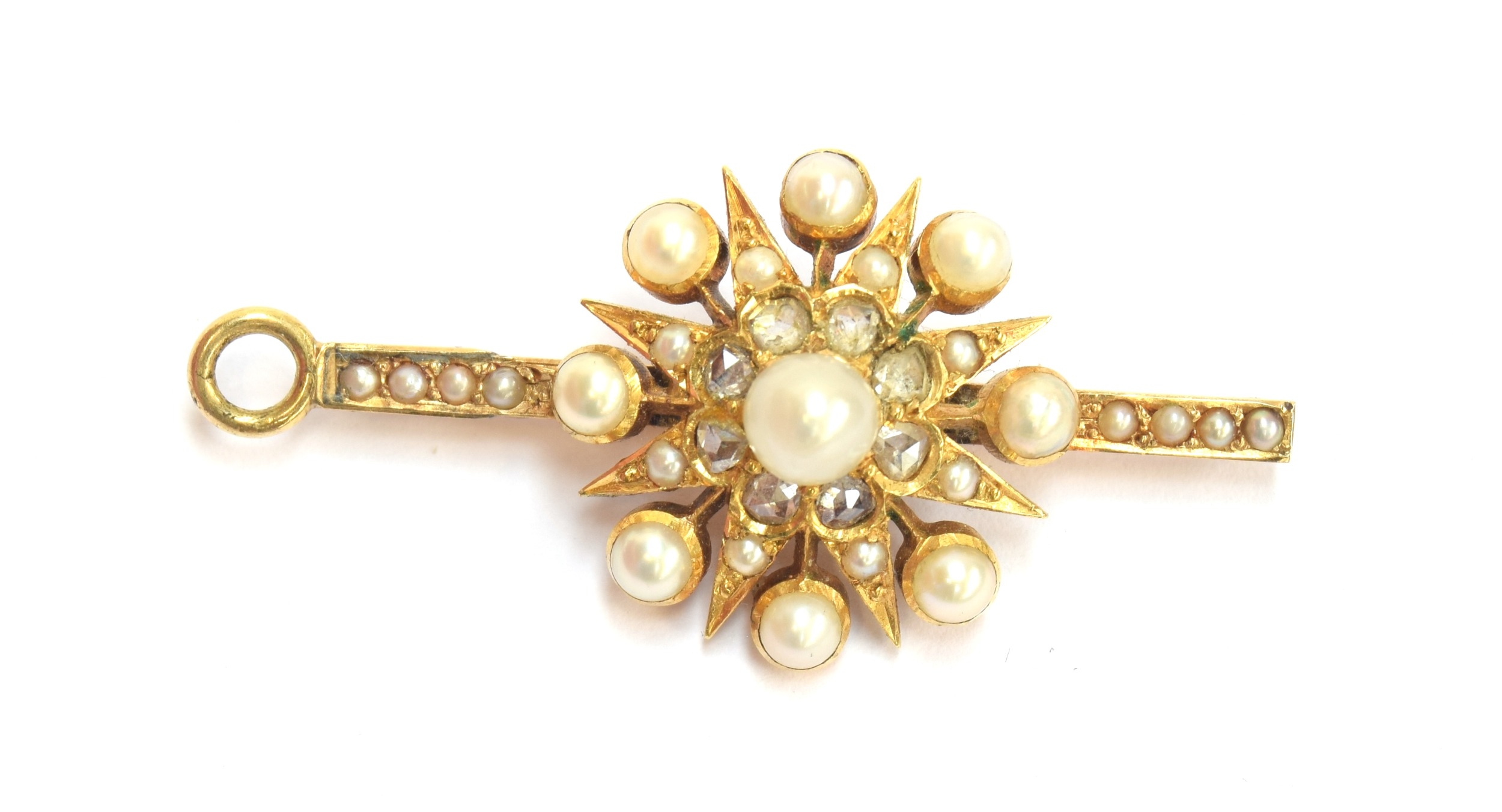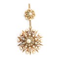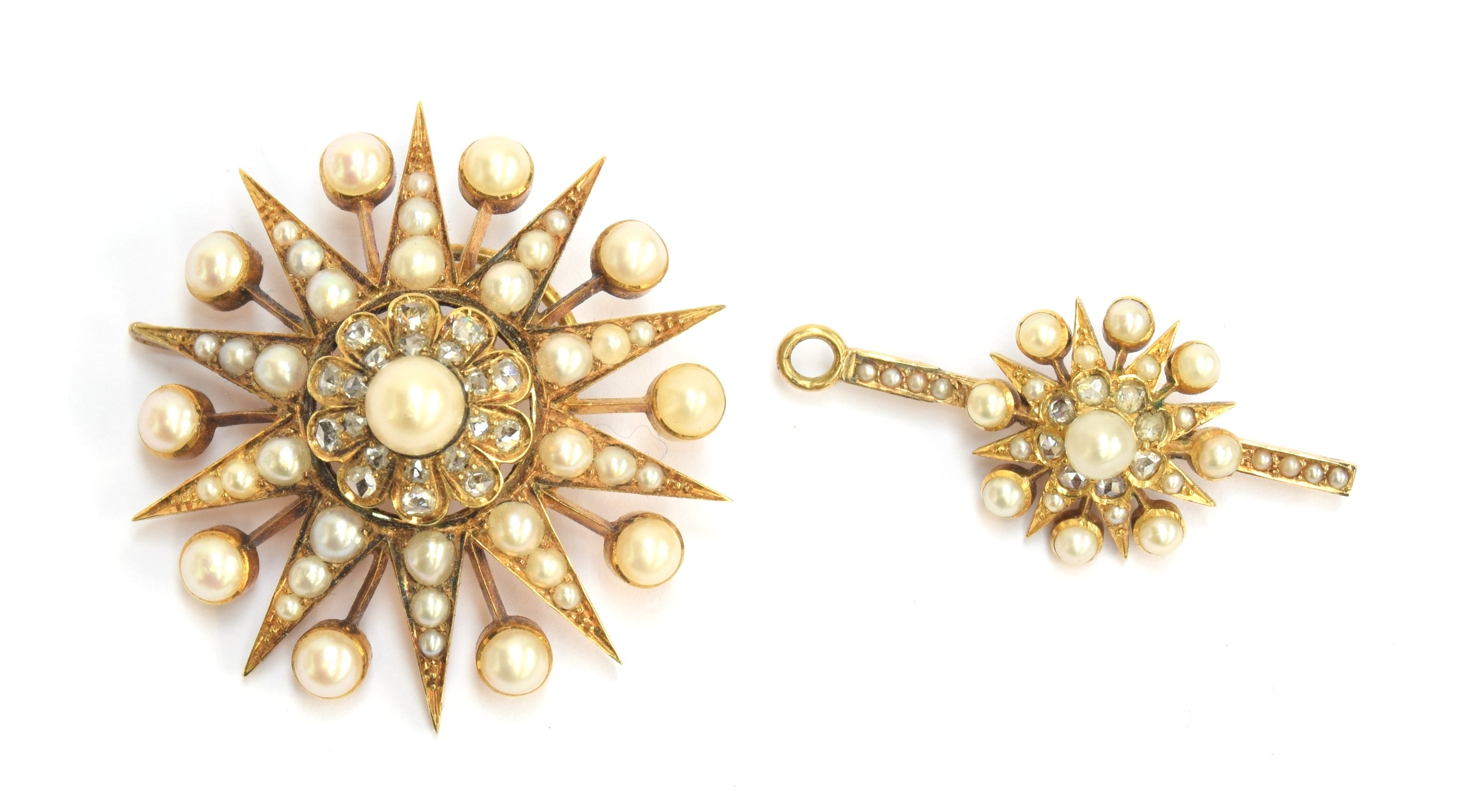 A Victorian gold, pearl and diamond star form pendant/slide, the large pendant drop 4cm diameter, suspended from a slide set with a smaller star, 1.3cm diameter, 7.5cm combined length, unhallmarked but tests as 15ct or higher, 16.8g