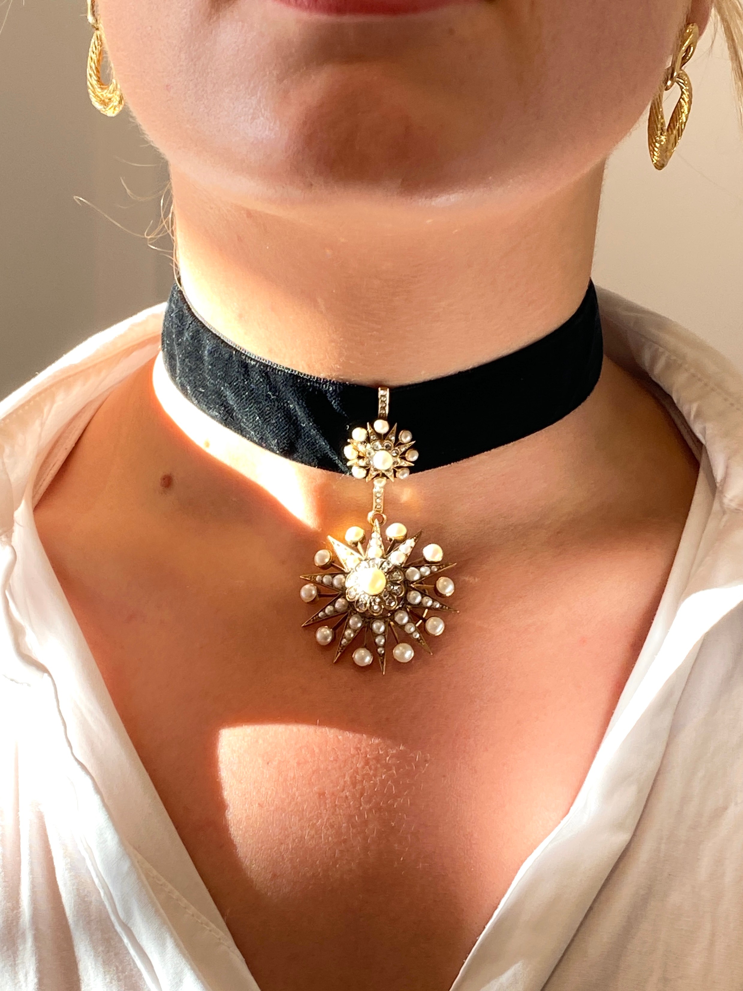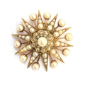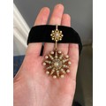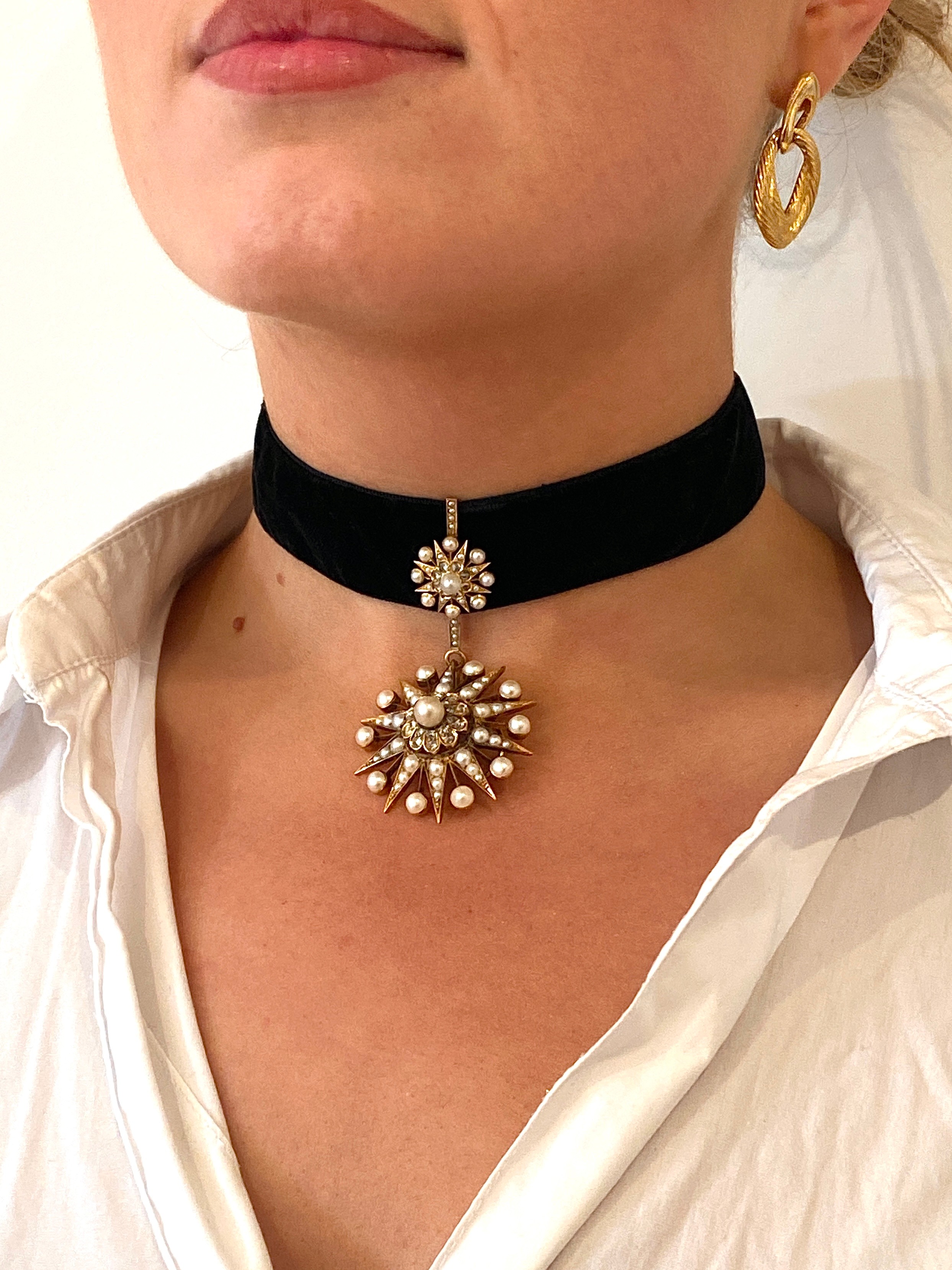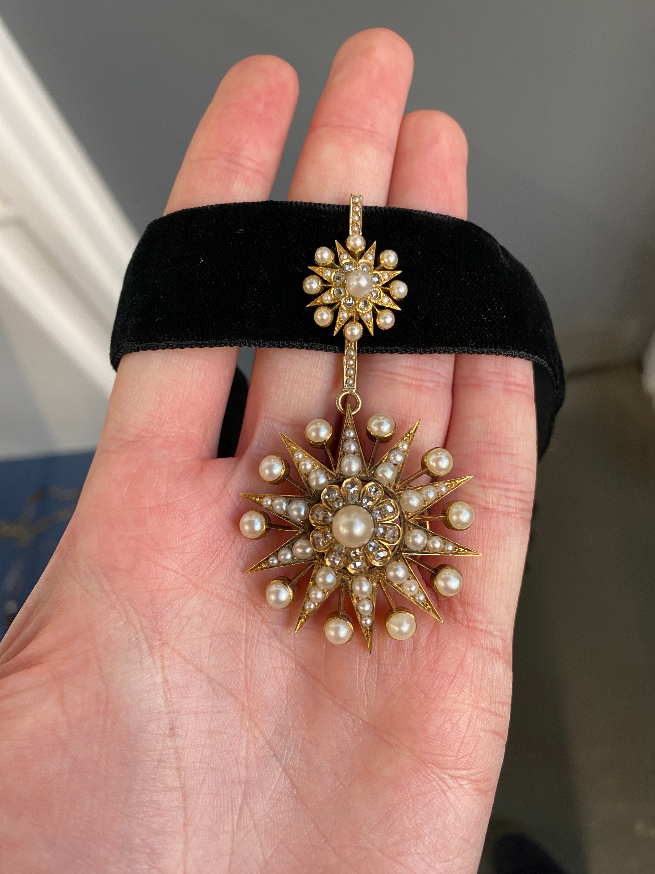 A Victorian gold, pearl and diamond star form pendant/slide, the large pendant drop 4cm diameter, suspended from a slide set with a smaller star, 1.3cm diameter, 7.5cm combined length, unhallmarked but tests as 15ct or higher, 16.8g