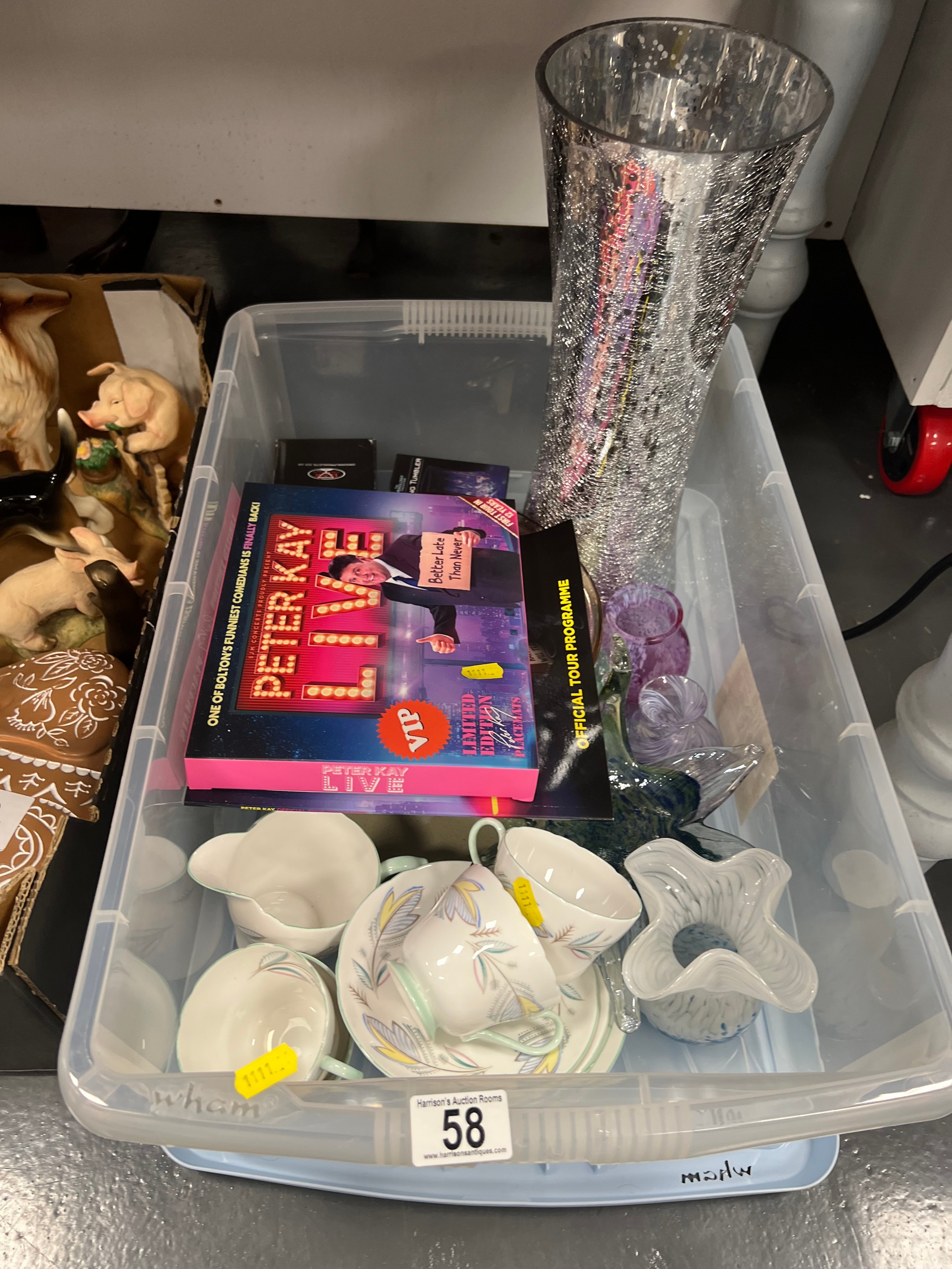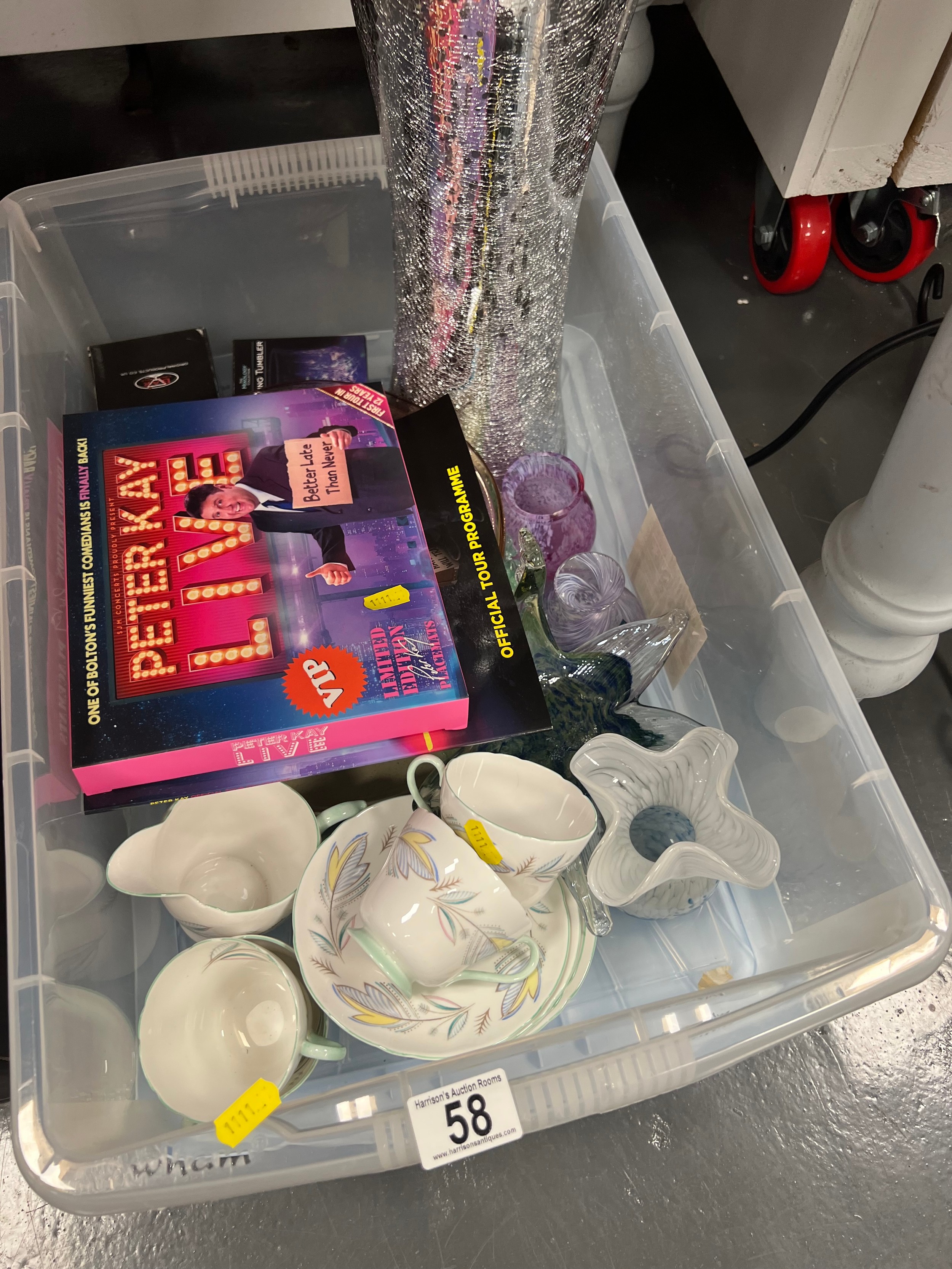 Box of pottery & glassware inc shelly cups & saucers, caithness glass etc