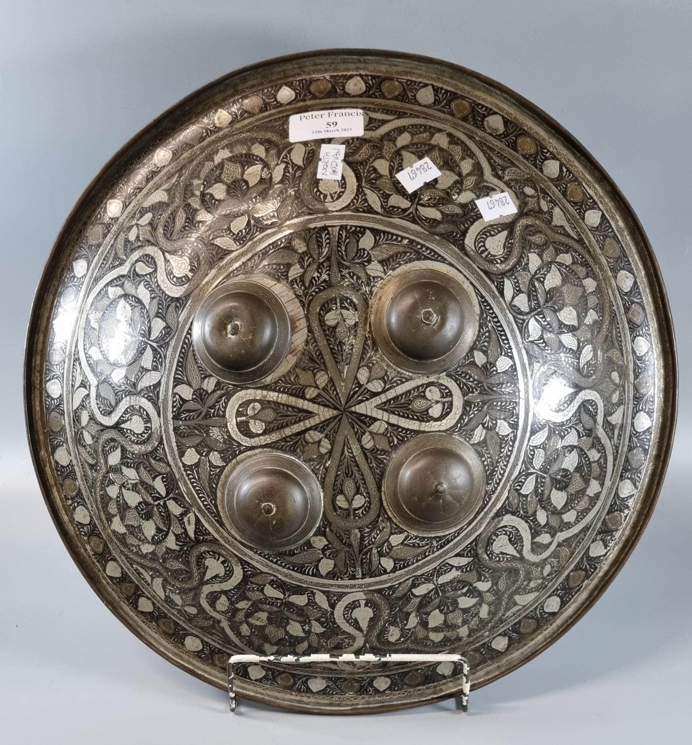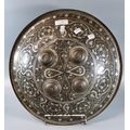 North Indian Damascened brass targe/shield with four bullseye mounts and foliate decoration. (B.P. 21% + VAT)