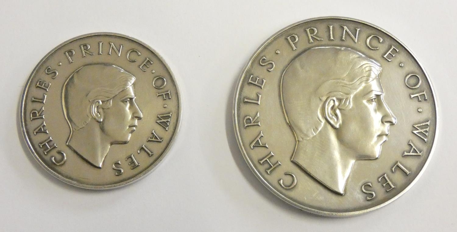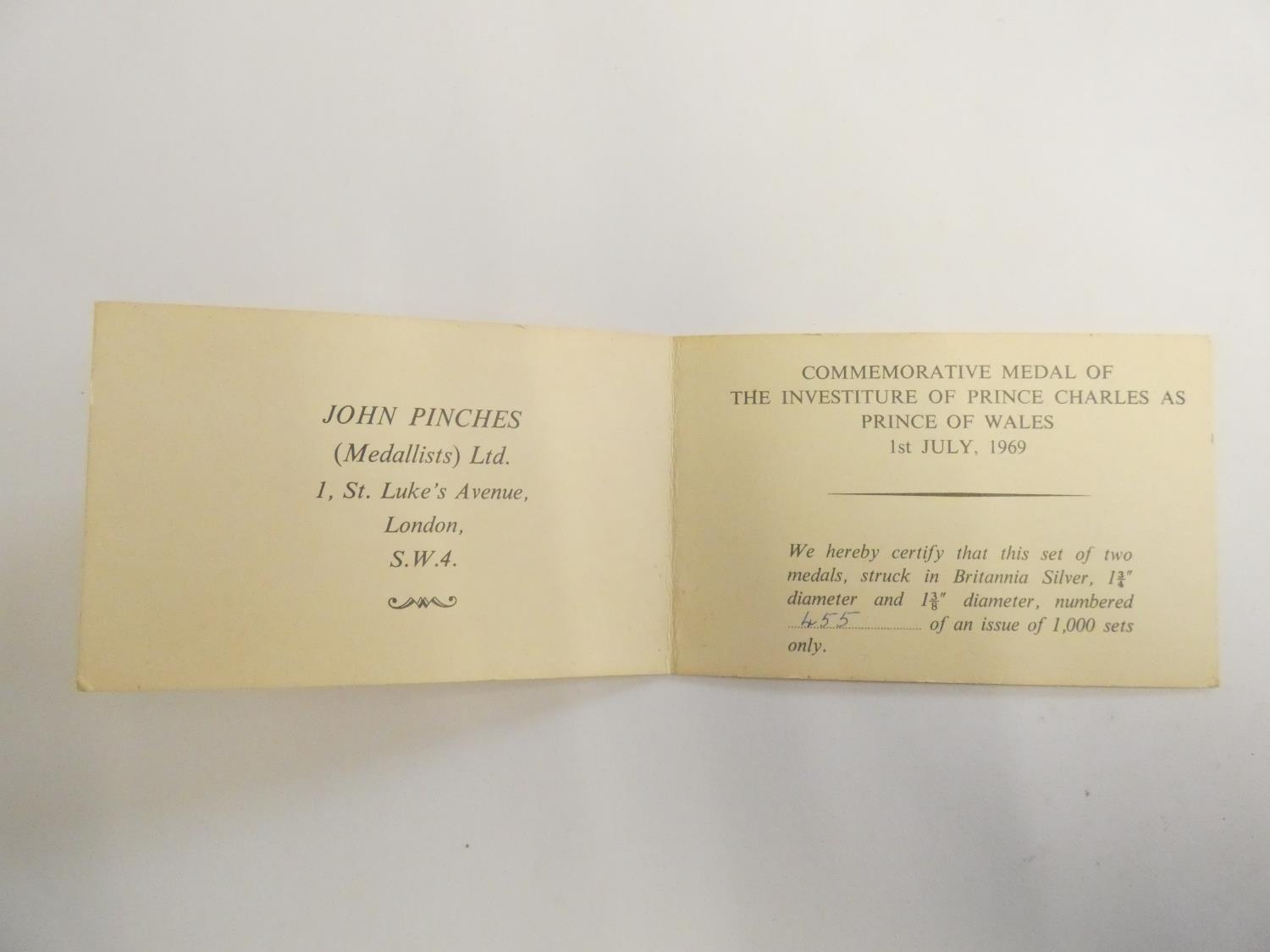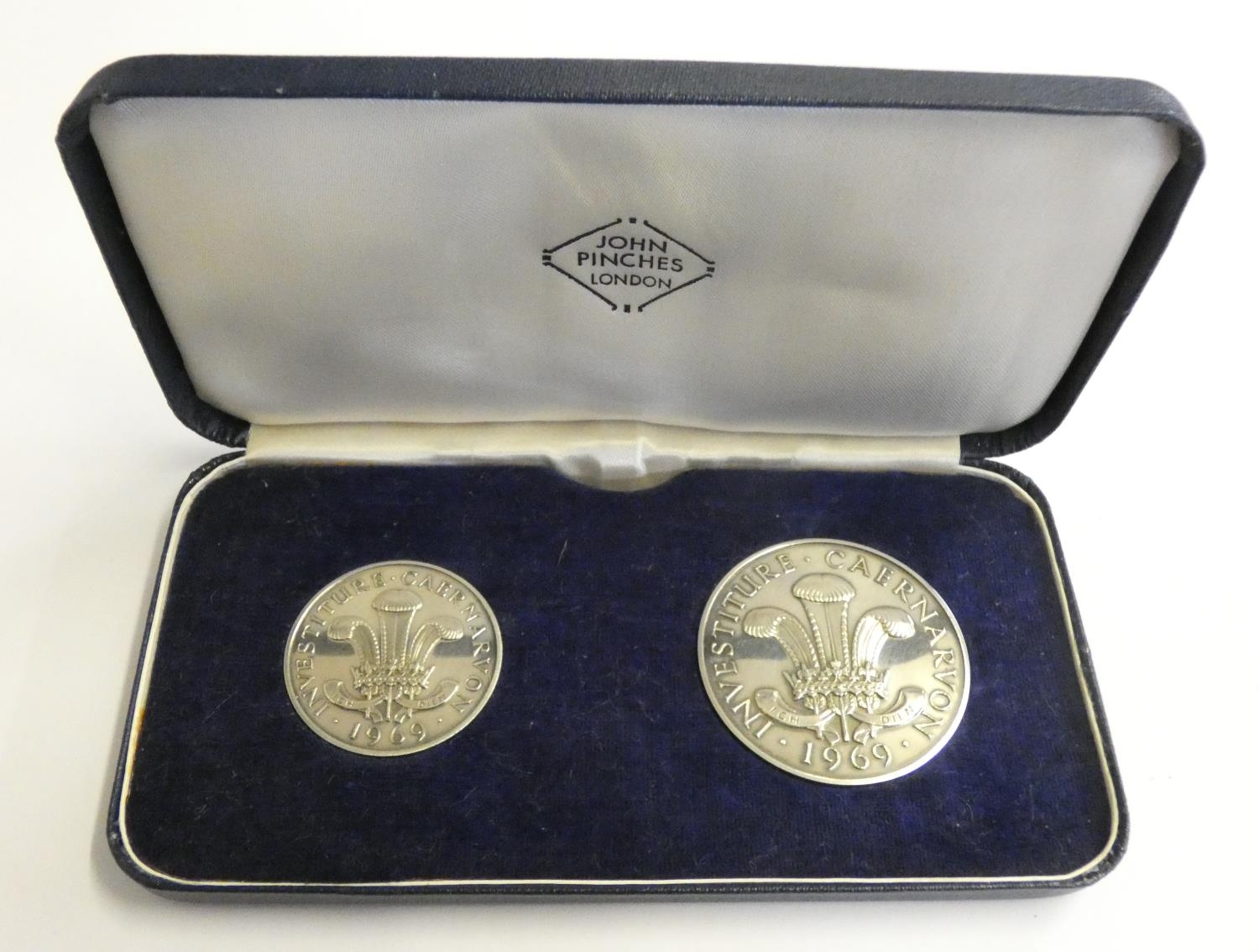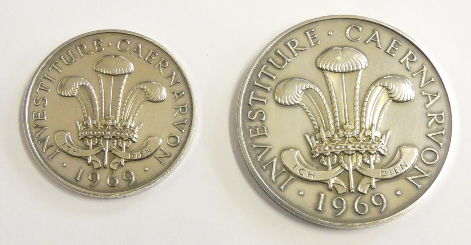 Of Prince of Wales Investiture interest; a limited edition set of two medals, Britannia standard silver, London 1969, 455/1000, 2oz, case, certificate.