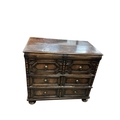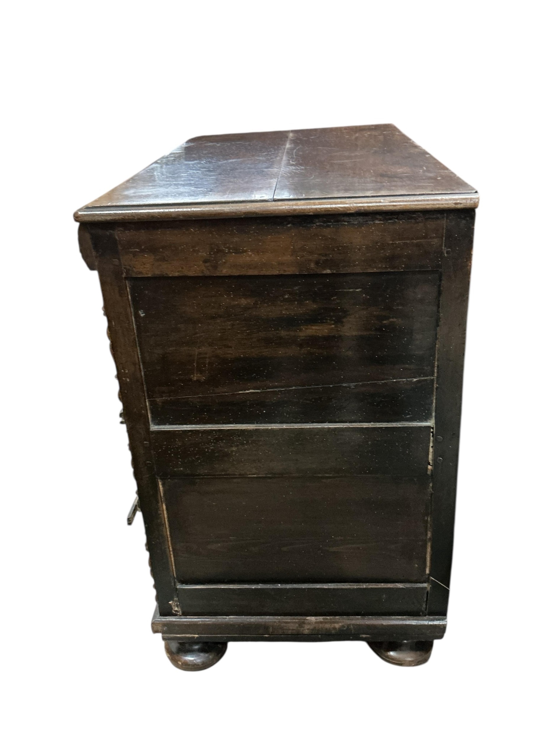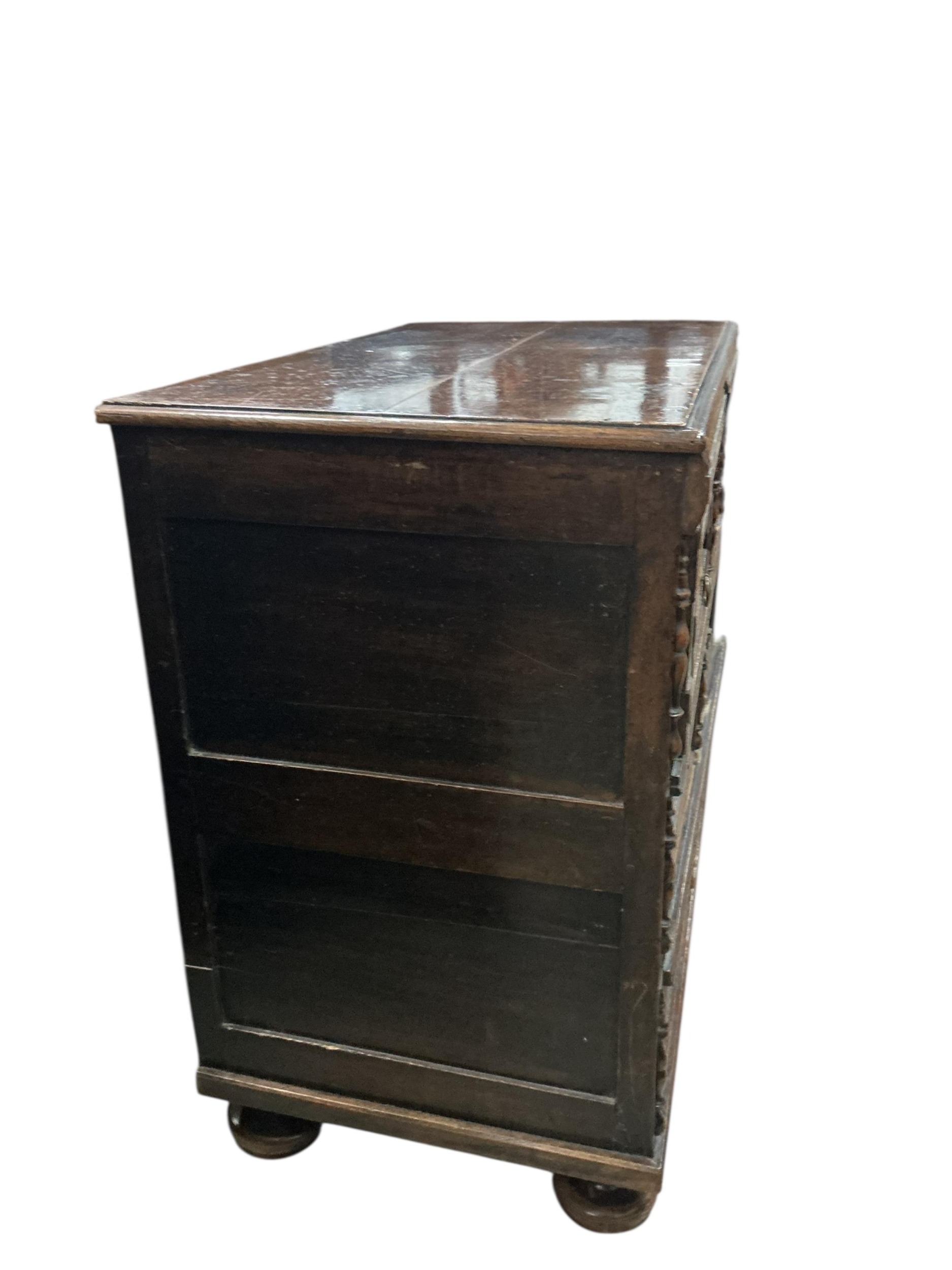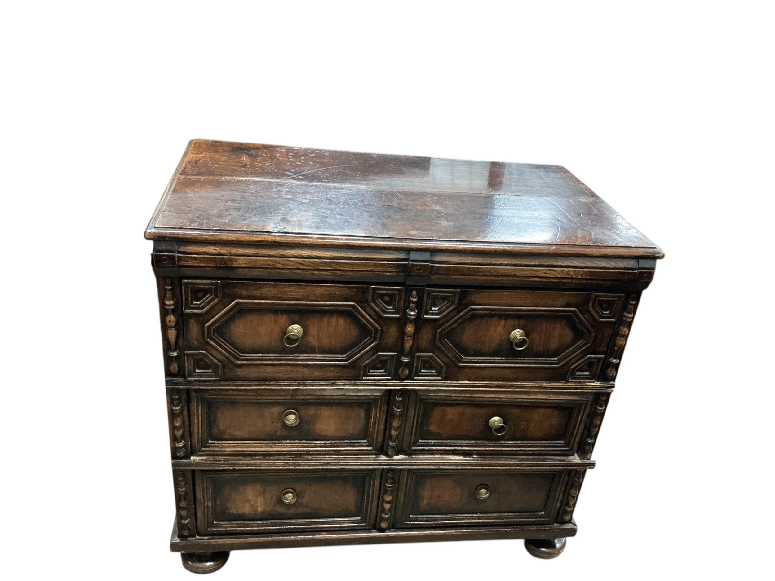 A Jacobean oak and walnut geometric chest of three drawers, width 94cm, depth 53cm, height 86cm