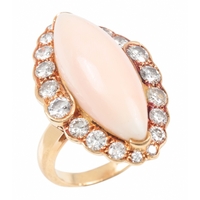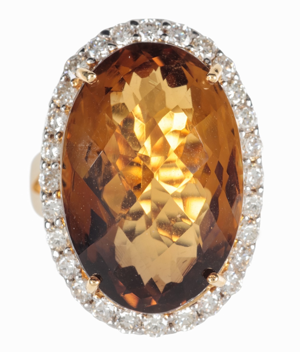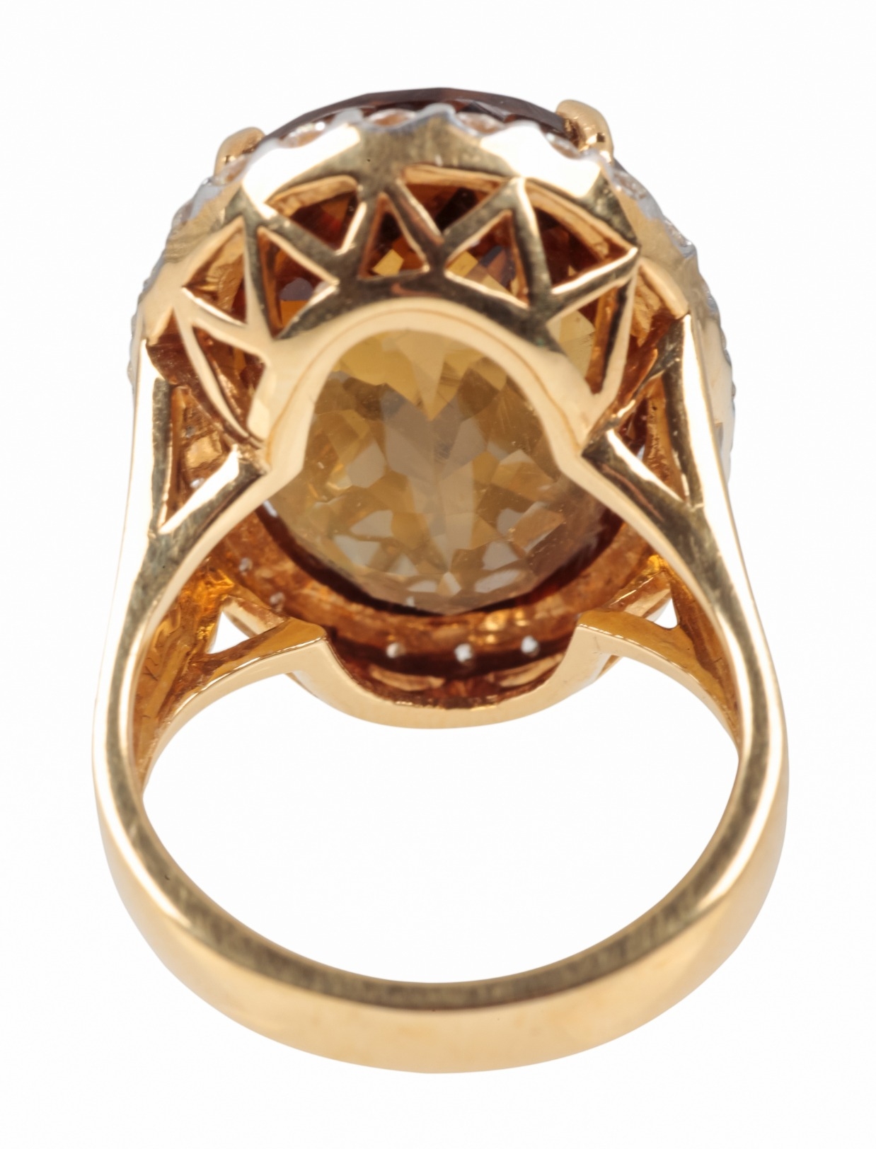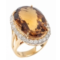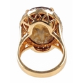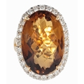 A CITRINE AND DIAMOND DRESS RINGthe oval briolette cut citrine c. 20mm x 14.7mm with round brilliant cut surround, the shank stamped 750, ring size N, c. 14.2 grams