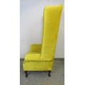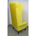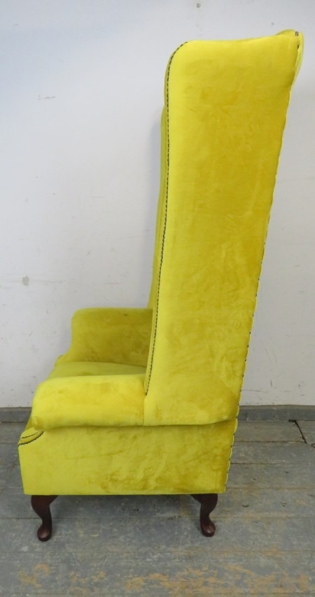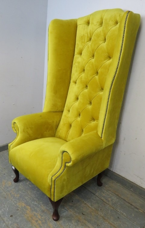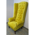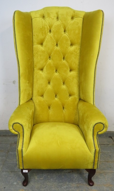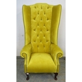 A high back winged armchair upholstered in a yellow fabric with deep buttoned back over cabriole legs. H156cm x W81cm x D82cm approx.