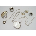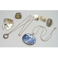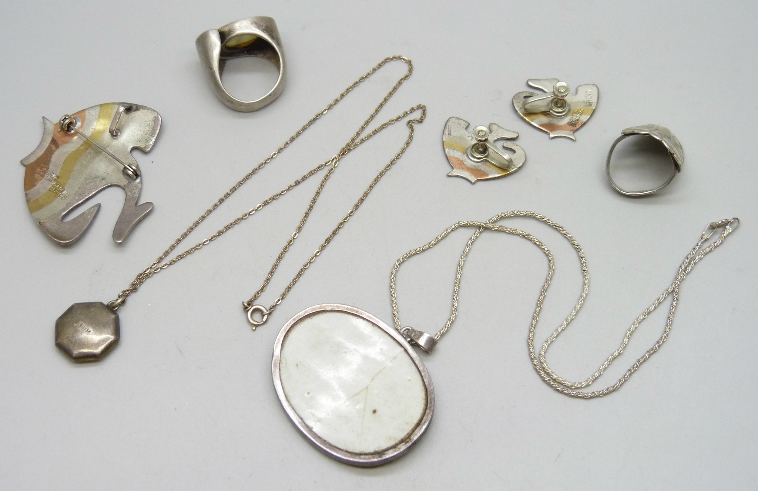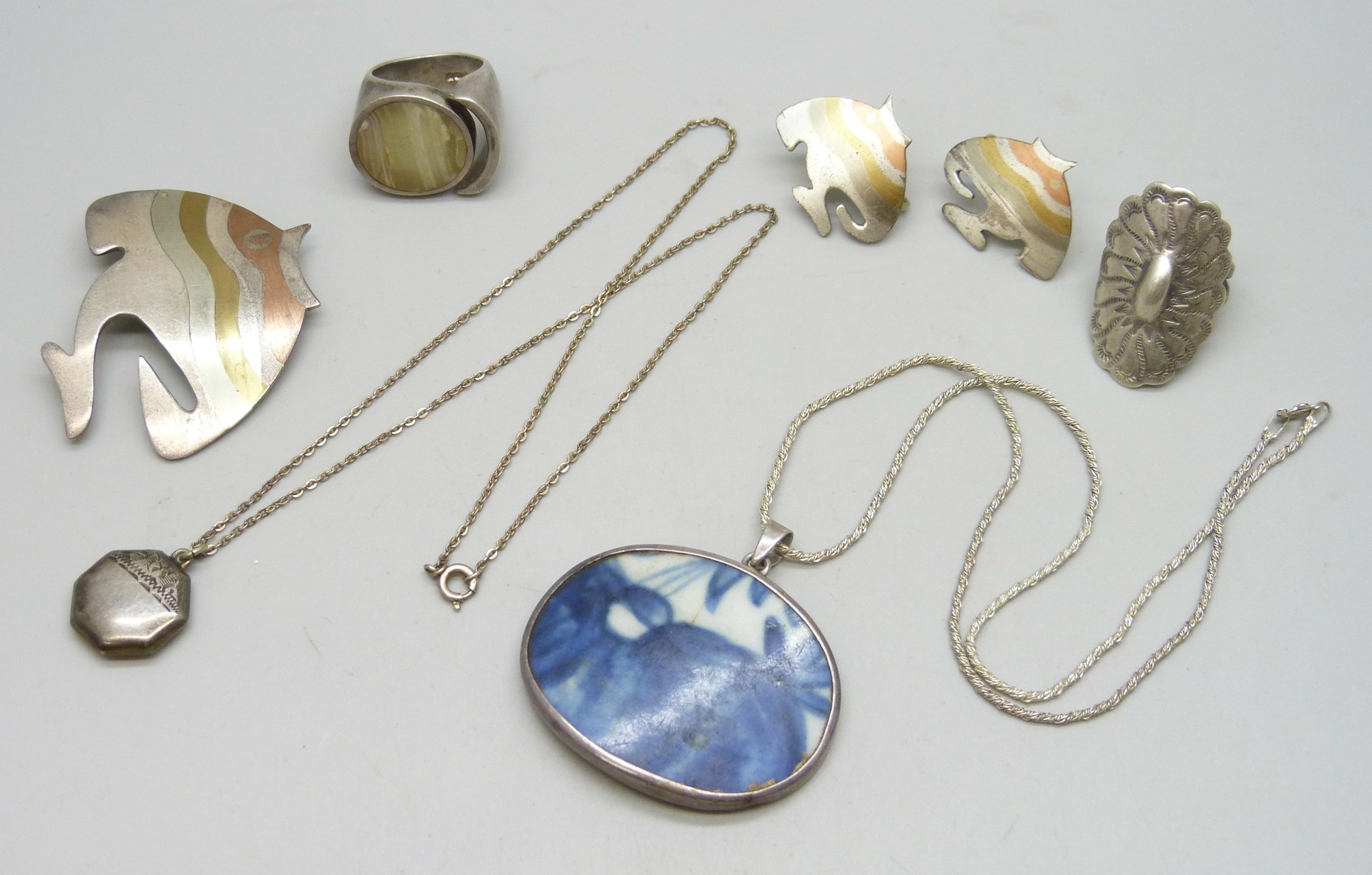 A Mexican fish brooch and matching earrings, together with a collection of silver and white metal jewellery including a Modernist chunky silver ring, ceramic plaque a/f, 48g without fish pieces