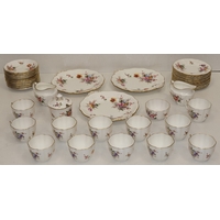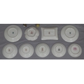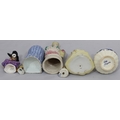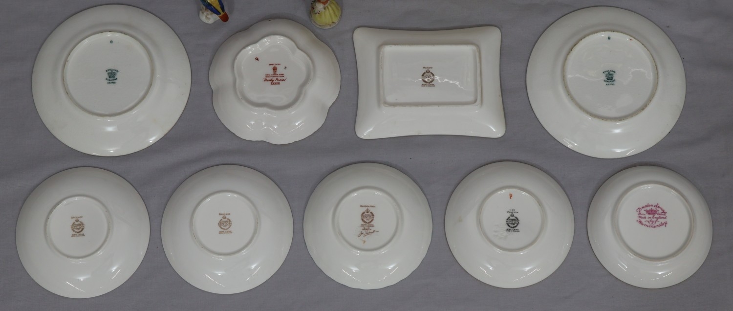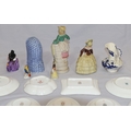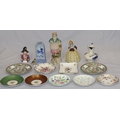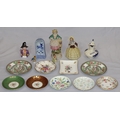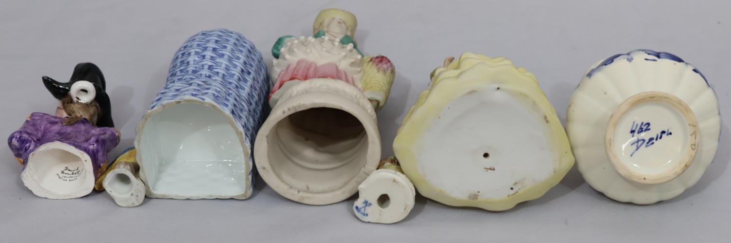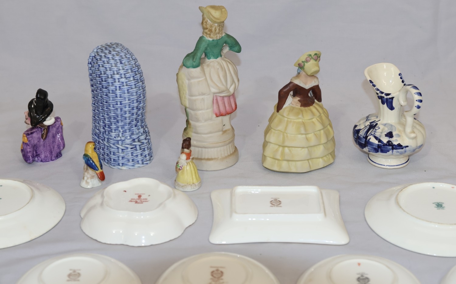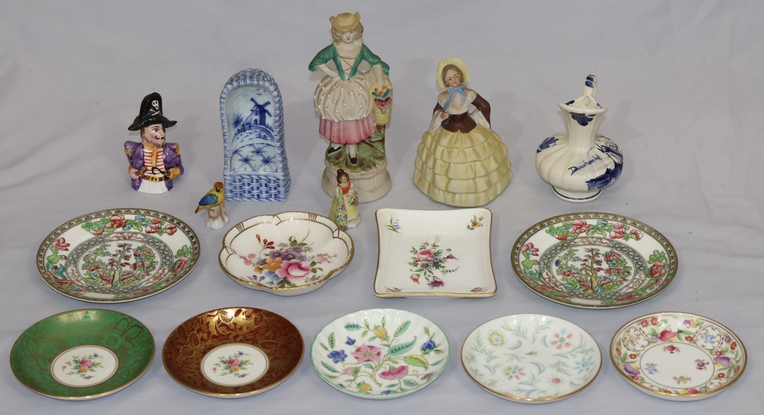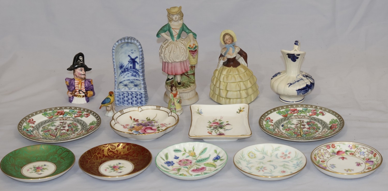 A Royal Crown Derby round scallop shaped pin dish "Derby Posies", 4 similar Minton pin dishes, a Delft blue and white miniature Shepherd's chair, 2 china figures, 3 further figures, a Delft blue and white jug and 2 side plates (16)