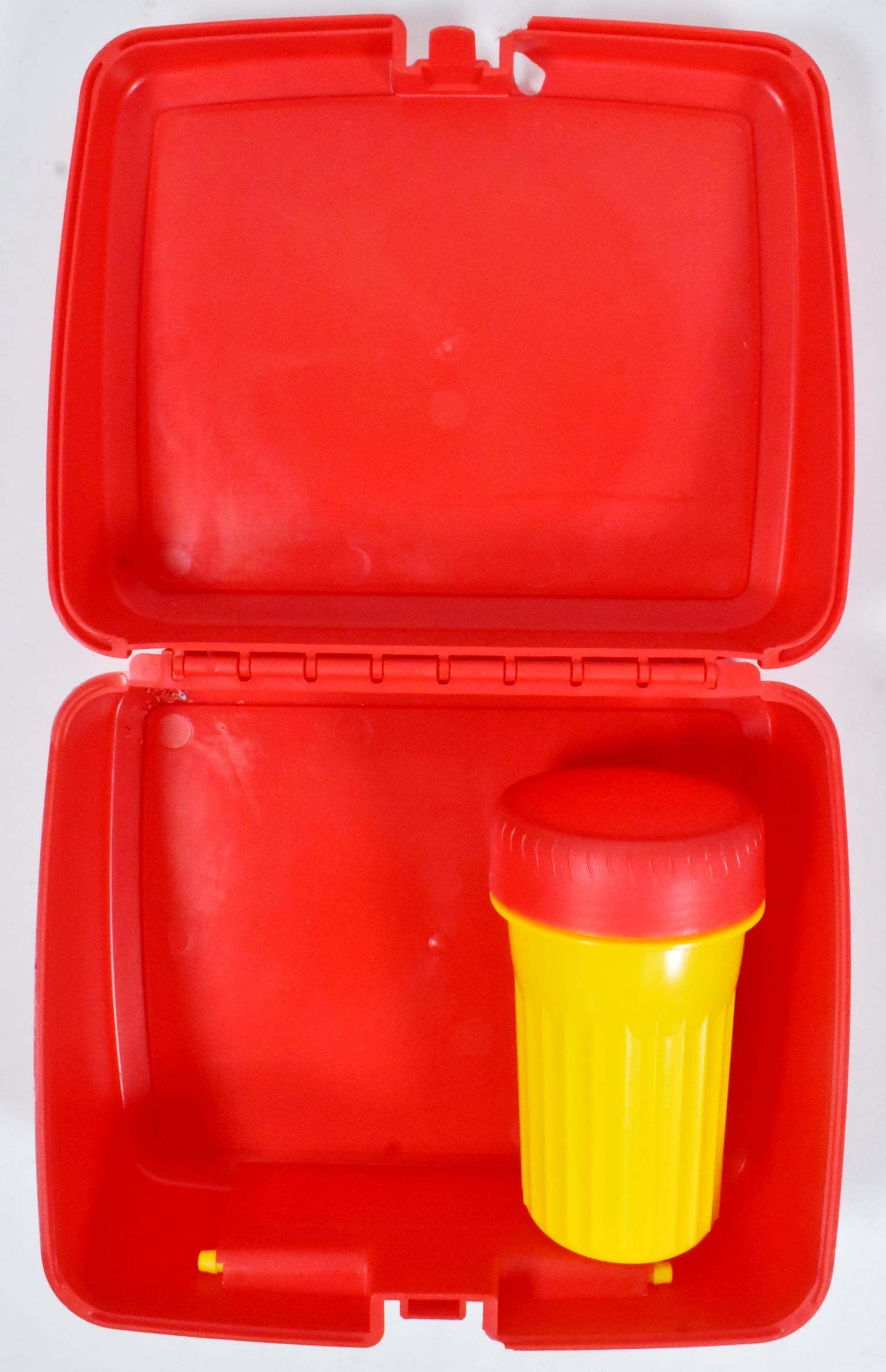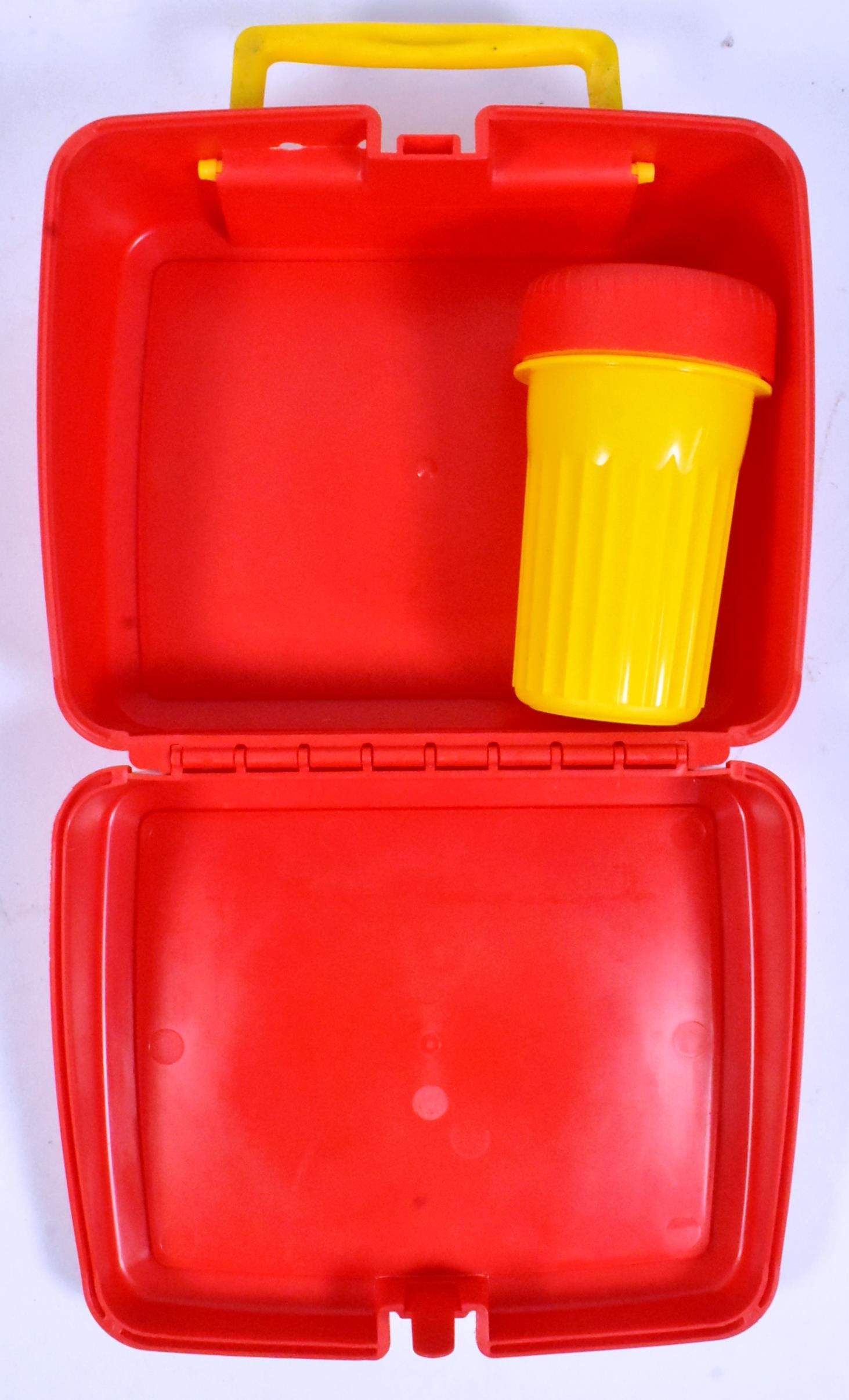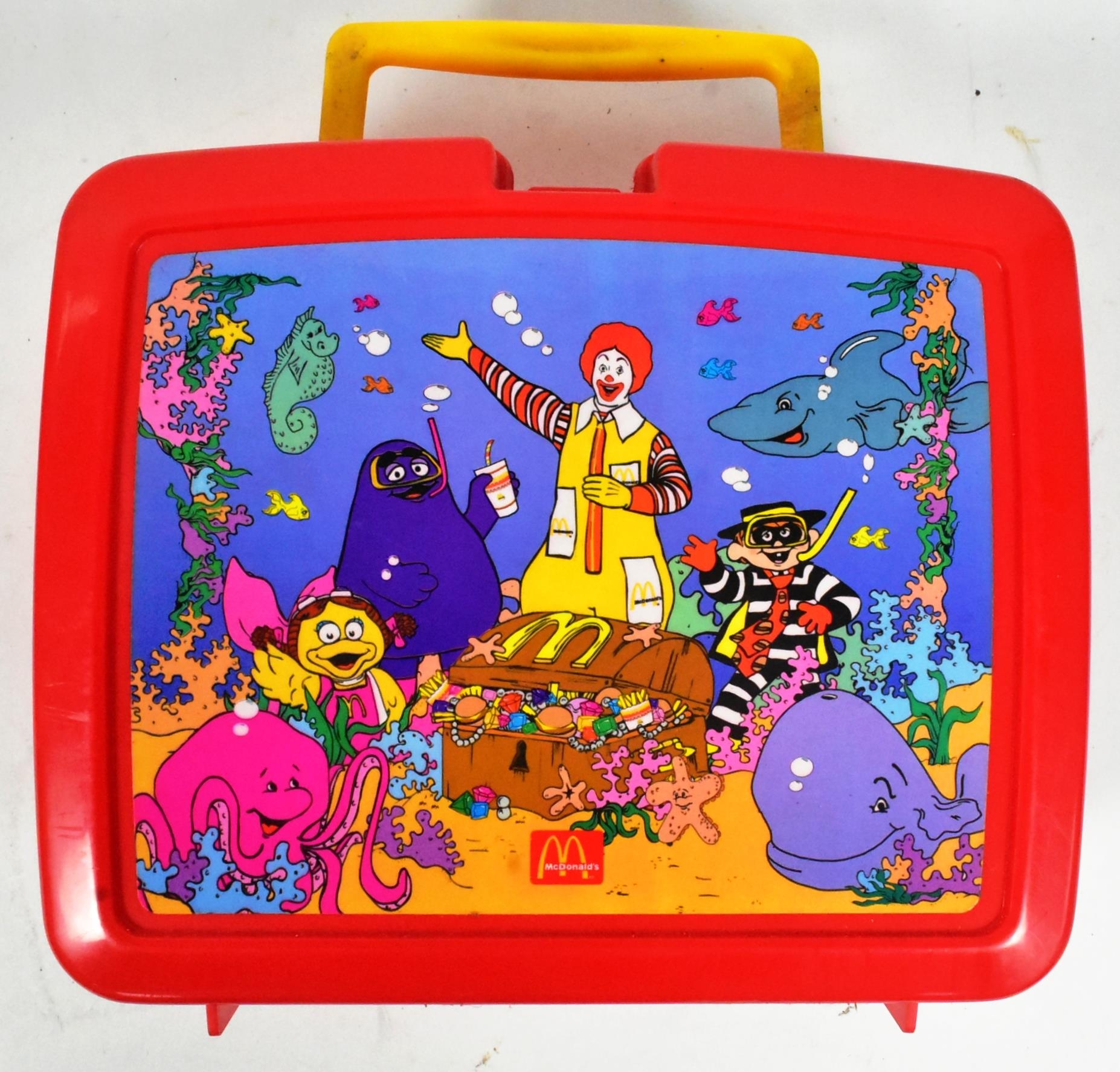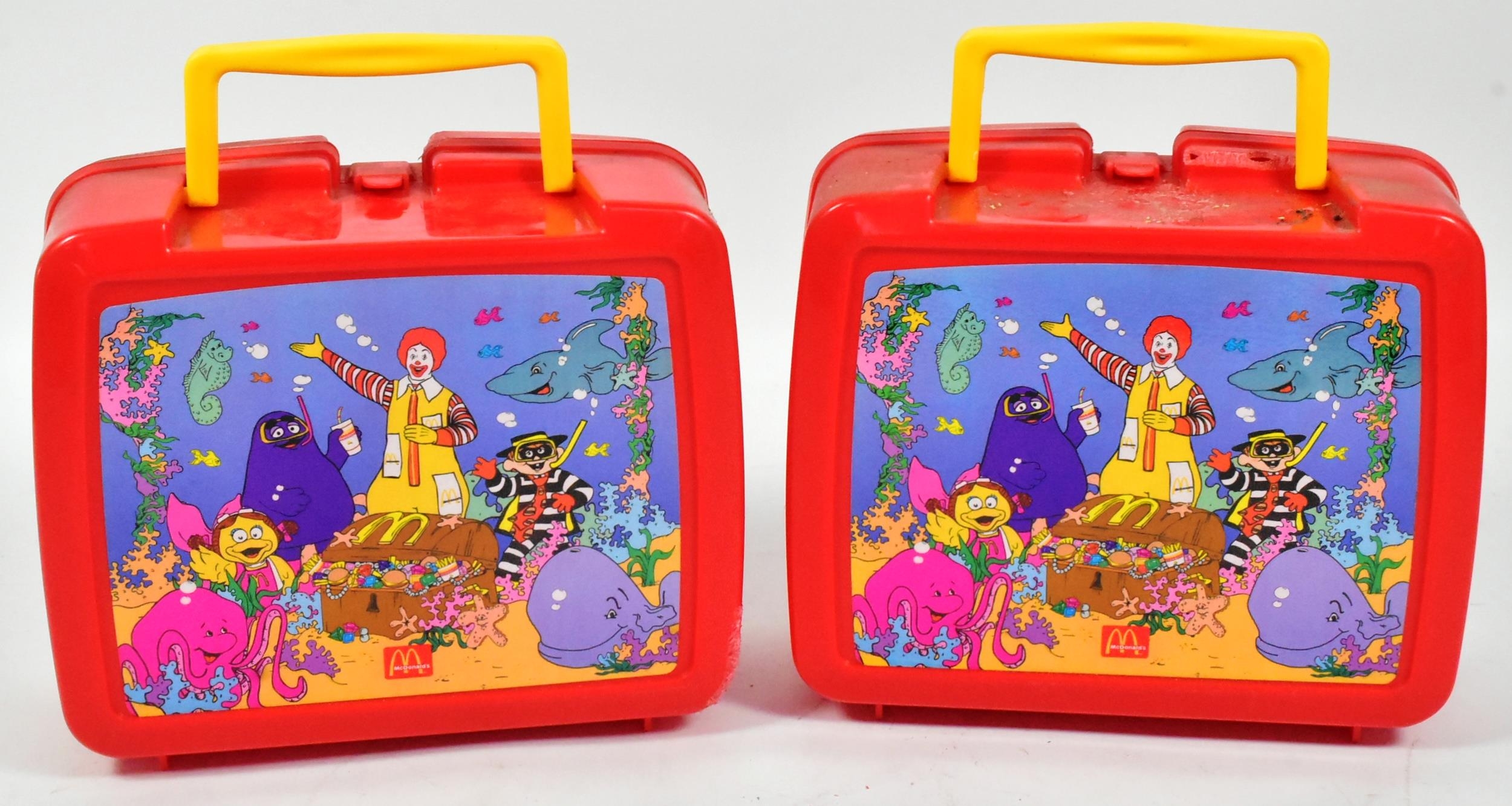 McDonalds - x2 vintage McDonalds merchandise lunch boxes with flasks. Each with yellow carry handles and original sticker decals. Measures approx 18x22x10cm.