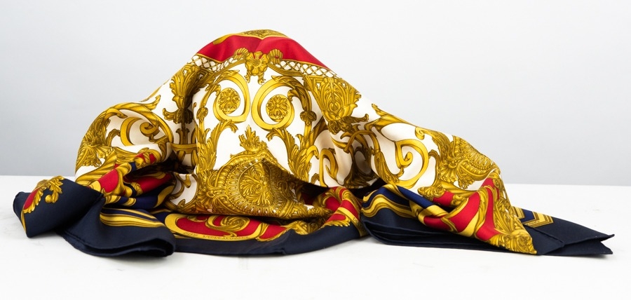 HERMES PRINTED PURE SILK SCARF with 'Les Tuileries' design by Joachim Metz, 35" square (89cm); and a JIM THOMPSON THAI SILK SCARF with floral design, signed lower right, 31½" square (80cm) (2)