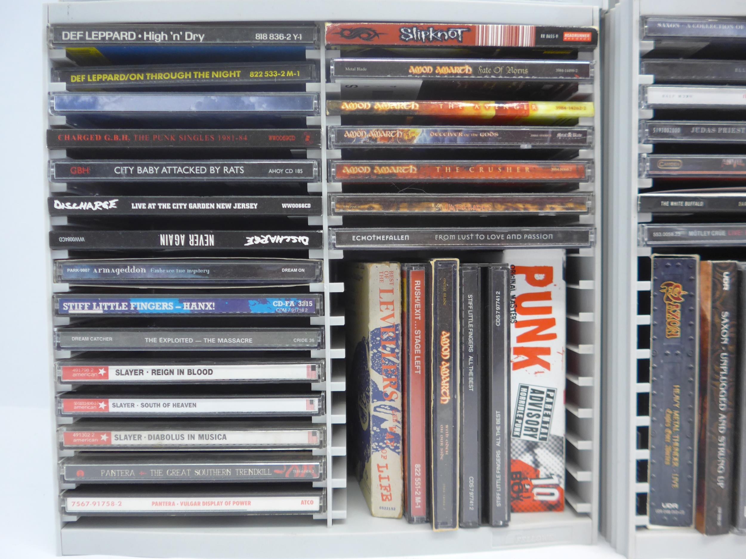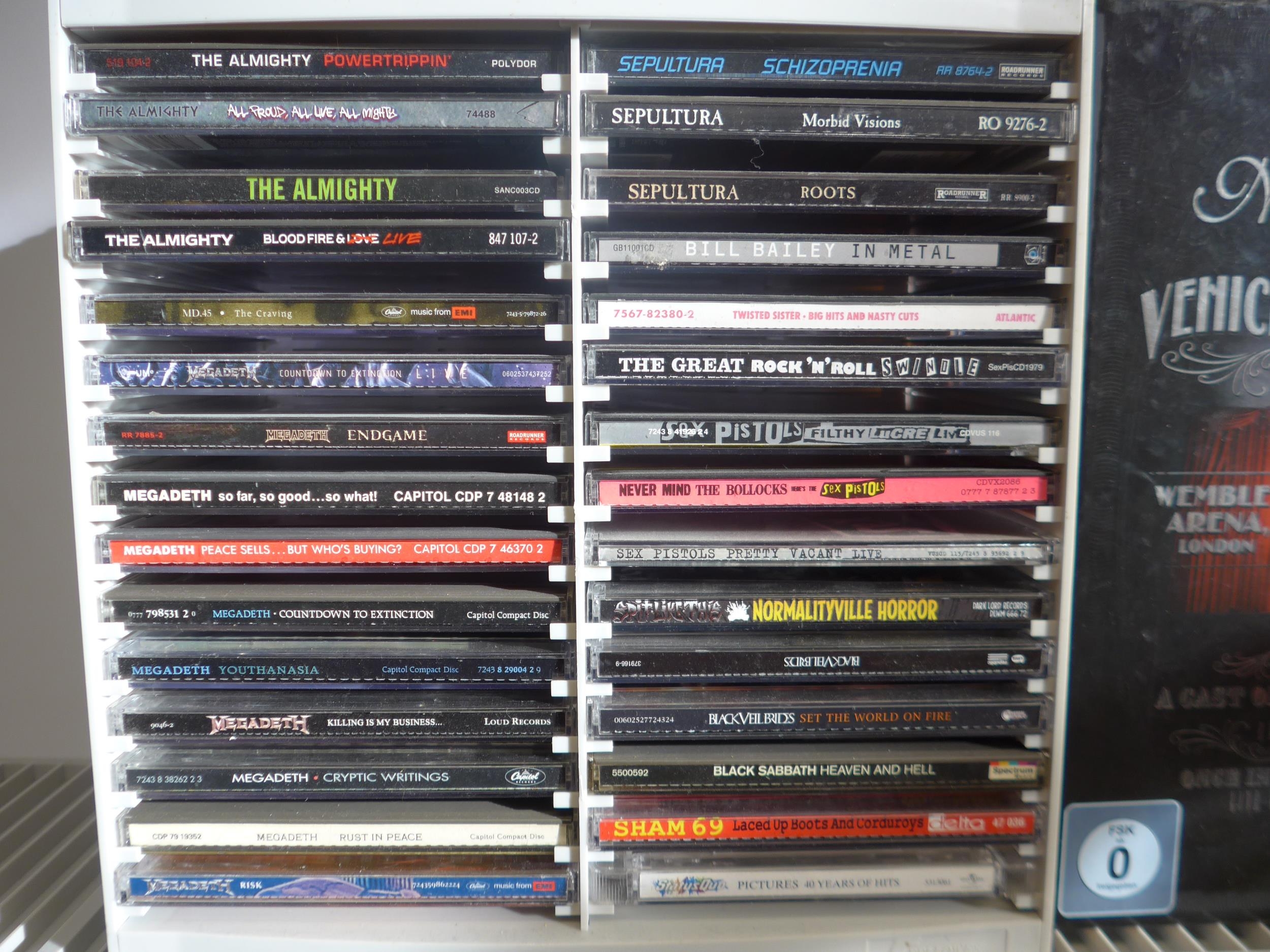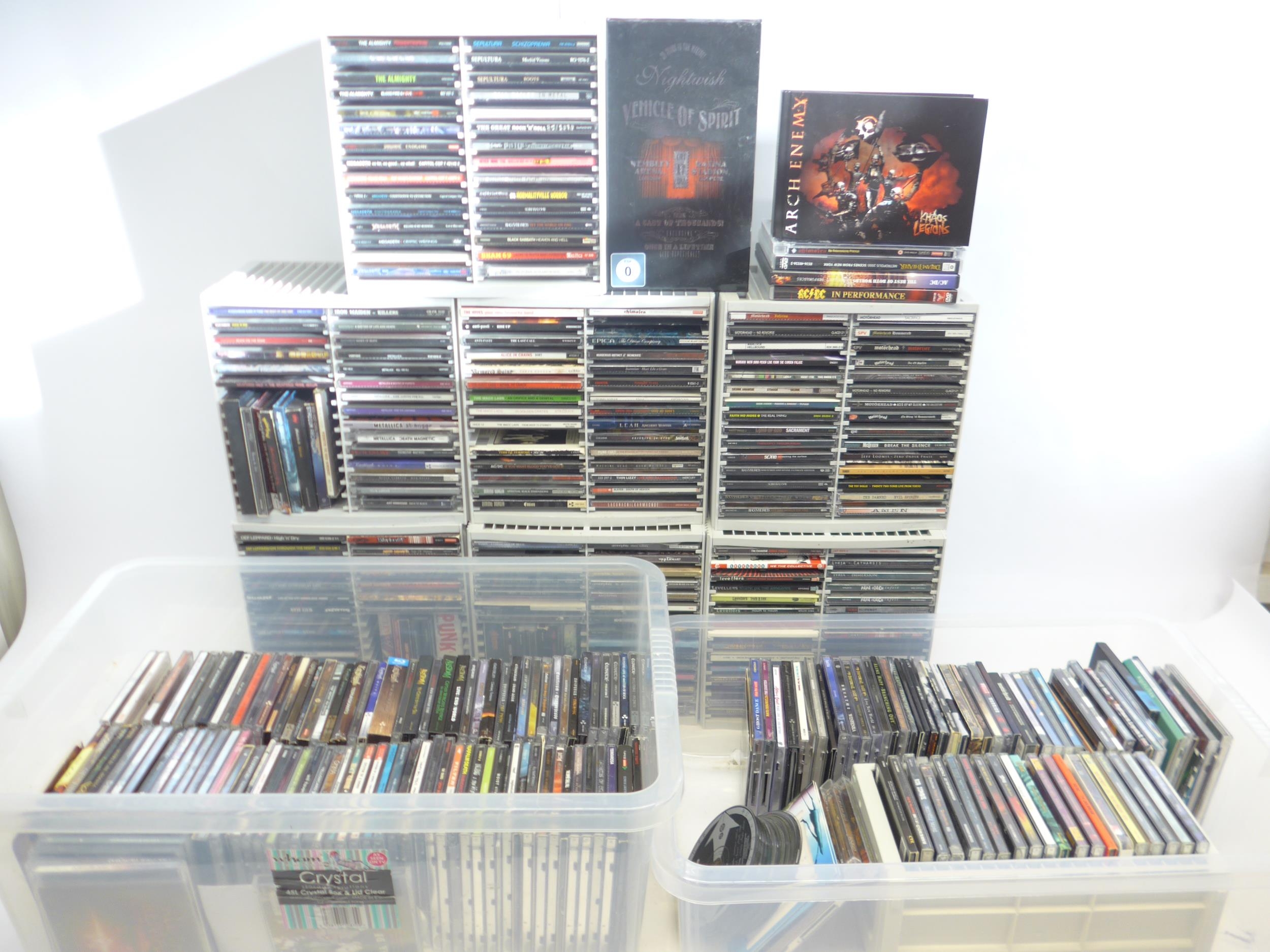 Heavy Metal / Hard Rock / Punk - CD collection - two hundred and sixty CDs, artists include Motorhead, Anthrax, Judas Priest, Megadeth, The Almighty, Sepultura, Sex Pistols, Black Sabbath, Nightwish, Arch Enemy, Iron Maiden, Amon Amarth, Metallica, Anti-Pasti, Dimmu Borgir, The Macc Lads, AC/DC, Testament, Thin Lizzy, Slayer, Warlock, Amen, The Damned, Papa Roach, Amorphis, Slipknot, Discharge, Def Leppord, Alestorm, System Of A Down, Suicidal Tendencies, Dead Kennedys, etc (approx. 260, contents unchecked). With a smaller number of loose CDs and a few DVDs
