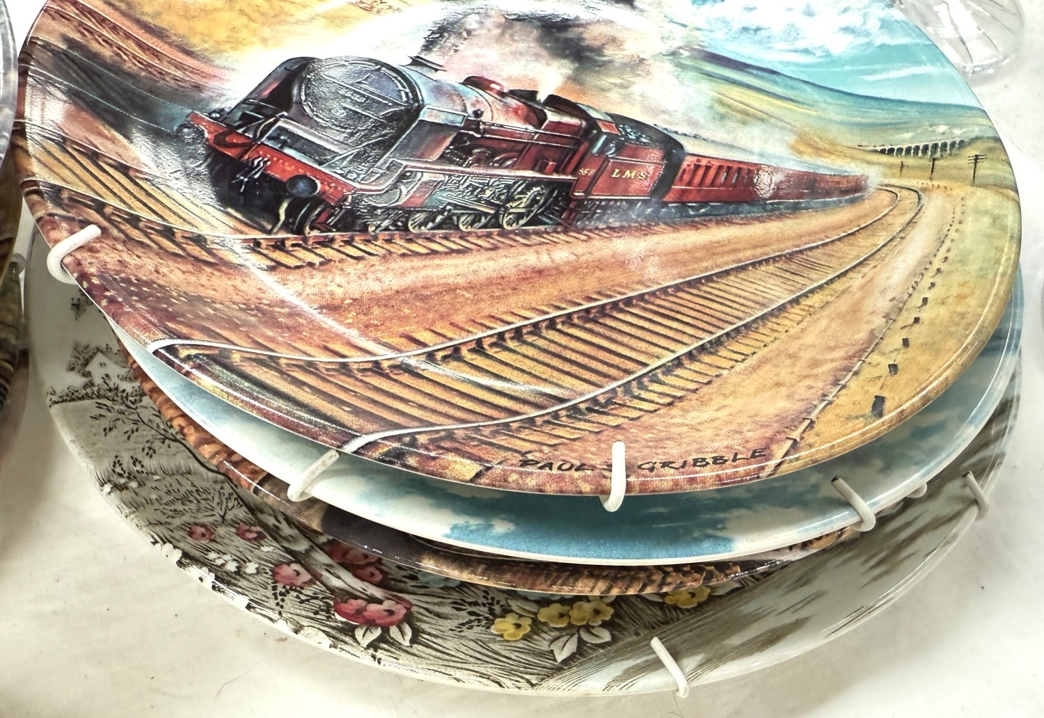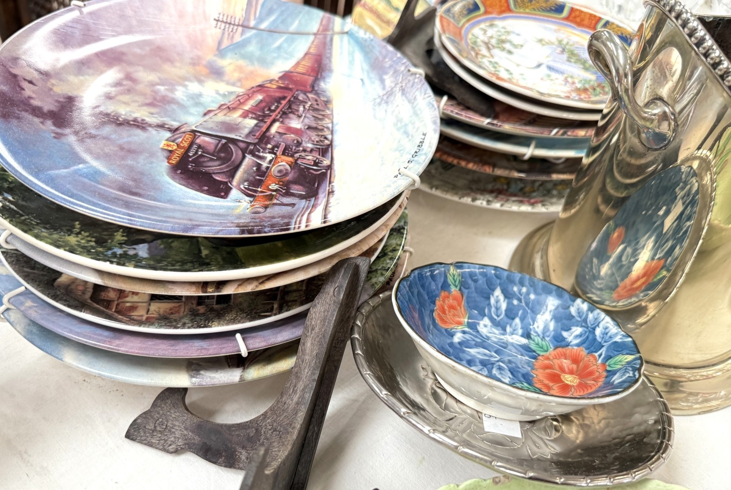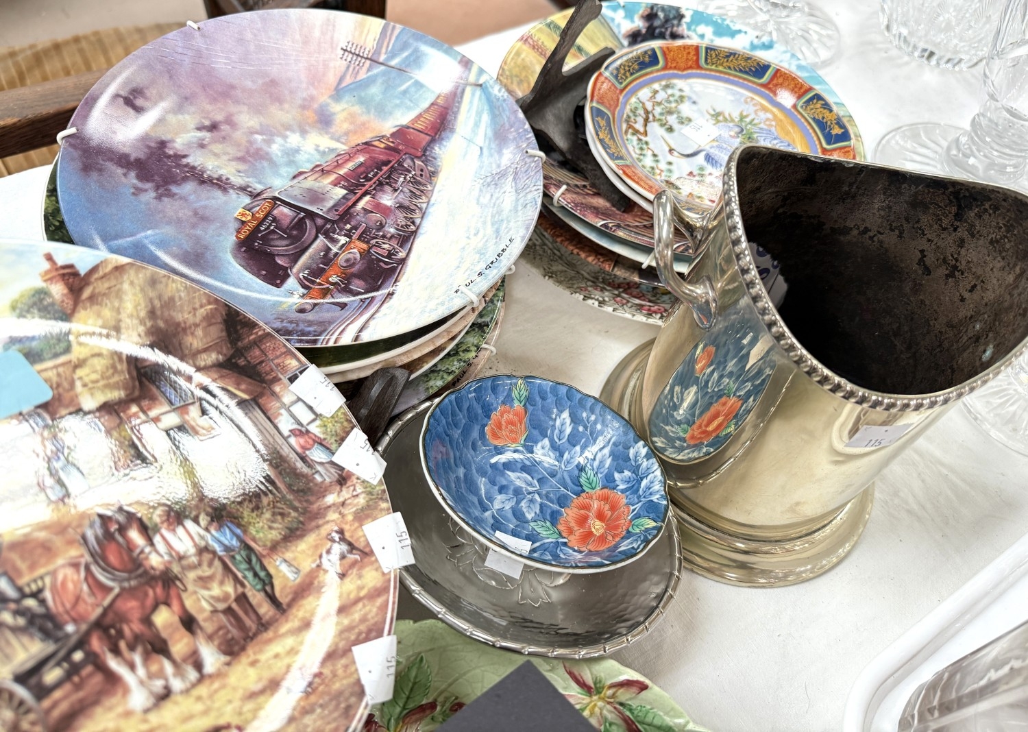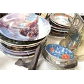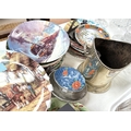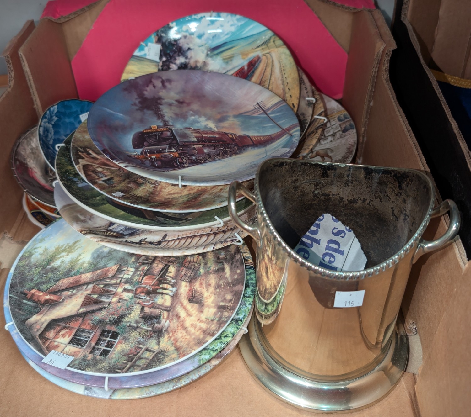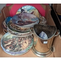 A silver plated champagne bottle holder; 11 collectors plates and other miniature and decorative china.