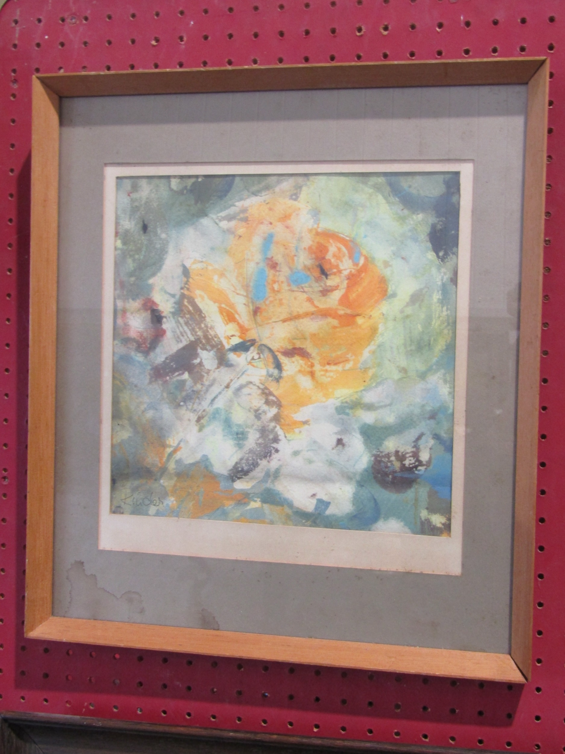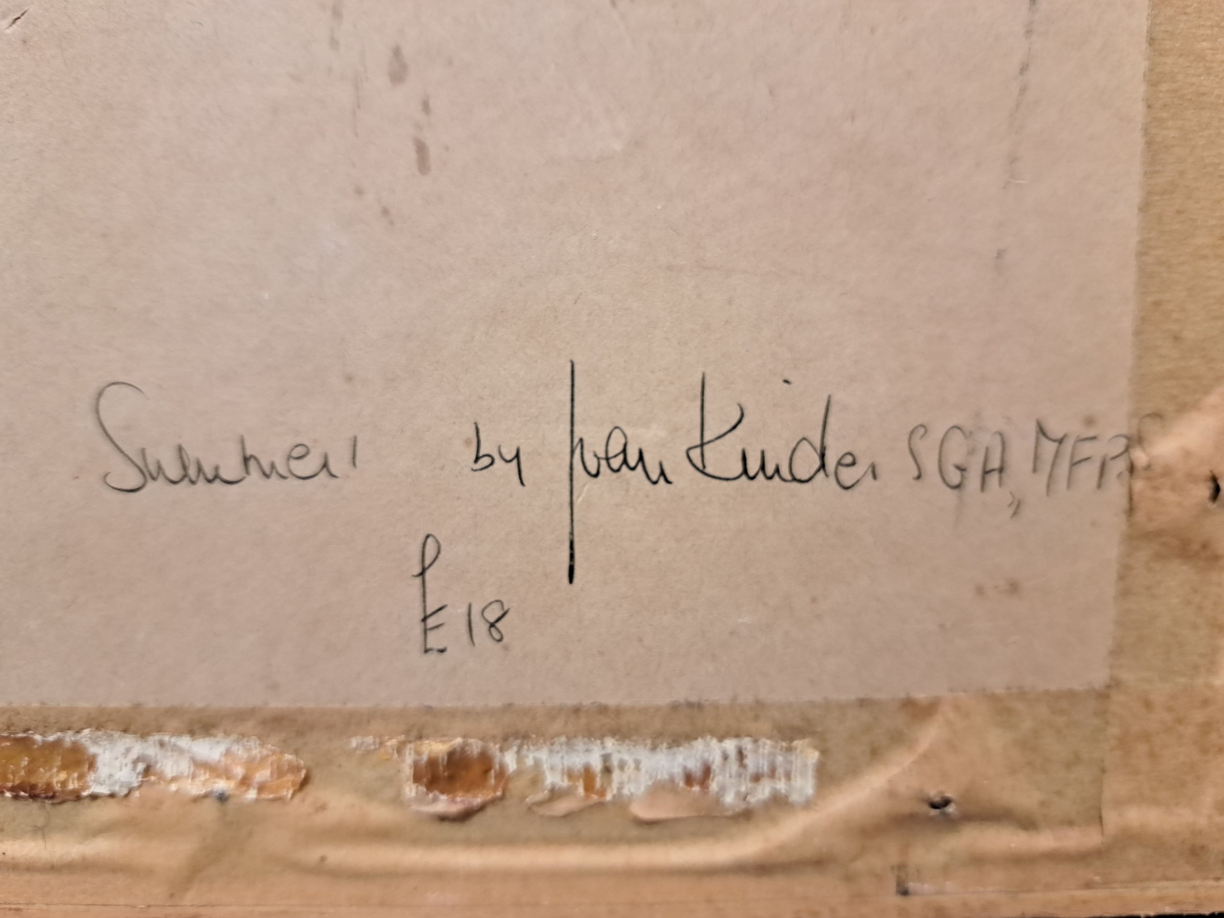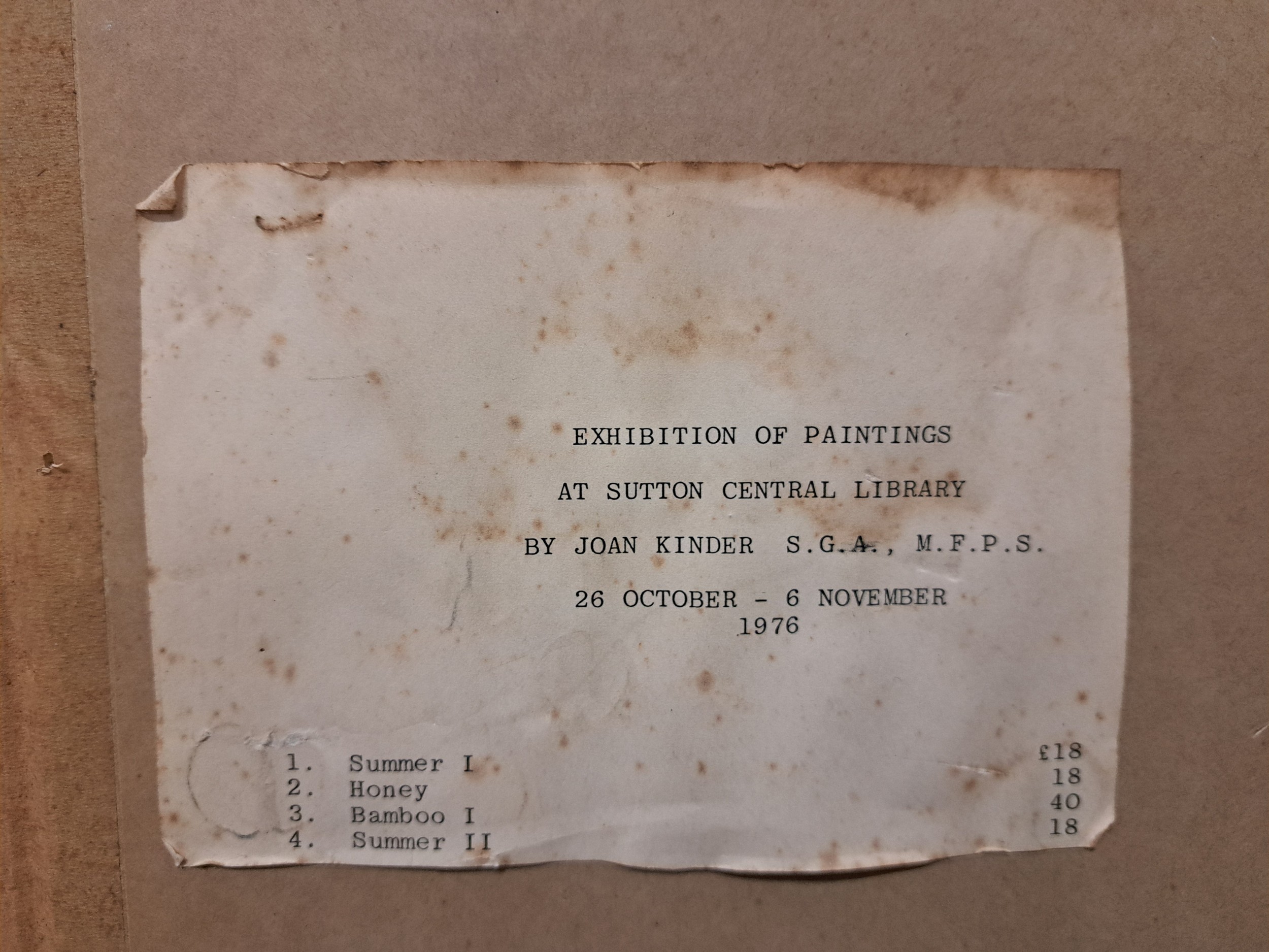 JOAN KINDER S.G.A. M.F.P.S (1916-2005): A framed and glazed watercolour of a rose, titled "Summer 1", signed bottom left, image size 25cm x 25cm, Sutton Central Library Exhibition label verso