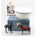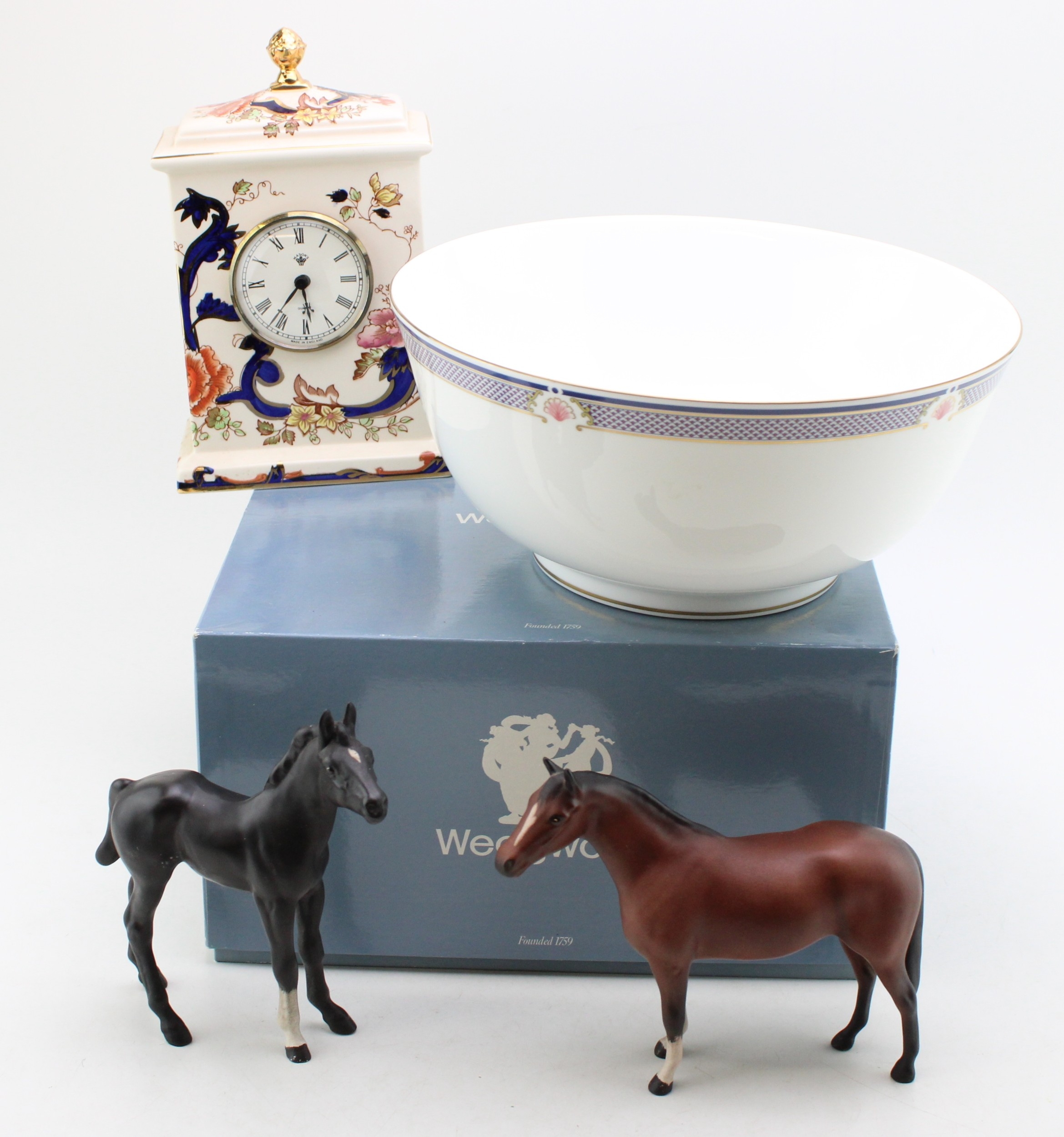 Wedgwood 'Waverley' 10" bowl in box together with two Beswick horses and a Mason's Mandalay clock, (4).