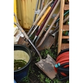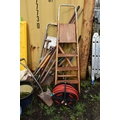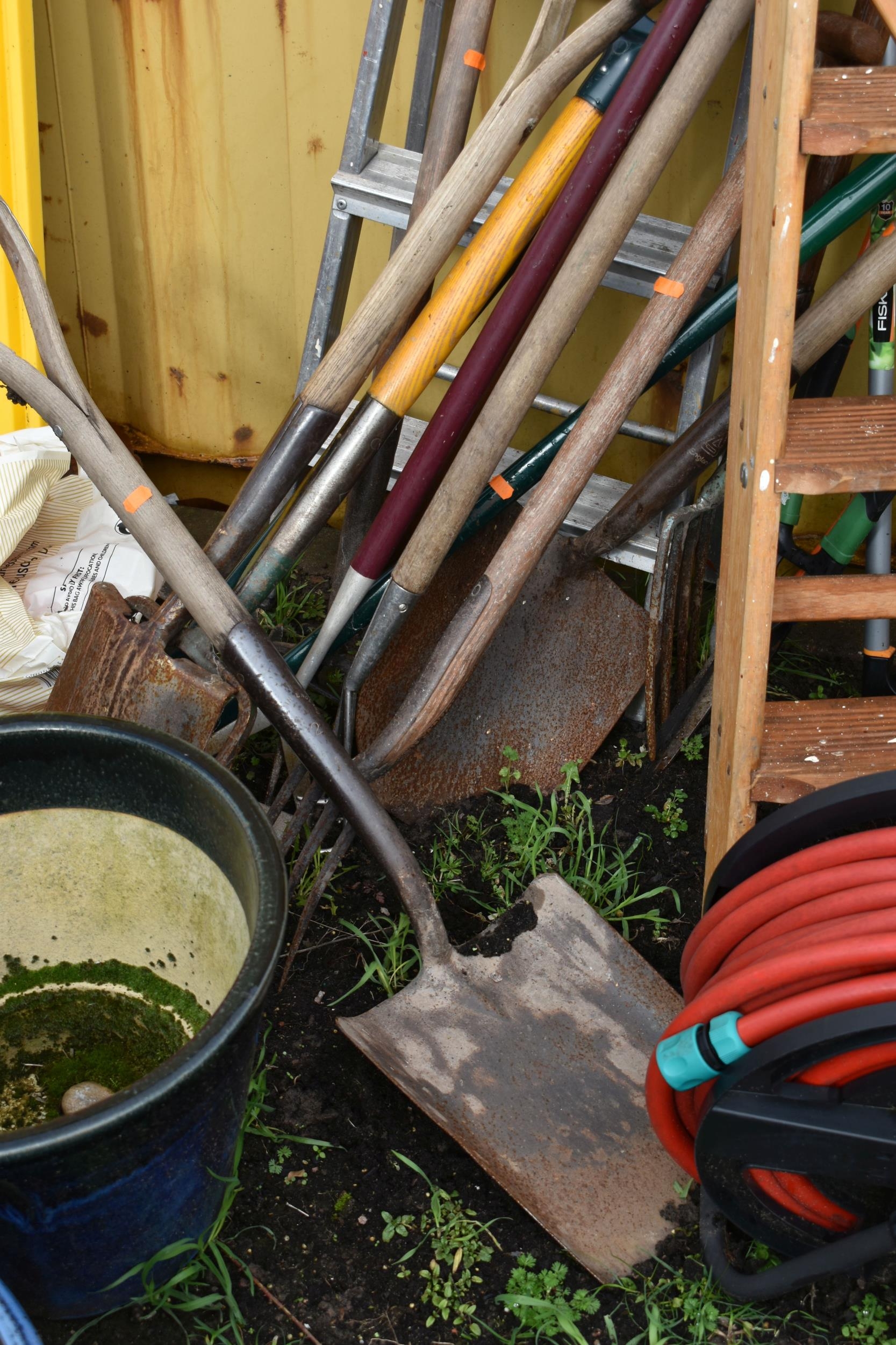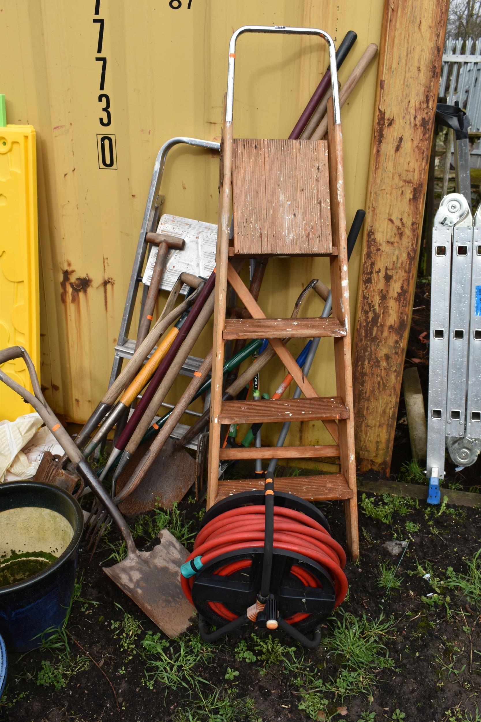 A COLLECTION OF GARDEN TOOLS AND STEP LADDERS including a modern wooden step ladder, height 154cm, a smaller set of aluminium steps, a hose reel, forks, spades etc (15+)