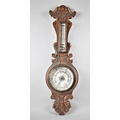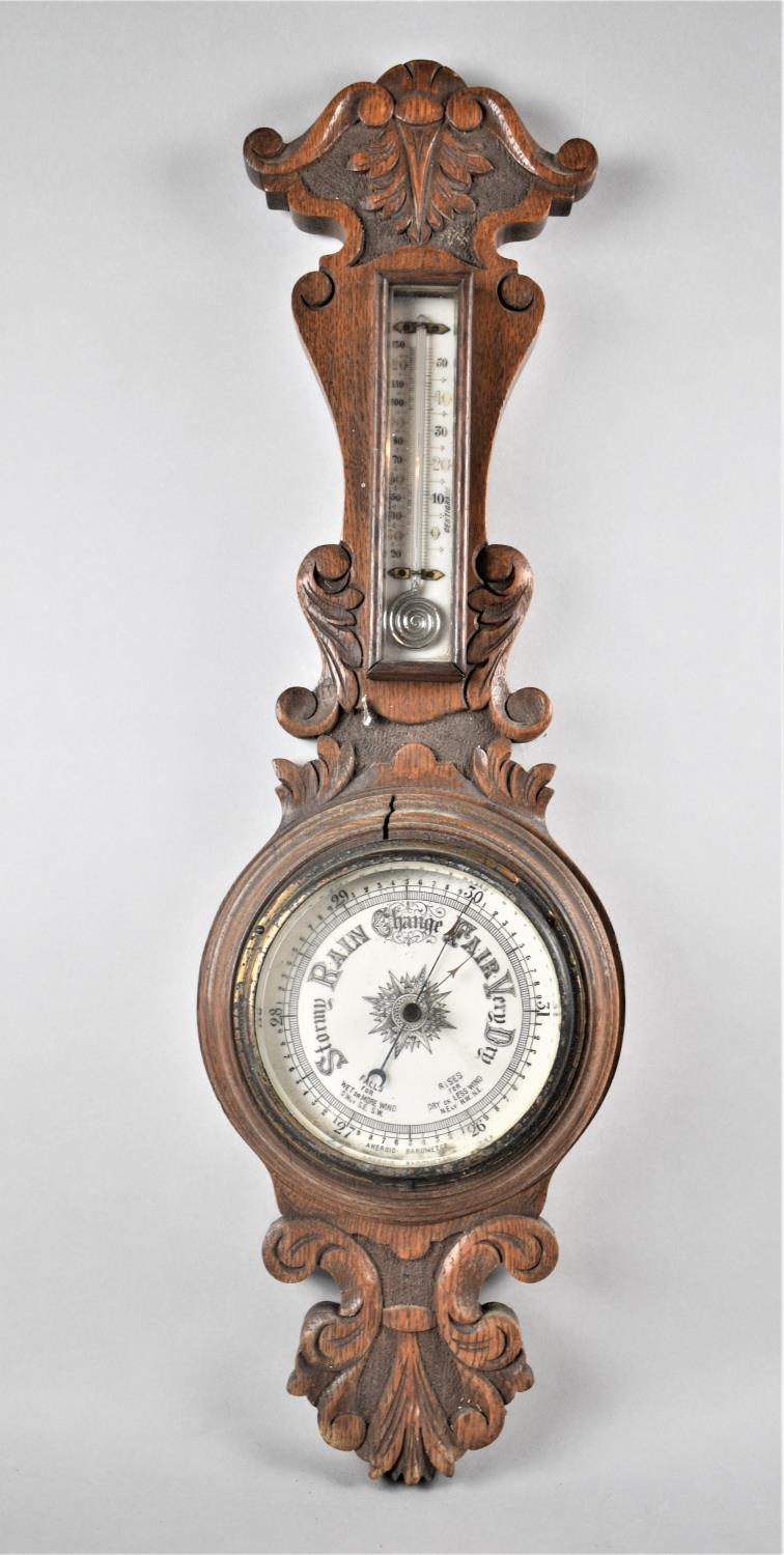 A Late Victorian Carved Oak Aneroid Wheel Barometer with Temperature Scale, 62cm High