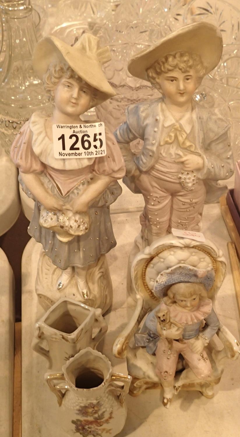 Three continental bisque hand painted figurines and two miniature vases. No visible cracks or chips to the pair of figures but staining to the lower section of the male statue. Pair H: 29 cm each. Not available for in-house P&P, contact Paul O'Hea at Mailboxes on 01925 659133