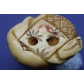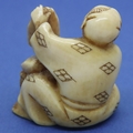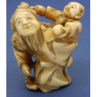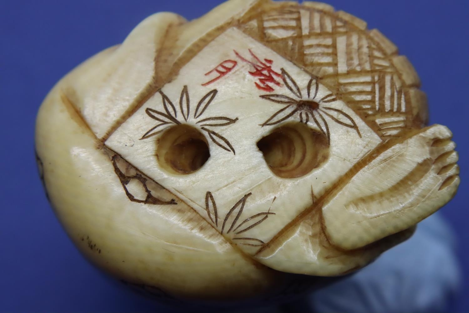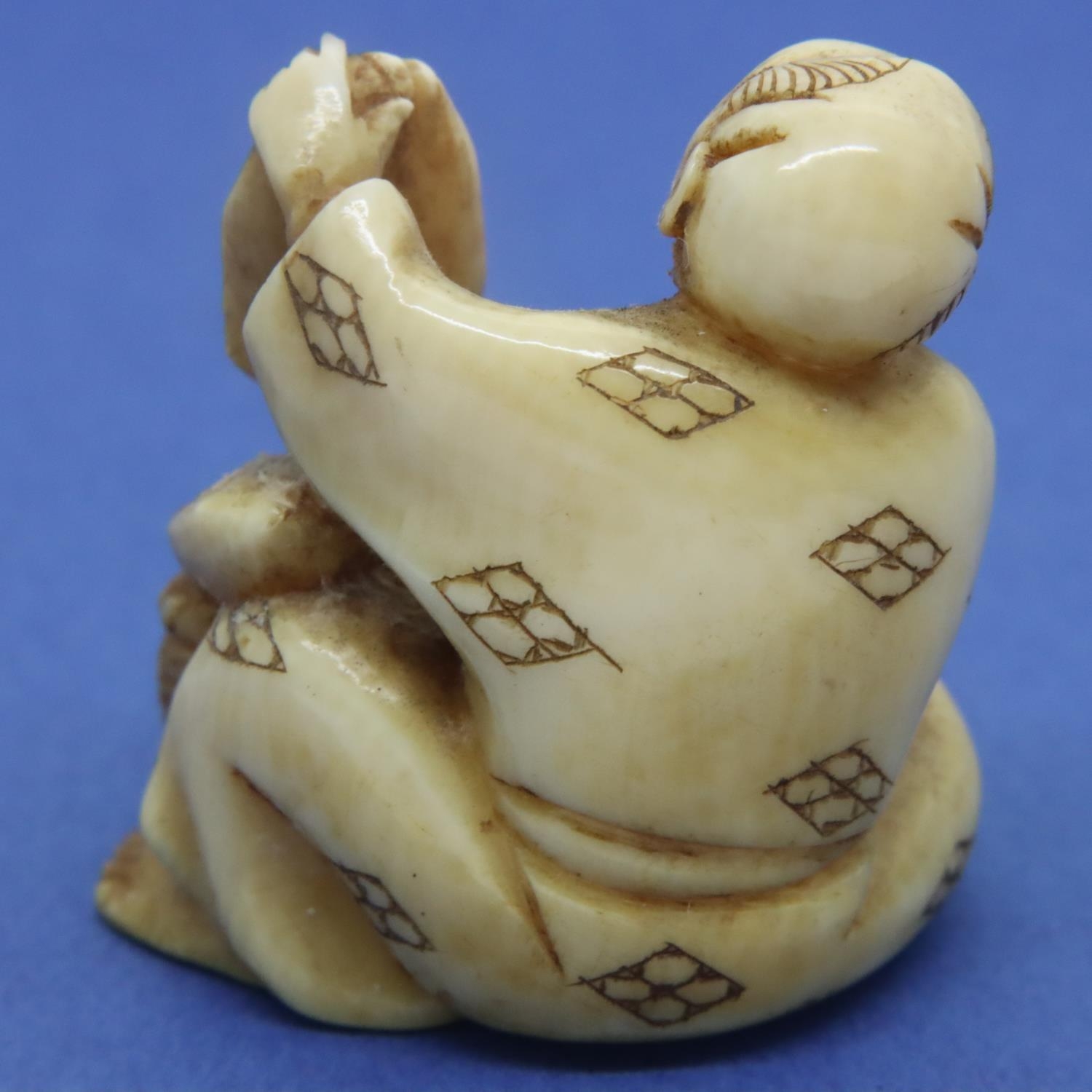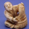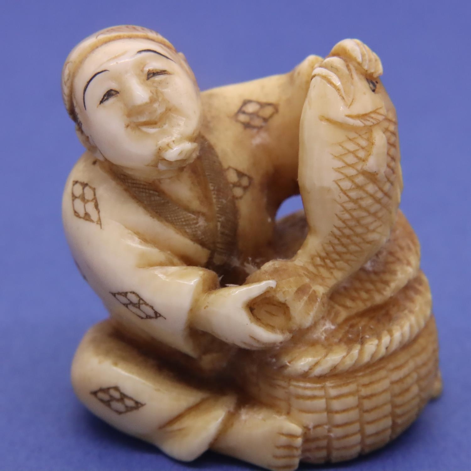 Ivory carved netsuke in the form of a street fish vendor with a basket and two fish, H: 36 mm, signed to base. P&P Group 1 (£14+VAT for the first lot and £1+VAT for subsequent lots)