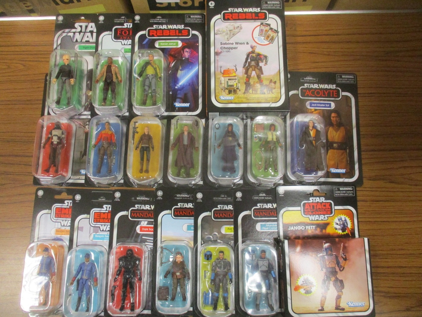 Star Wars. Hasbro. Range of The Vintage Collection figures, generally mint in near mint bubble packs, includes figures from Ahsoka, The Acolyte, The Mandalorian, etc. Qty 18 (½B)
