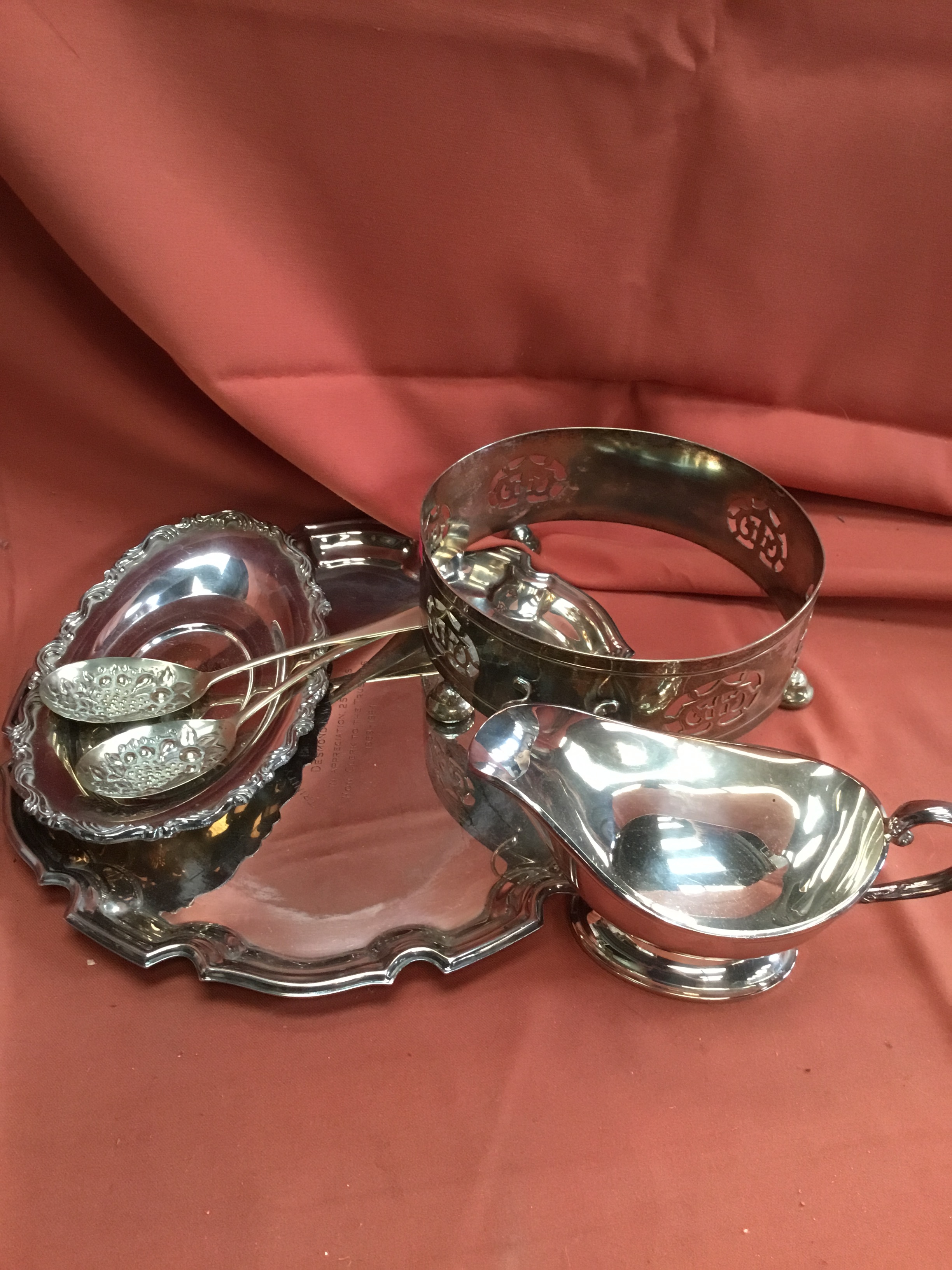 Silver plated lot inc trays, gravy jug & spoons