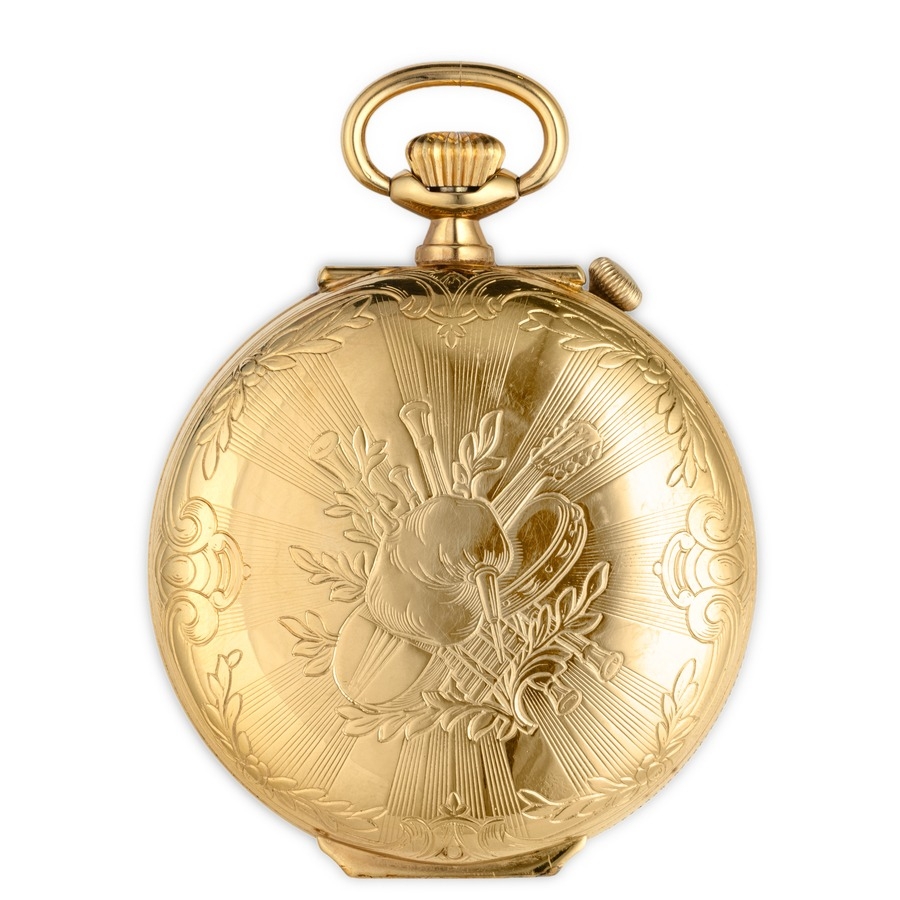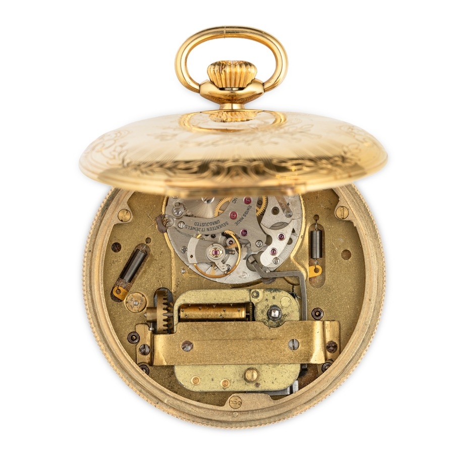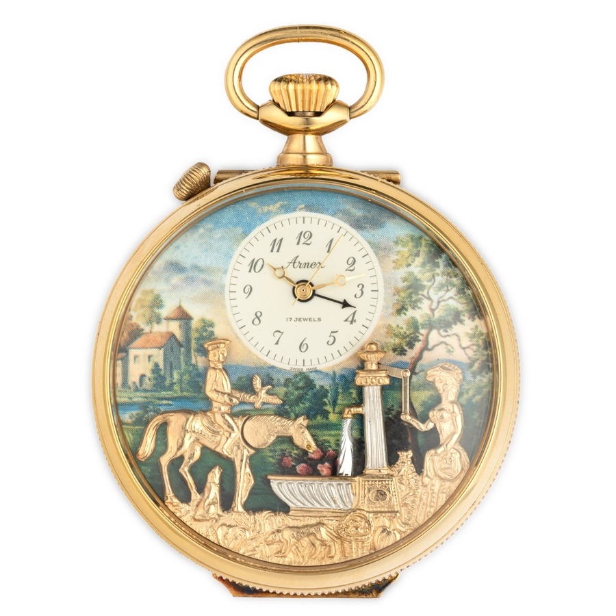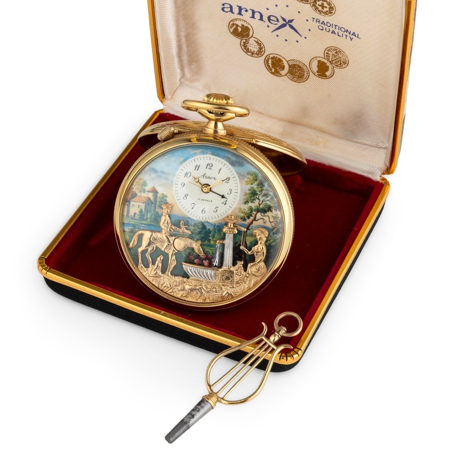 ARNEX REUGE, OROLOGIO DA TASCA CON AUTOMI E CARILLON MUSICALE, CON COFANETTO E CHIAVE, SVIZZERA 1985