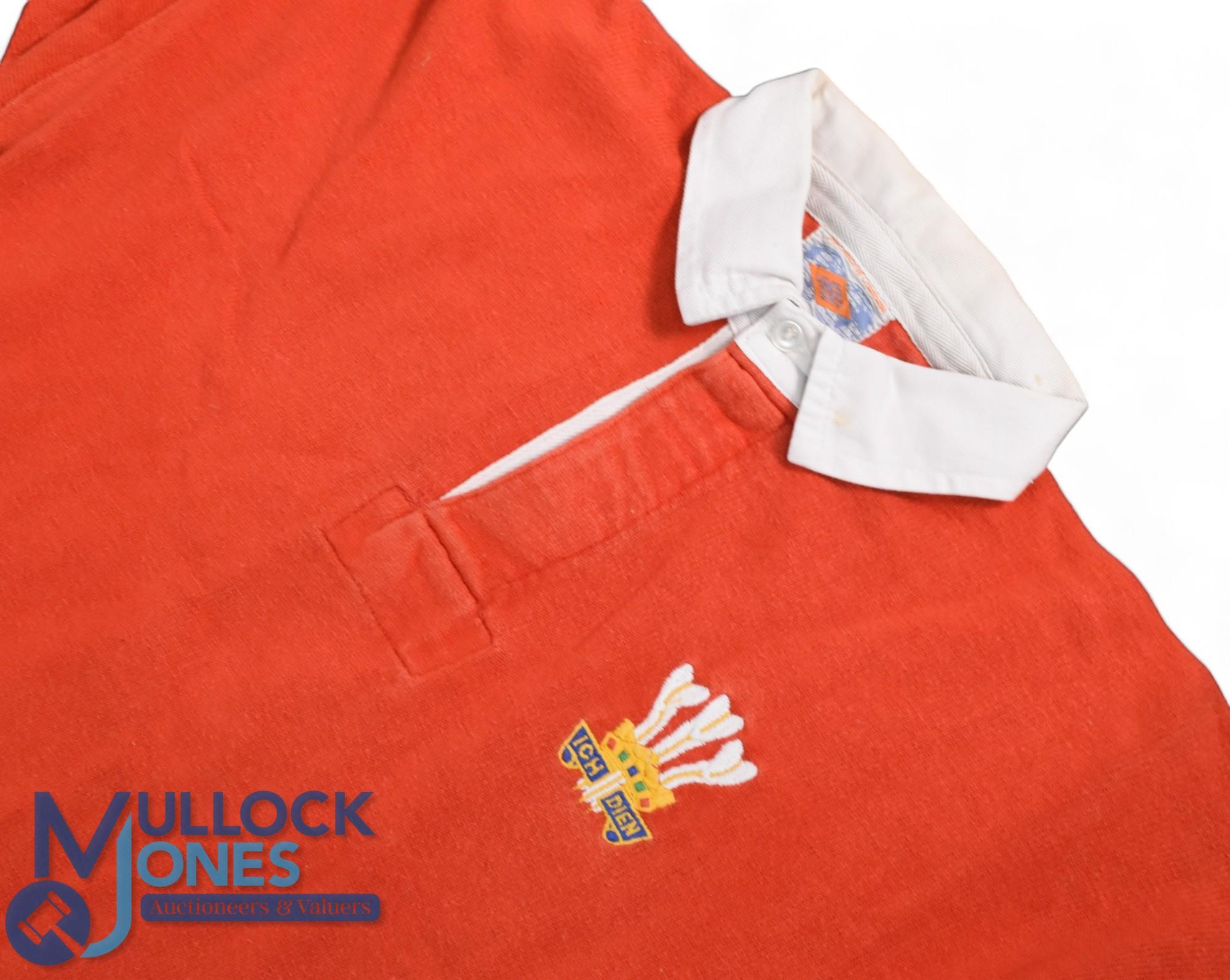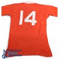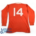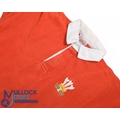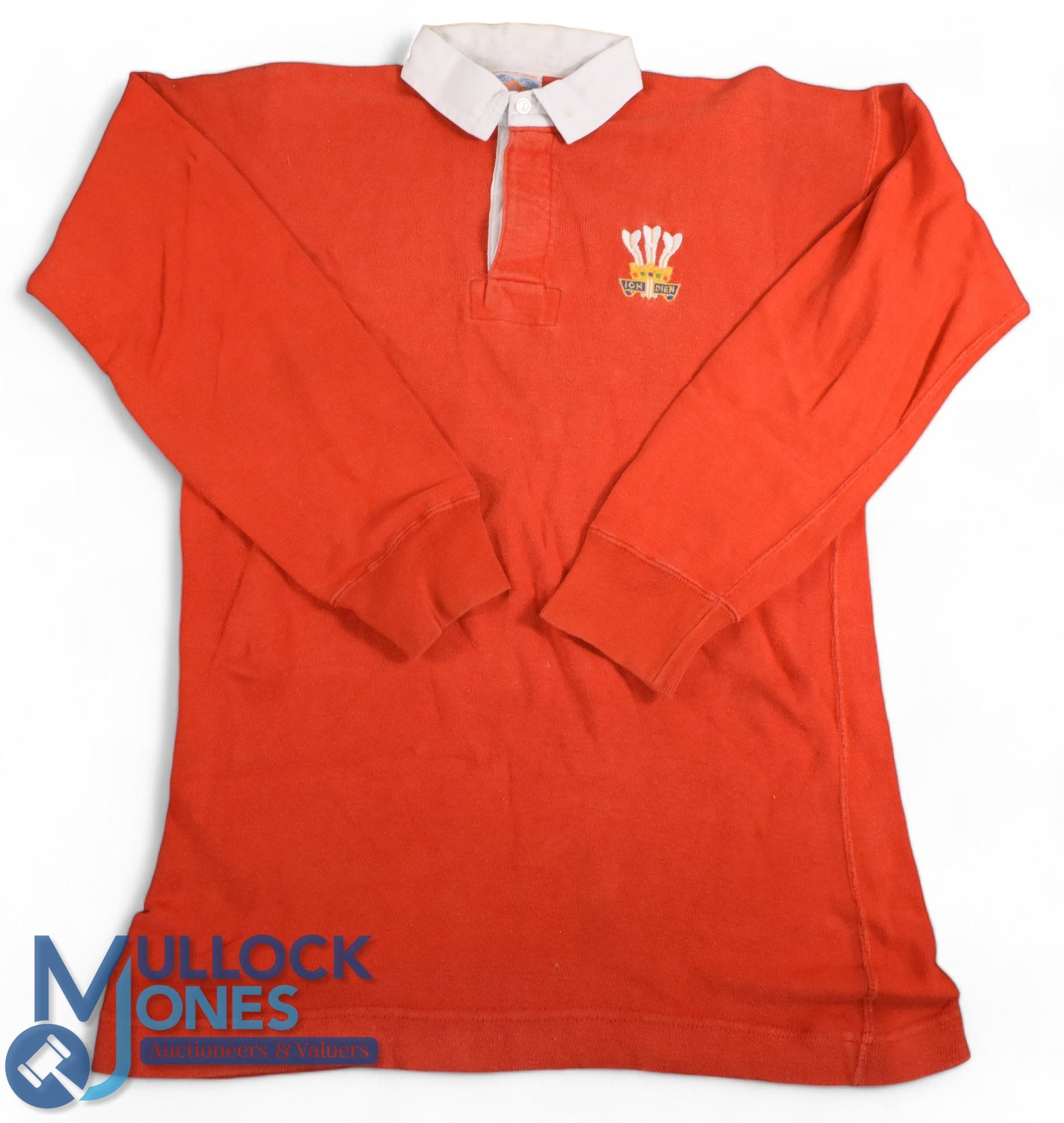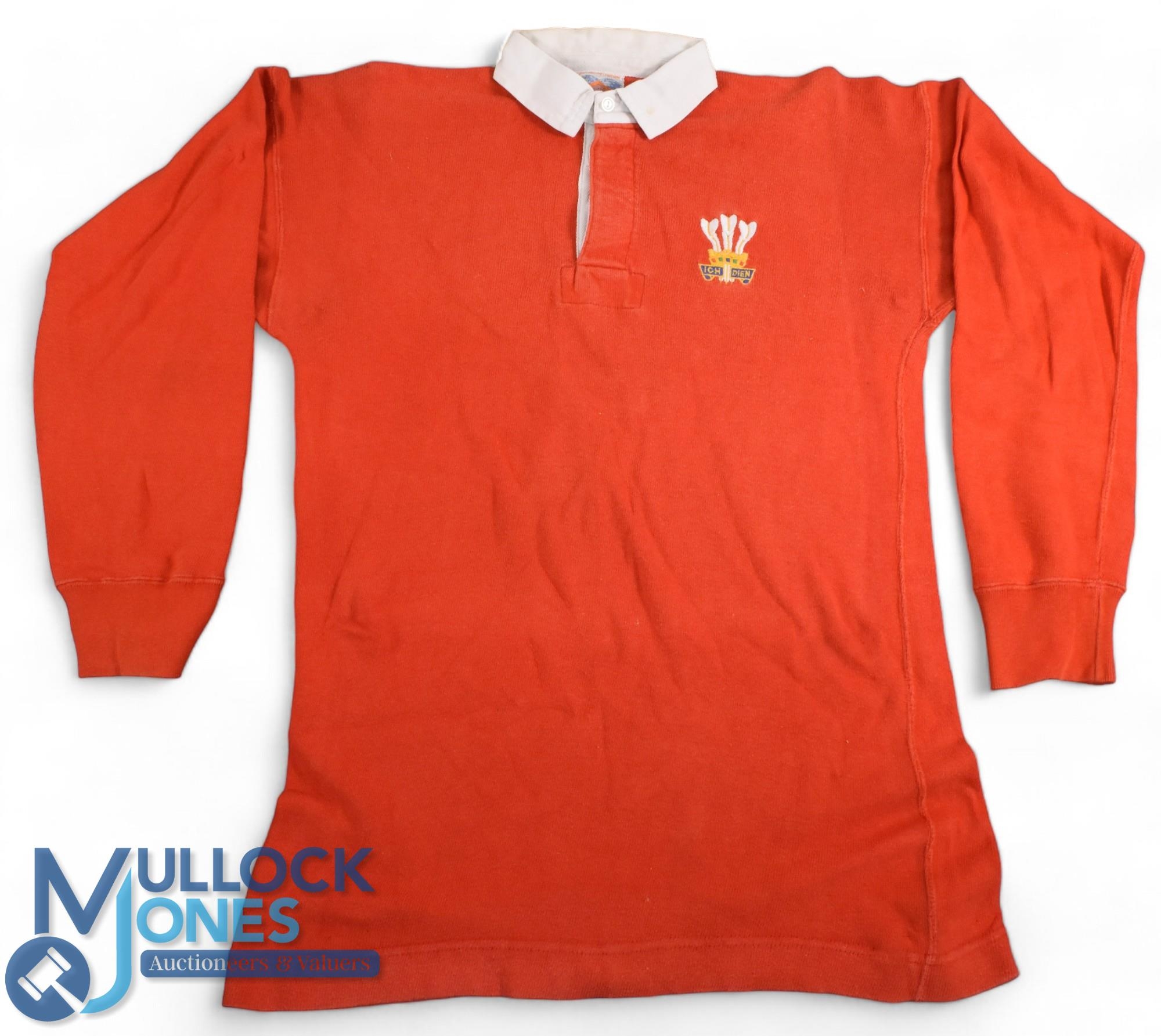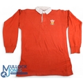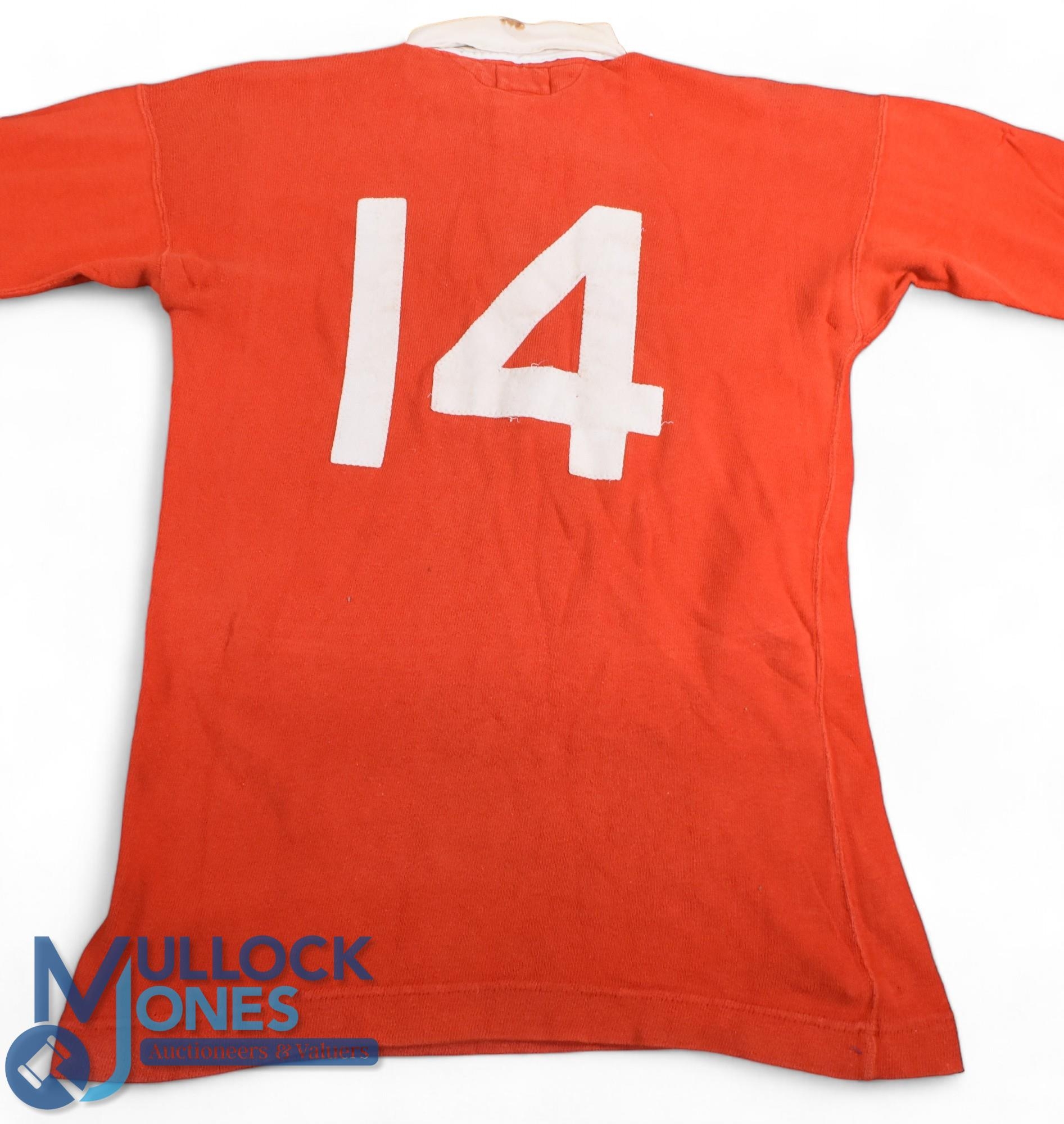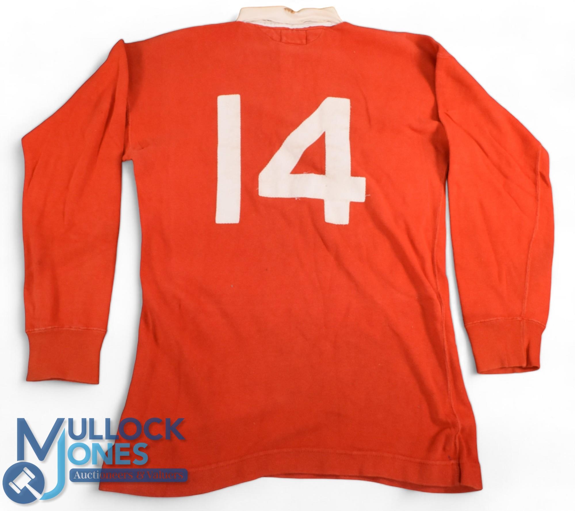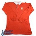 1973 Gerald Davies Matchworn Welsh Rugby Jersey: Rarely-seen matchworn memorabilia from the legendary wing and later manager of the Lions and President of the WRU. Umbro make, scarlet classic style with three feathers to chest and white no.14 to rear. Very desirable, VG