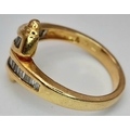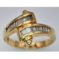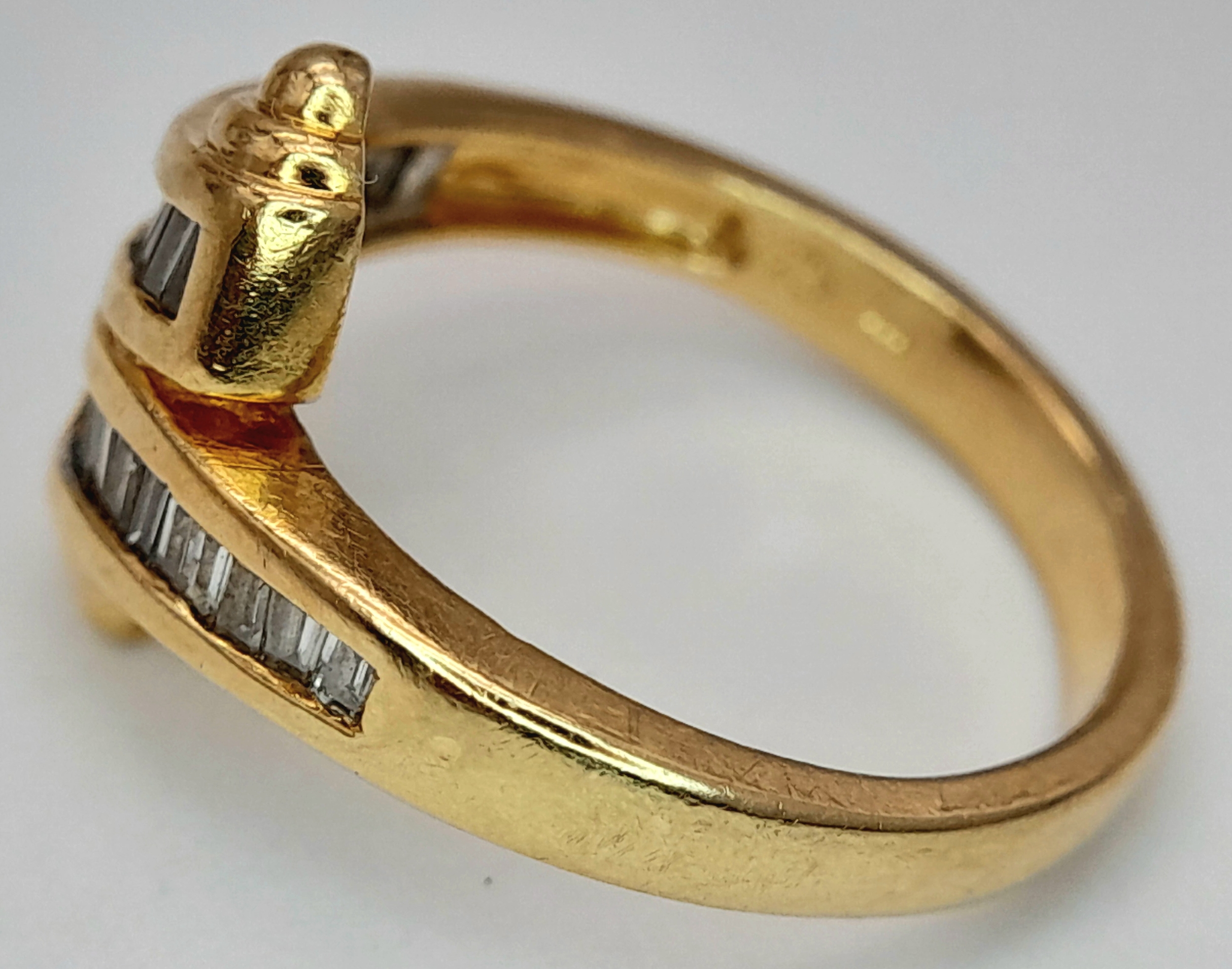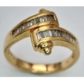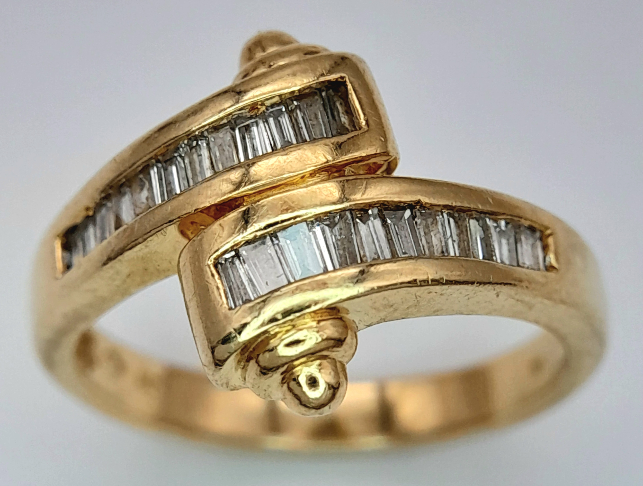 A 14K YELLOW GOLD FANCY BAGUETTE DIAMOND SET CROSSOVER RING. DIAMOND WEIGHT 0.25CT. TOTAL WEIGHT 3.8G. SIZE M. SC 8057