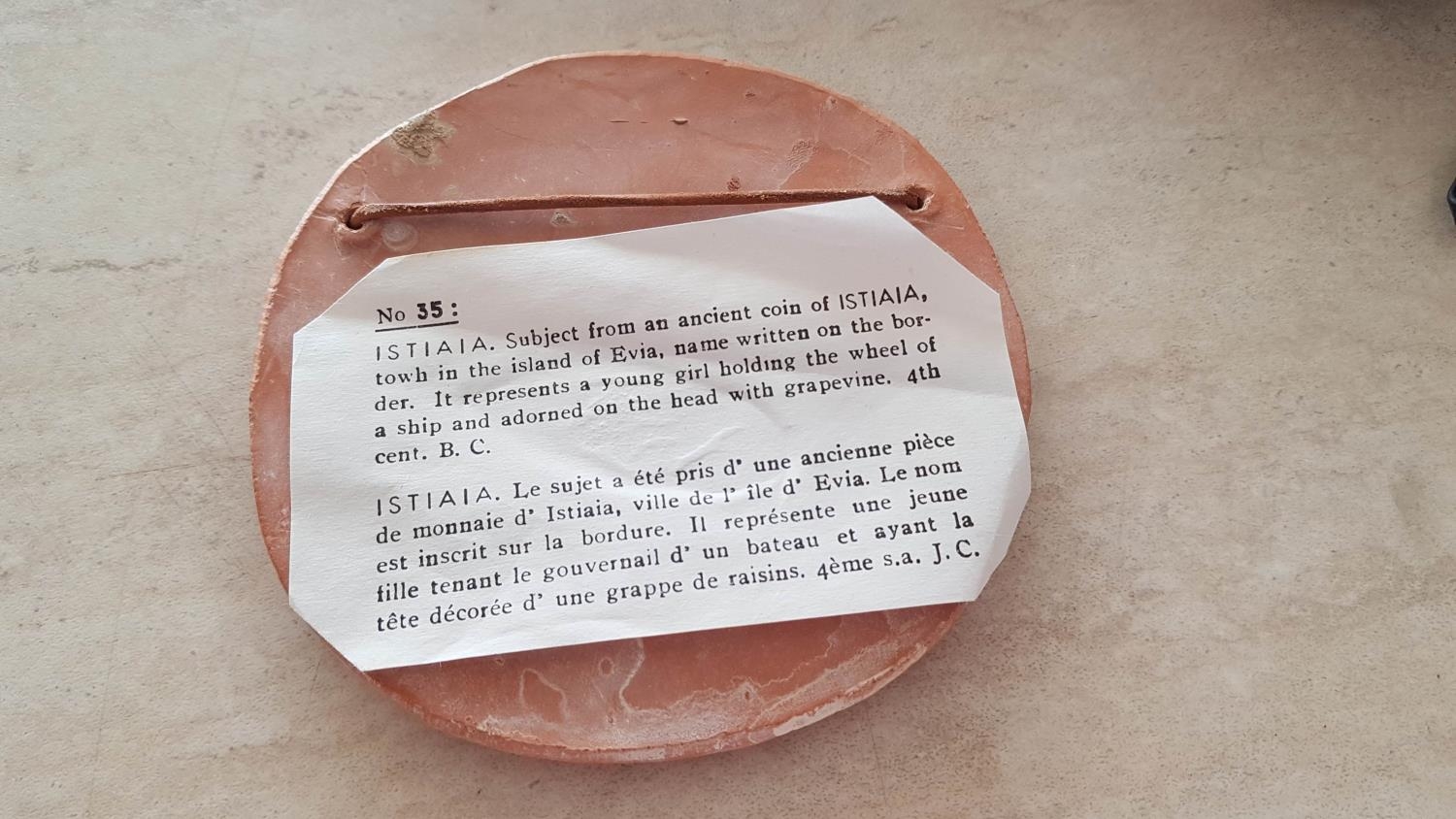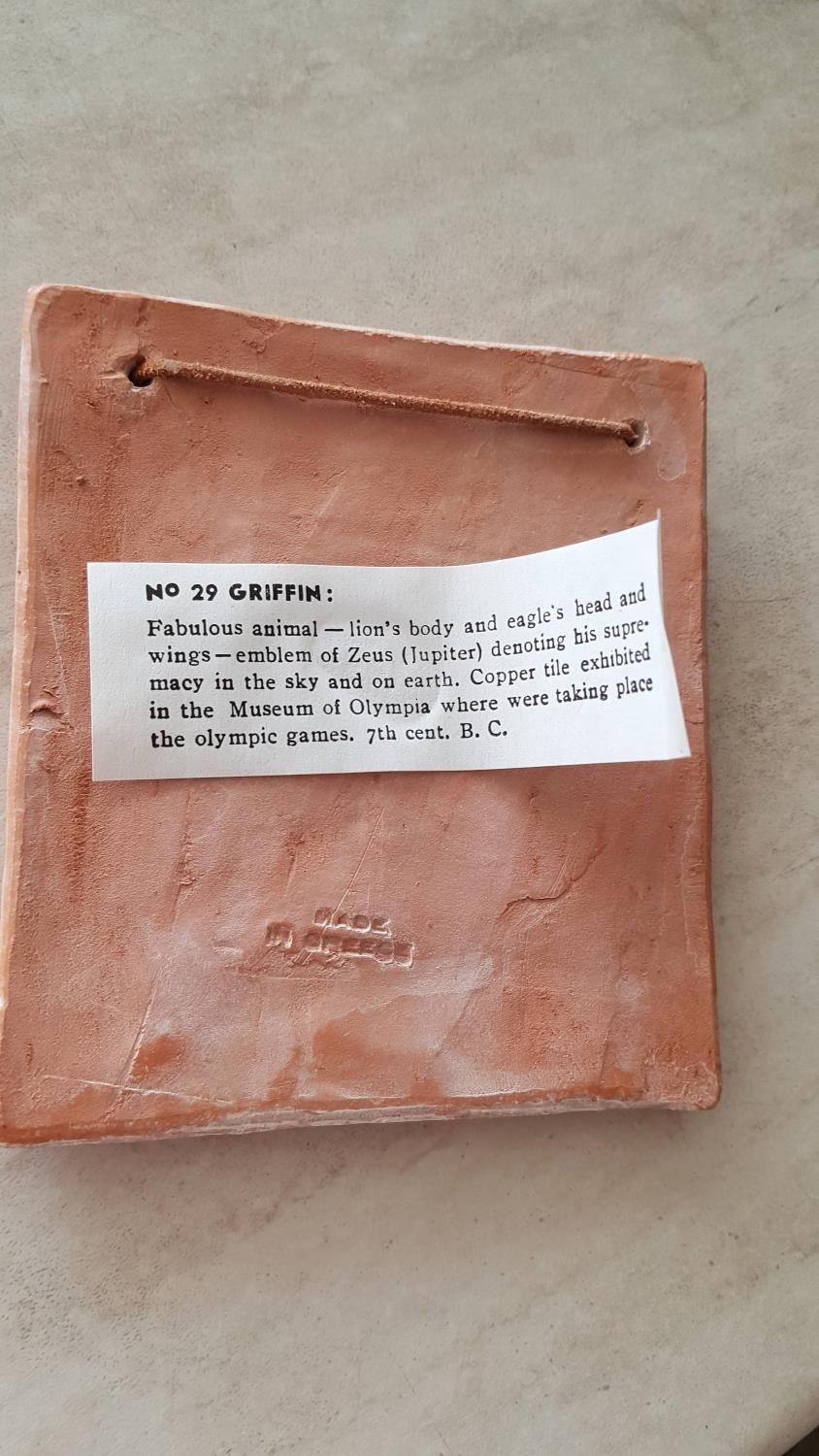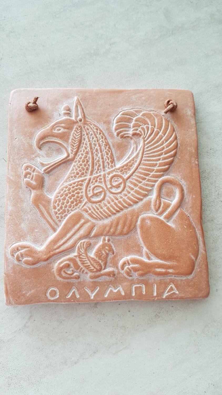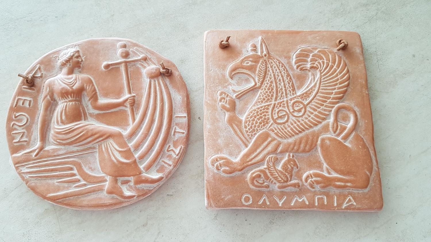 2 x Hand Made Terracotta Souvenirs Museum of Olympia, Ancient Greek Emblems; Griffin (12 x 13cm) and Istaiaia (Ø:12.5cm), (2)
