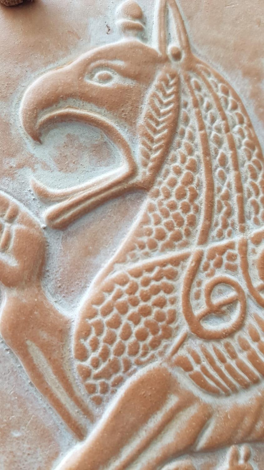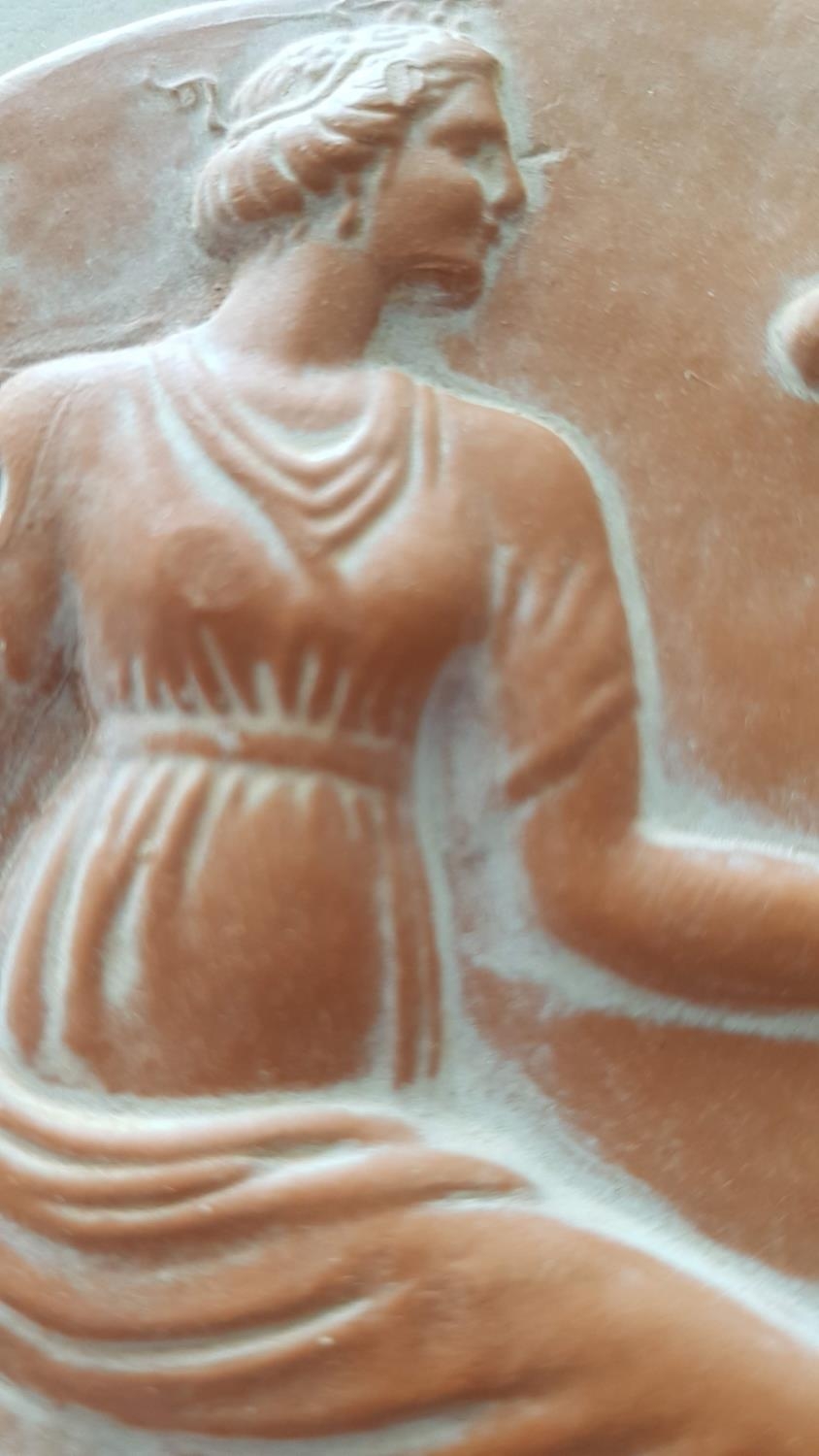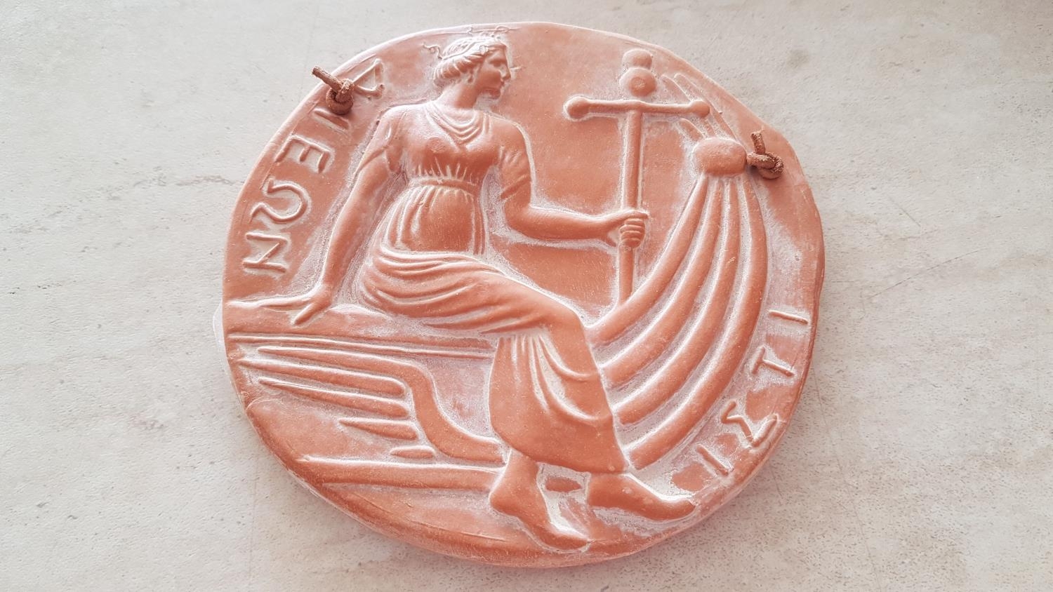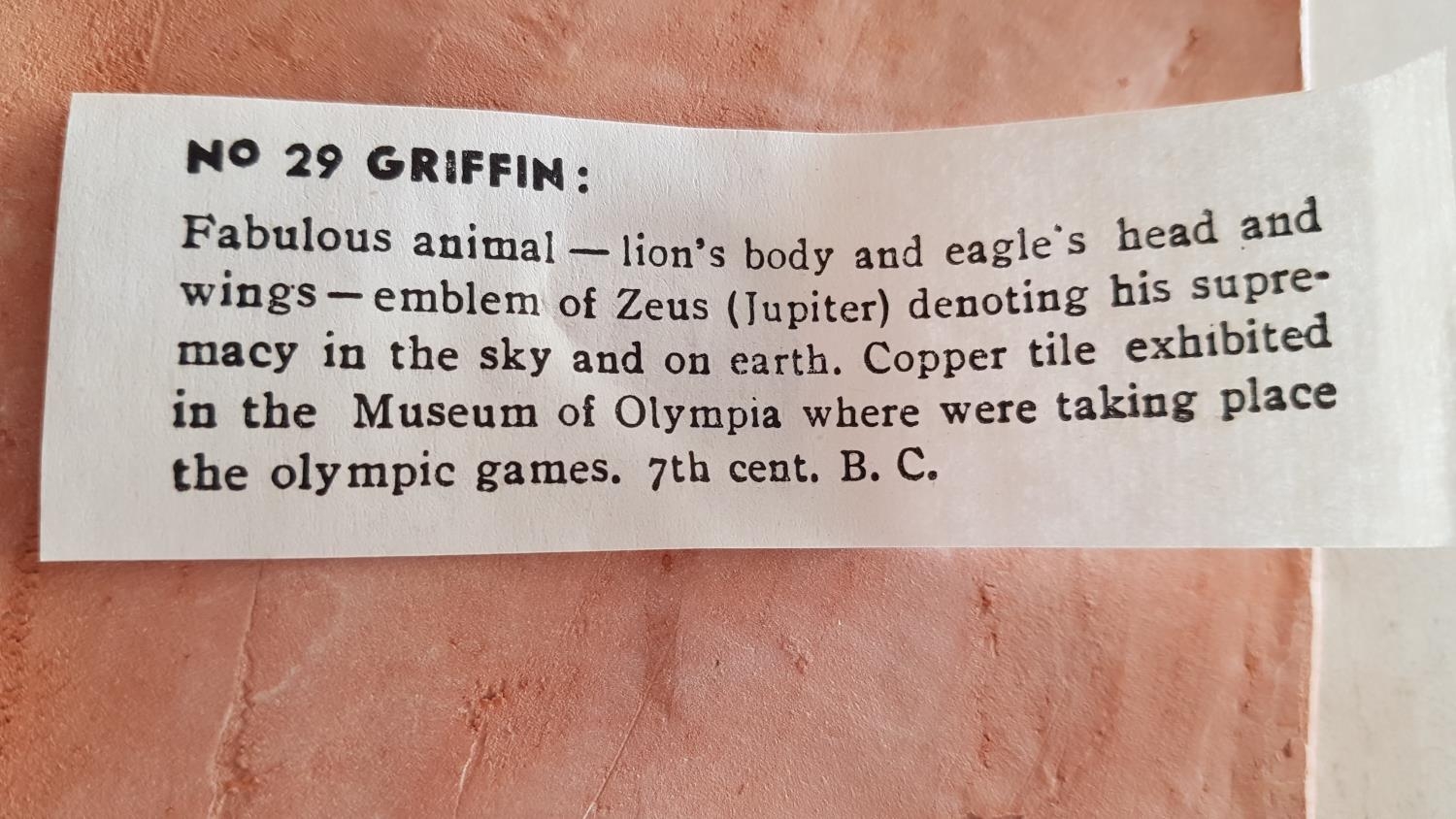 2 x Hand Made Terracotta Souvenirs Museum of Olympia, Ancient Greek Emblems; Griffin (12 x 13cm) and Istaiaia (Ø:12.5cm), (2)