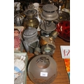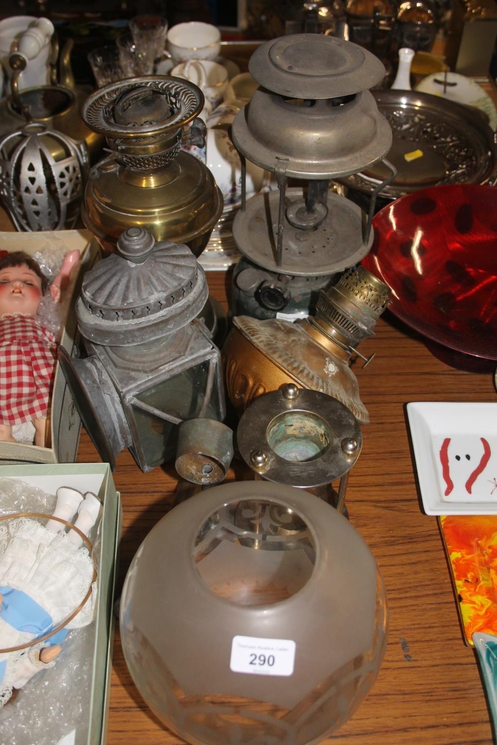 Brass paraffin lamp with glass shade, etc.