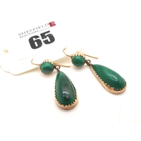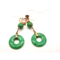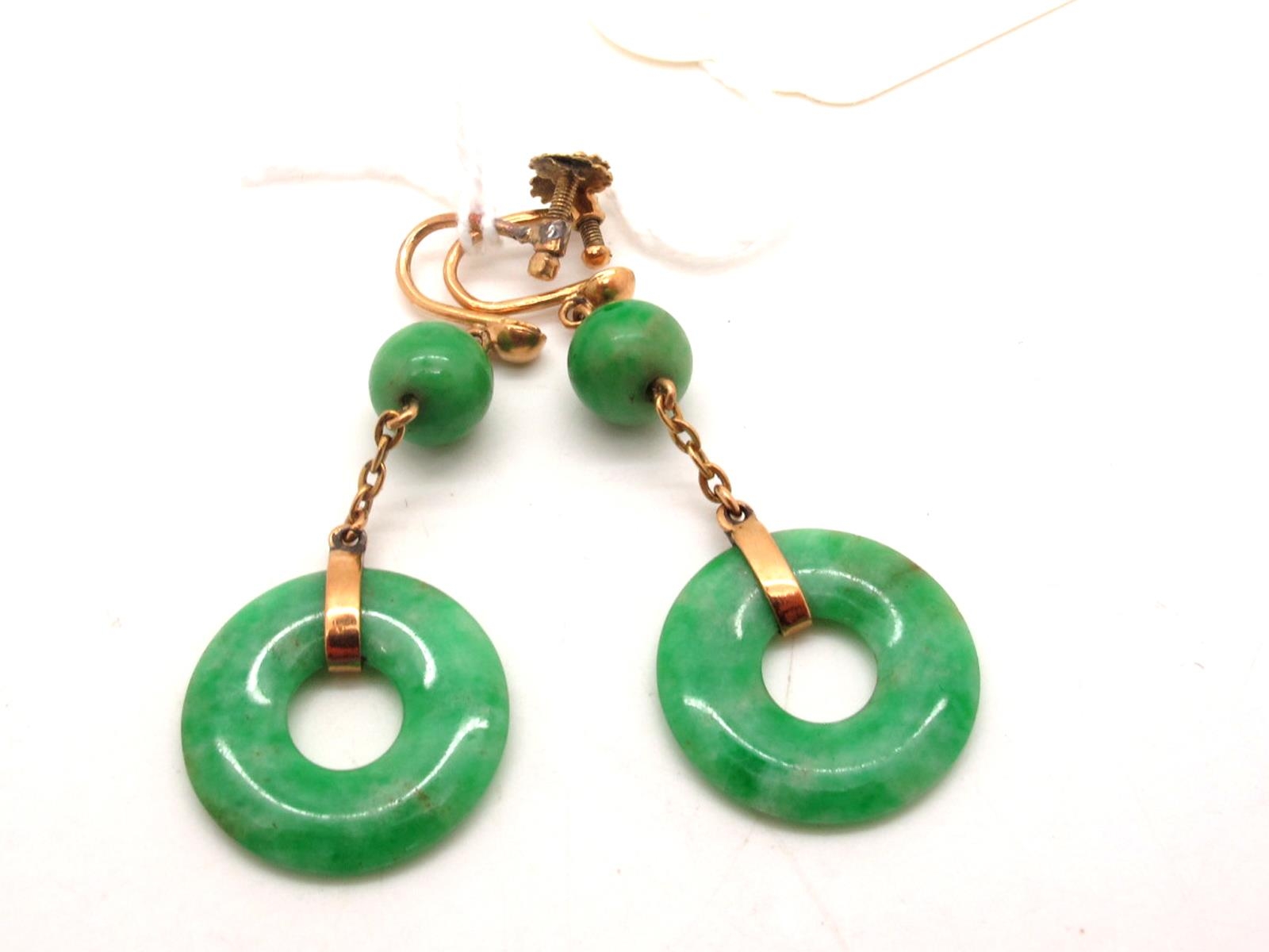A Pair of c. Early XX Century Green Jade Drop Earrings, each on unpierced screw fitting.