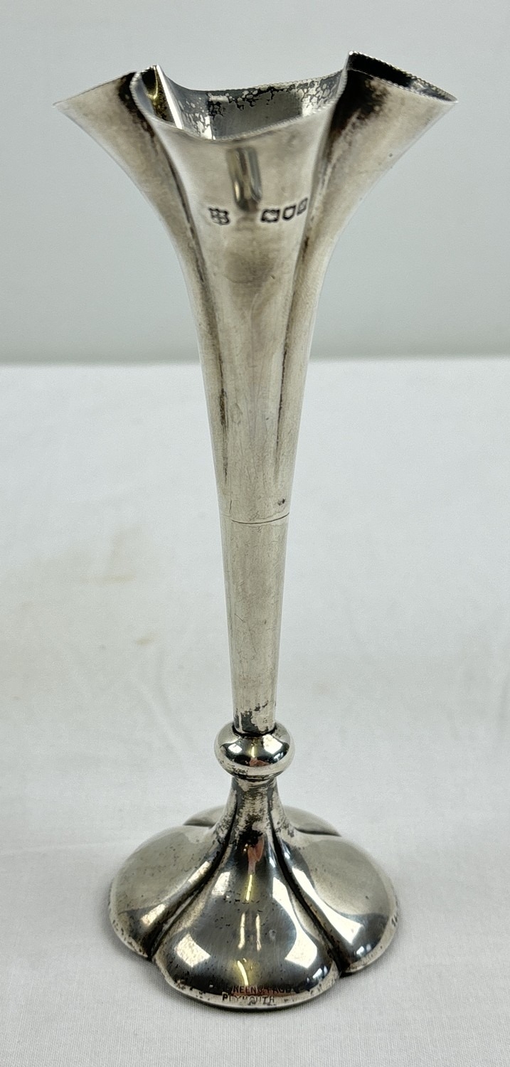 An early Edwardian silver fluted bud vase with weighed base and beaded rim. Hallmarked for London 1902 with Page, Keen & Page makers mark. Also stamped to rim of base Page, Keen & Page, Plymouth and with model number and registered number. Approx. 17cm tall.