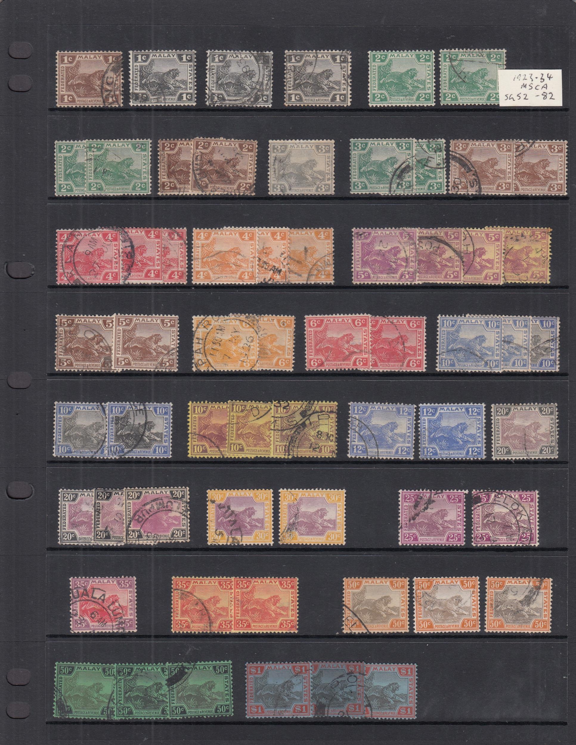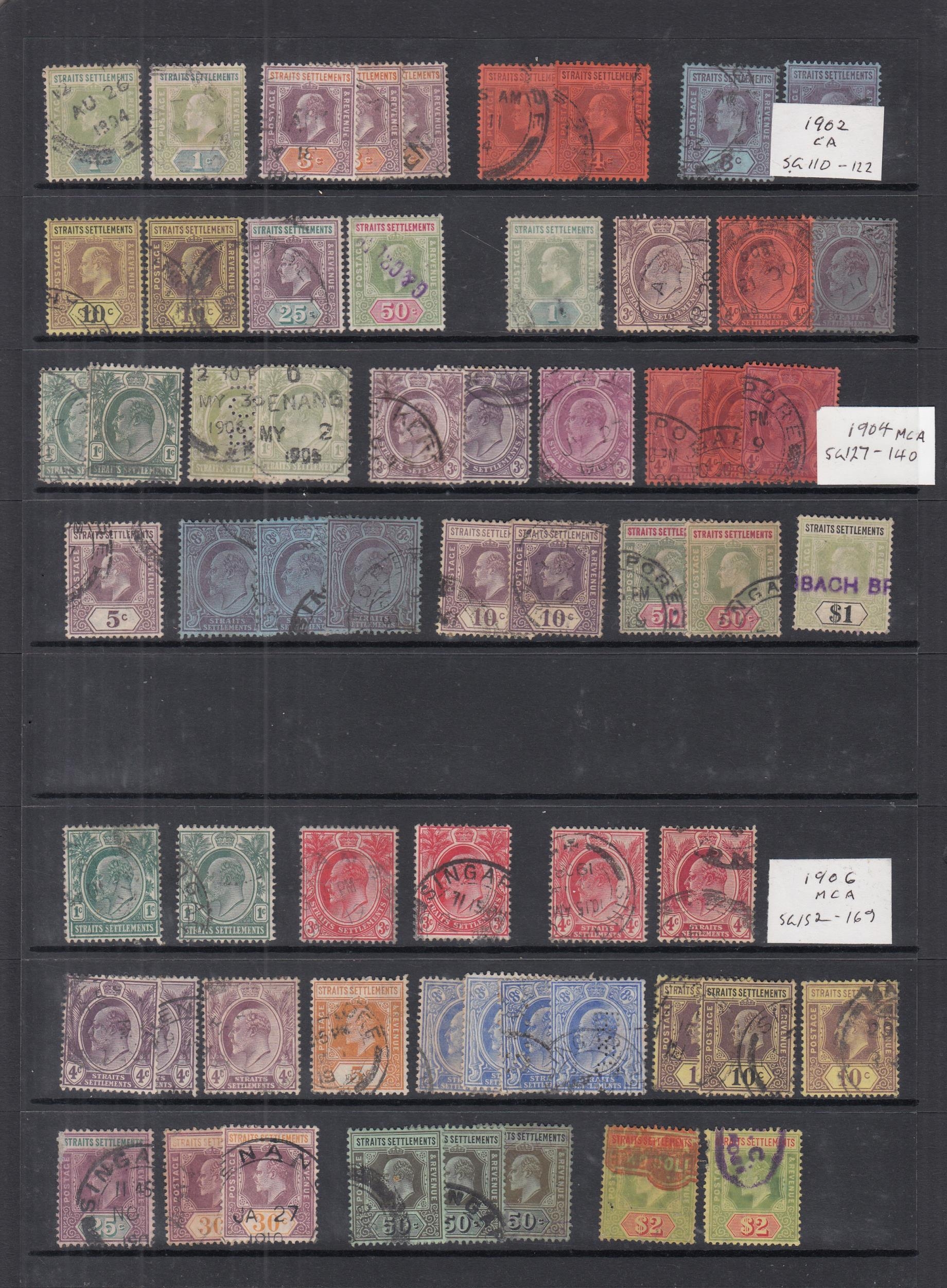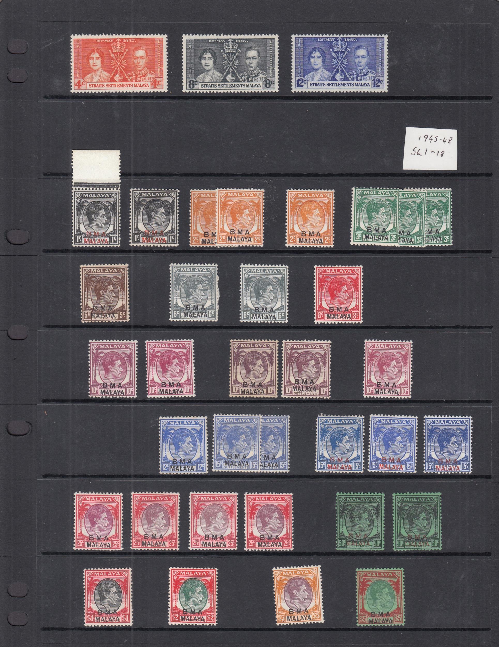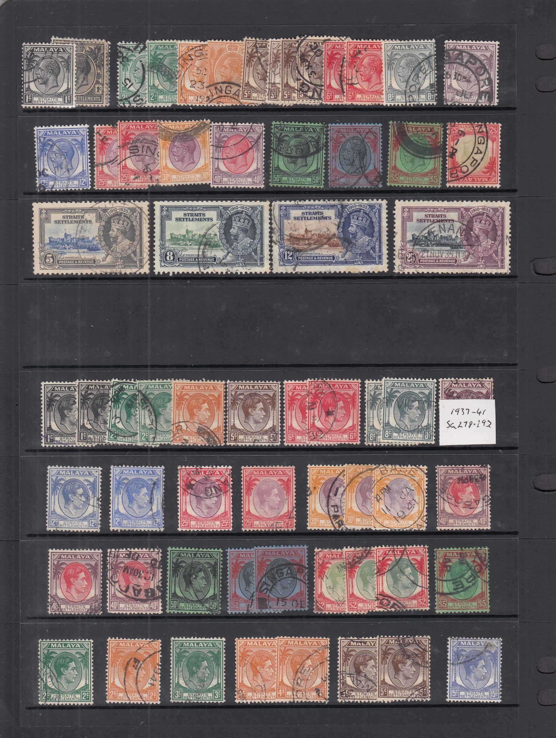 QV/KGVI collectors mint & used accumulation on cards with Straits Settlements range of QV M or U, KEVII vals to 30c M, vals to 50c U, KGV various M plus 1912 vals to $1 & $5 U, 1921 vals to $2 x 3 & $5 U, 1936 vals to $1 & $5 U, 1937/41 set U, BMA 1945 set plus shades M, FMS 1900 vals to 50c incl shades U, 1904 vals to 50c x 3 plus shades U, Singapore 1948 perf 14 & perf 17½x18 sets U, plus M vals to $1 x 2 & $2, plus various other States, condition mixed in places, with duplication, many fine, very high Cat, needs sorting (qty)