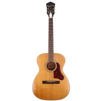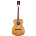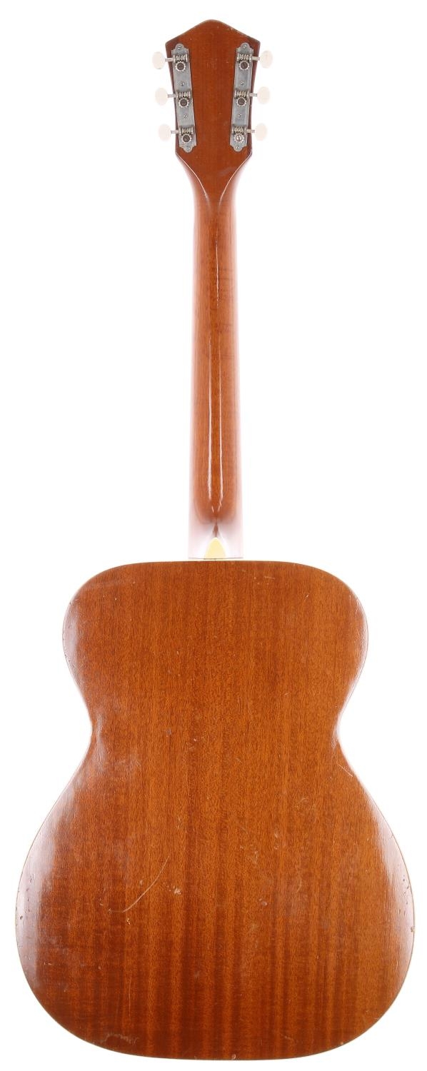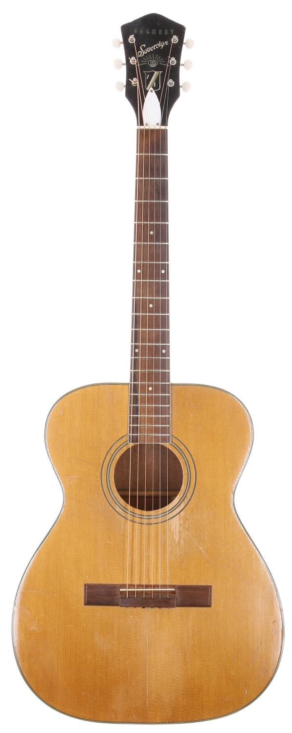 1960s Harmony Sovereign H1203 acoustic guitar, made in USA; Back and sides: mahogany, light scratches and dings throughout otherwise good for age; Top: natural spruce, repaired crack to centre top with sliver infill to lower bout, light play wear to treble side of sound hole, light checking and further minor dings; Neck: mahogany; Fretboard: good; Frets: good; Case: semi-rigid fibreboard case; Overall condition: good for age