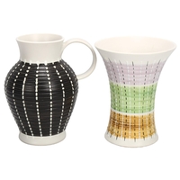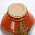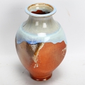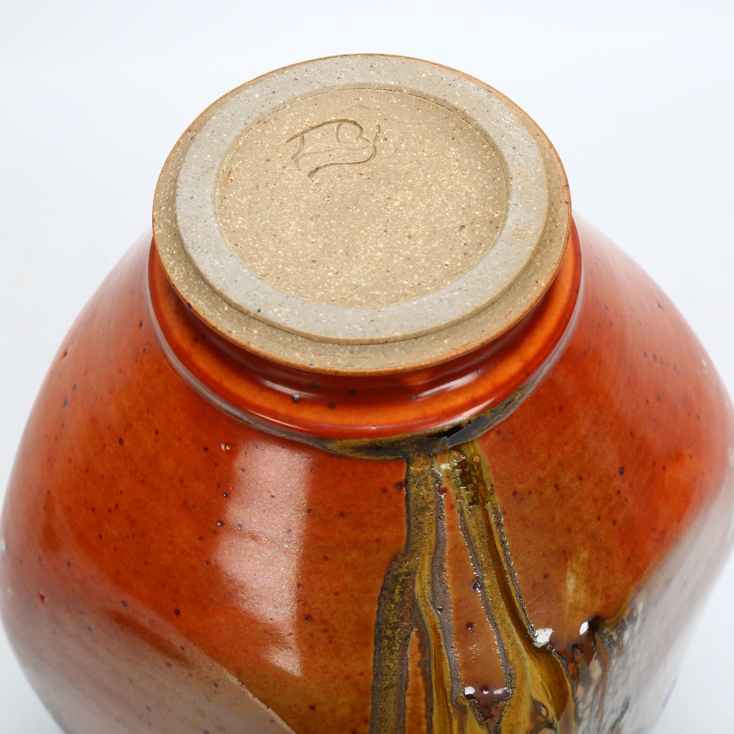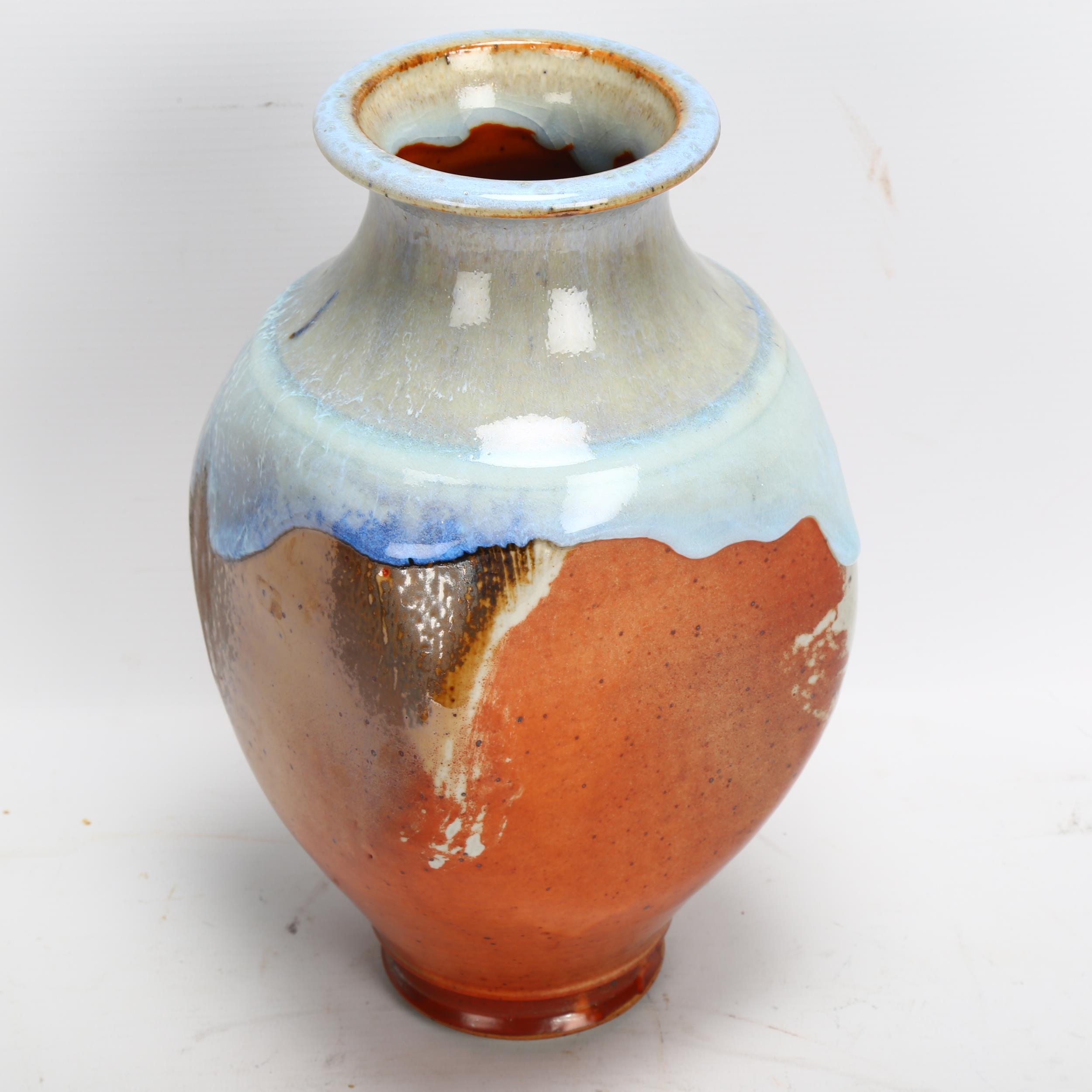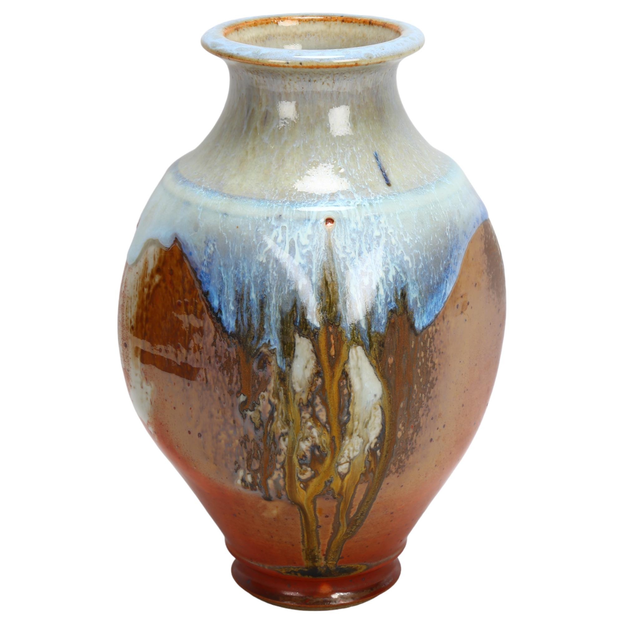 A studio pottery vase of panelled baluster form with dripping glazes, impressed makers marks, height 26cm