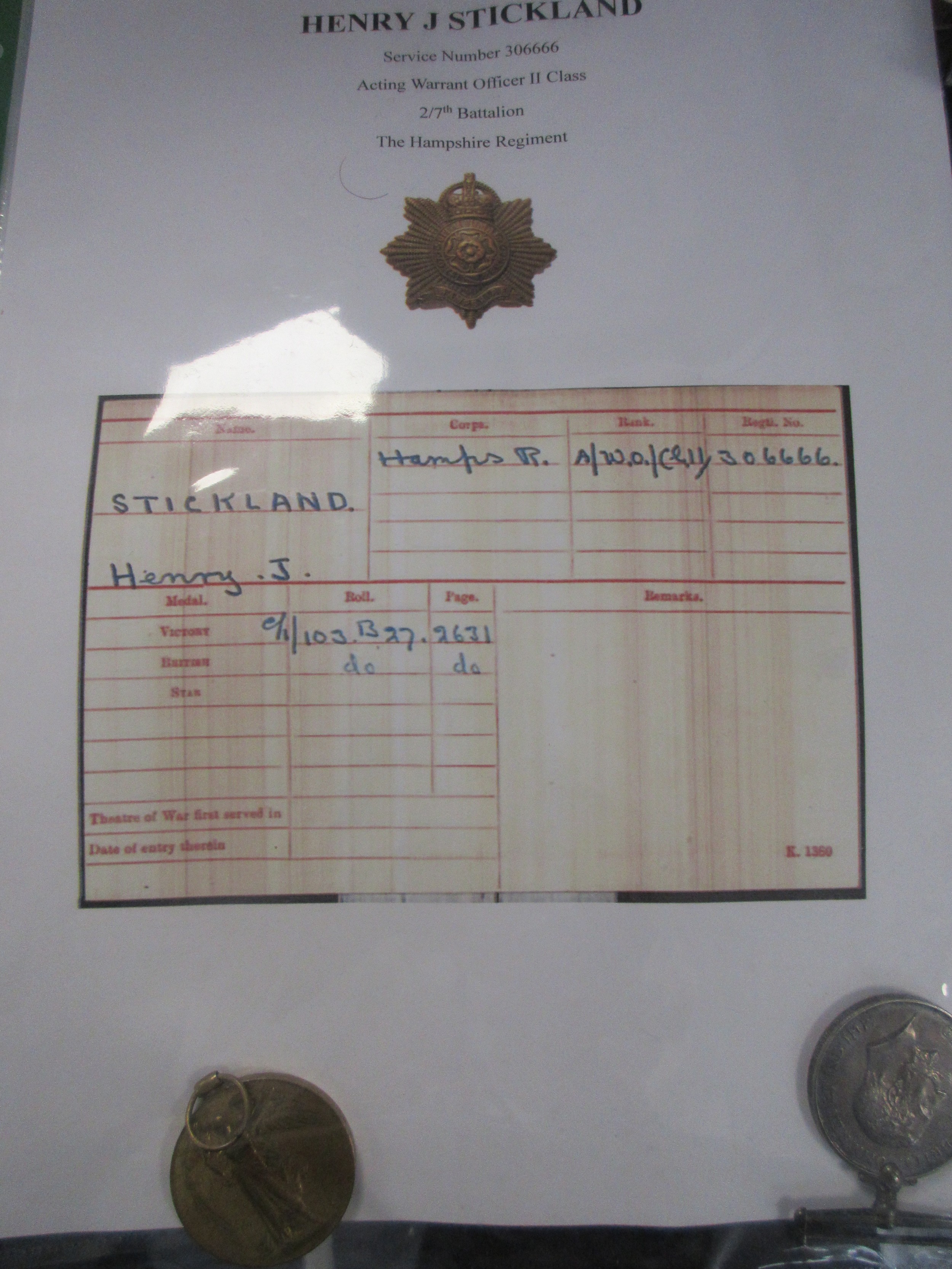 A WW1 Medal Pair awarded to 306666 Acting WO2 Henry Stickland, Hampshire Regiment comprising British War Medal and Victory Medal, both correctly inscribed, no ribbons