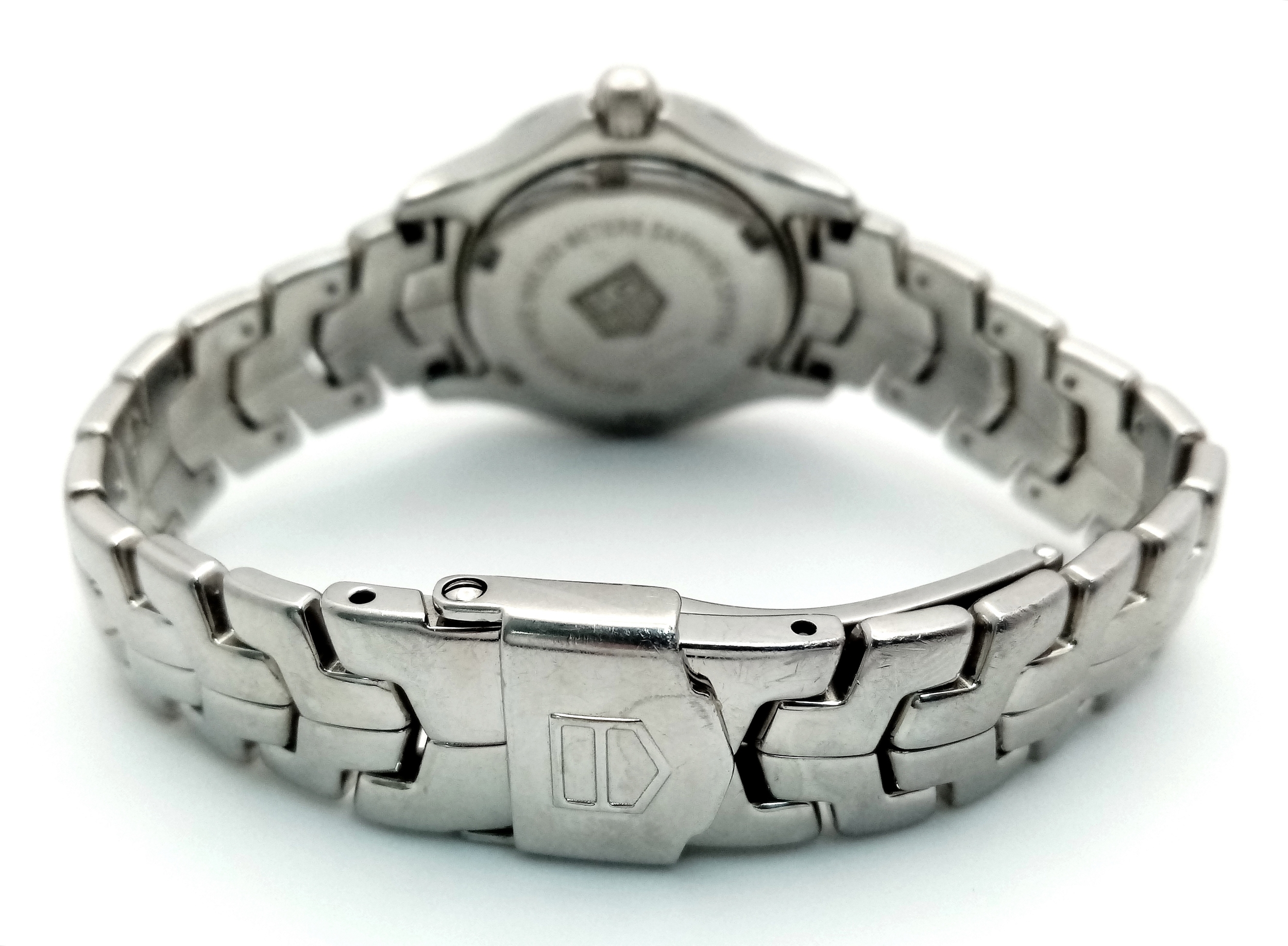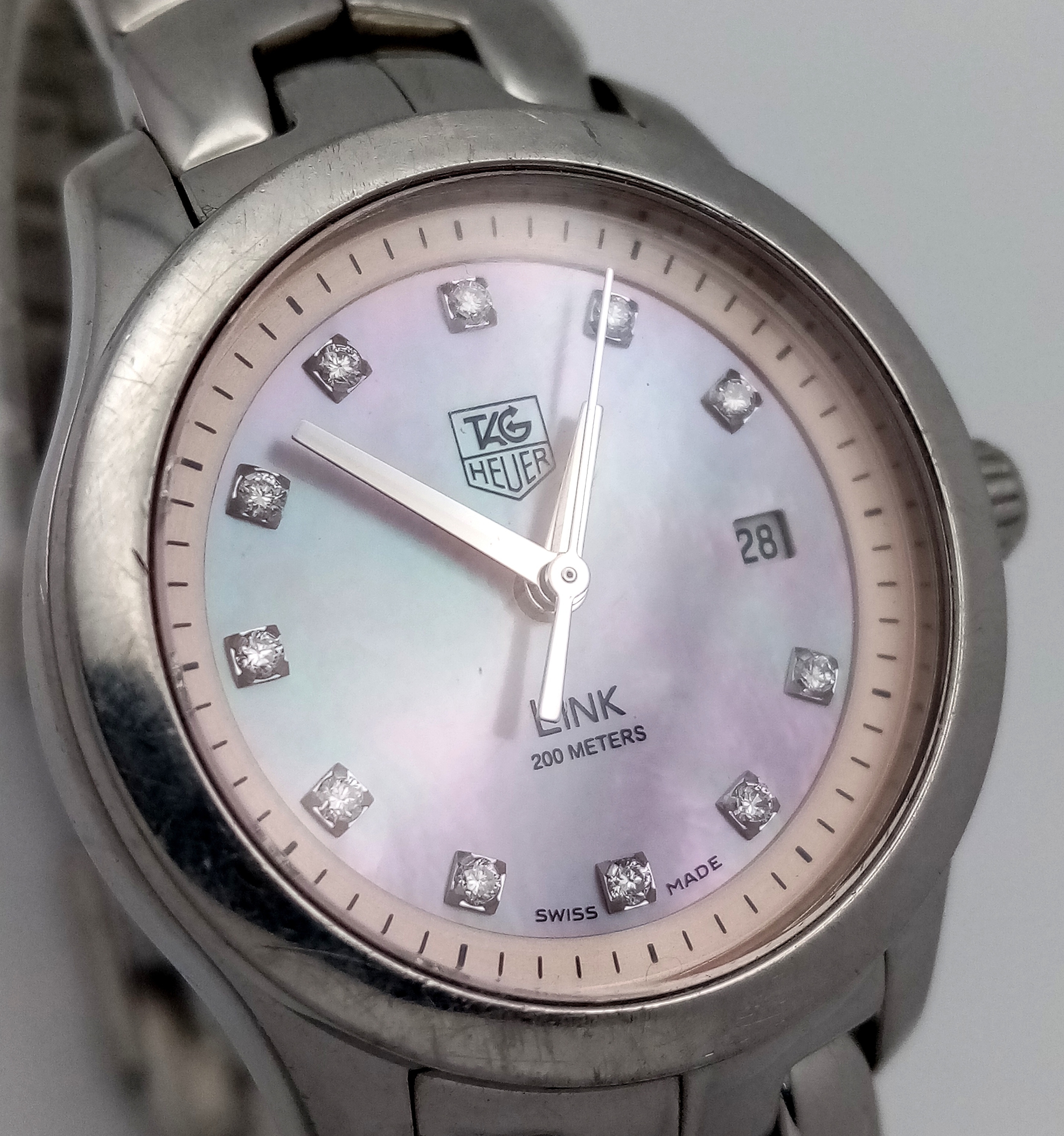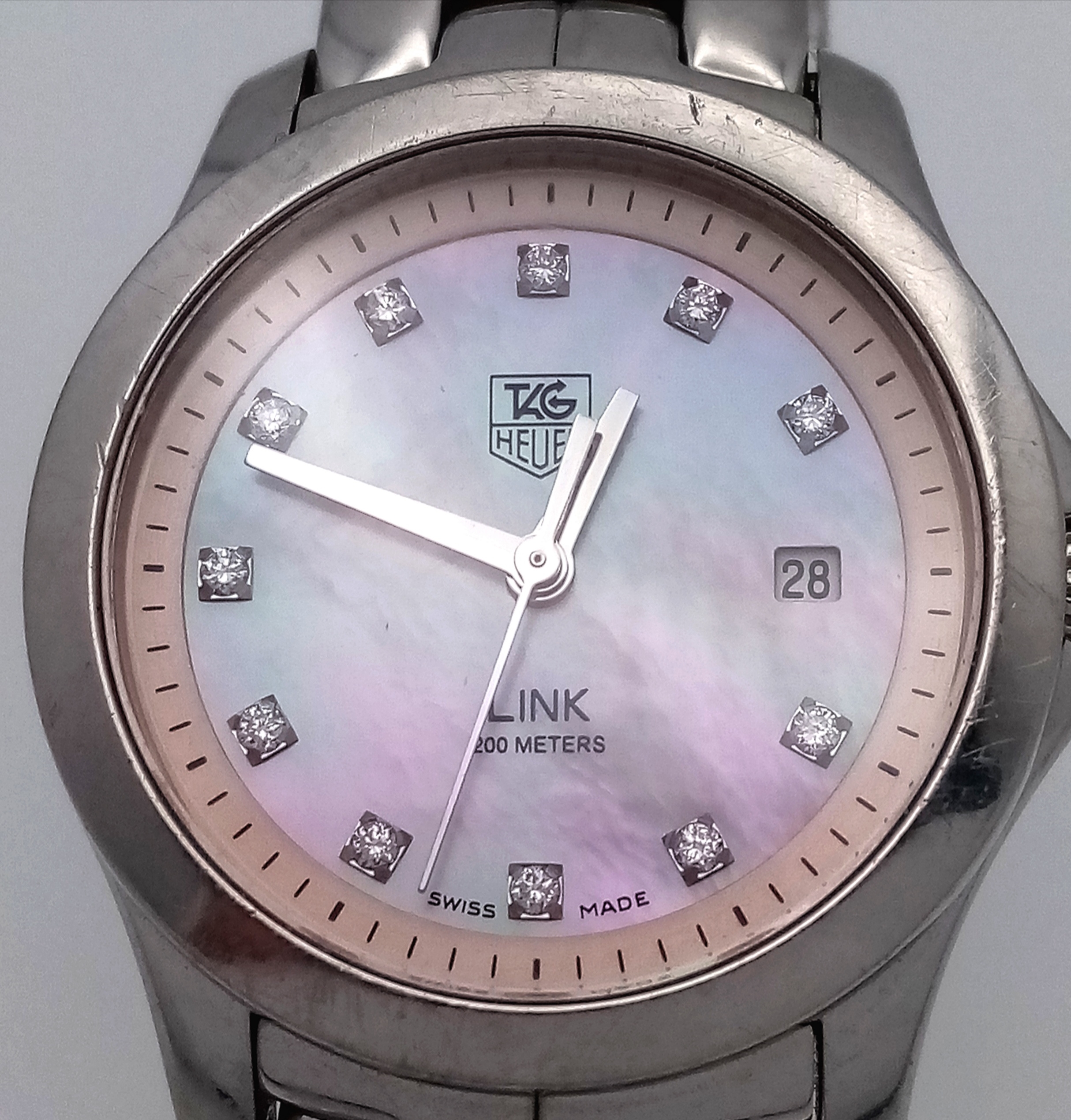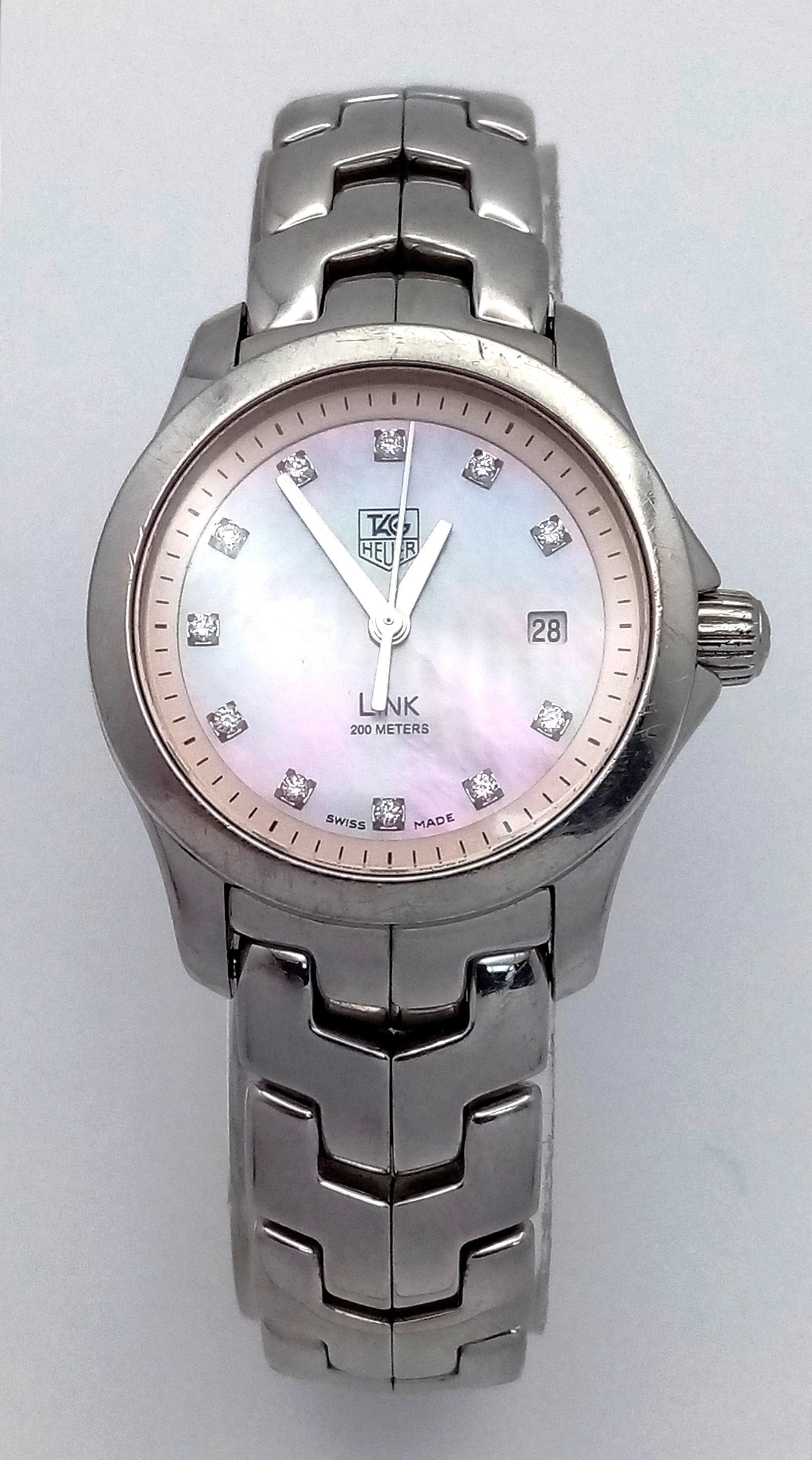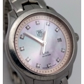 A Tag Heuer Link Mother of Pearl Ladies Quartz Watch. Model - WJFT31B. Stainless steel bracelet and case - 28mm. Pink dial with diamond markers. In working order. Comes with a WCSA report. STK025389