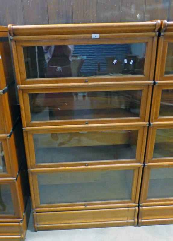EARLY 20TH CENTURY OAK 4 TIER SECTIONAL BOOKCASE WITH 4 GLASS PANEL DOORS. MARKED 'THE GLOBE - WERNICKE CO, LONDON '. WIDTH 86 CM X HEIGHT 147 CM