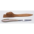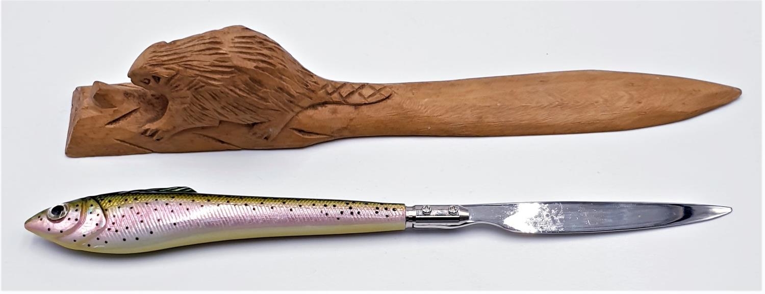 SALMON/TROUT NOVELTY FISHING LETTER OPENER TOGETHER WITH A WOODEN CARVED BEAVER EXAMPLE