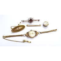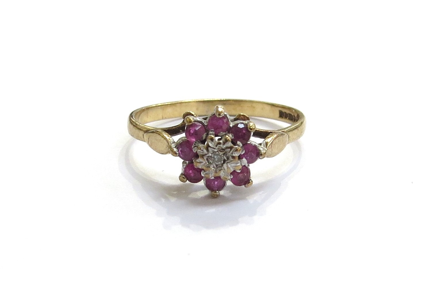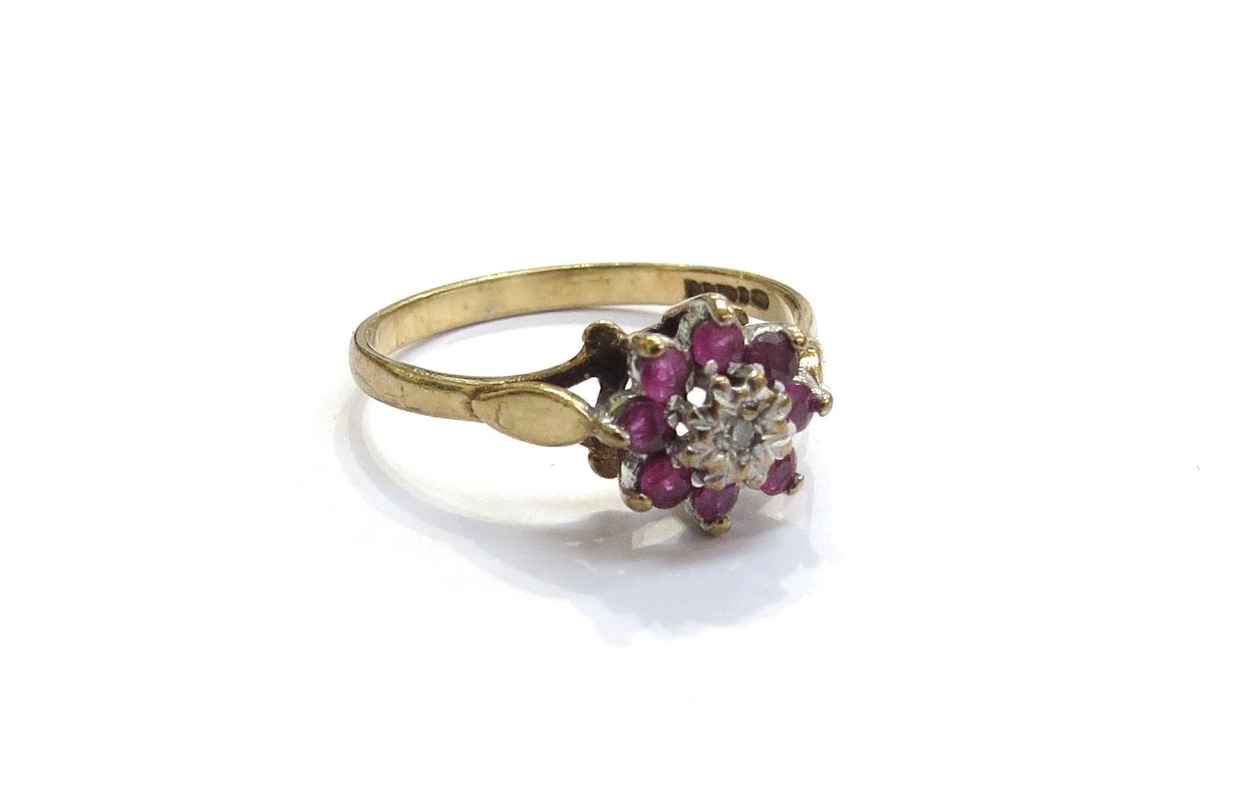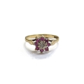 A 9ct gold small diamond and ruby floral cluster ring. Size K/L, 1.5g